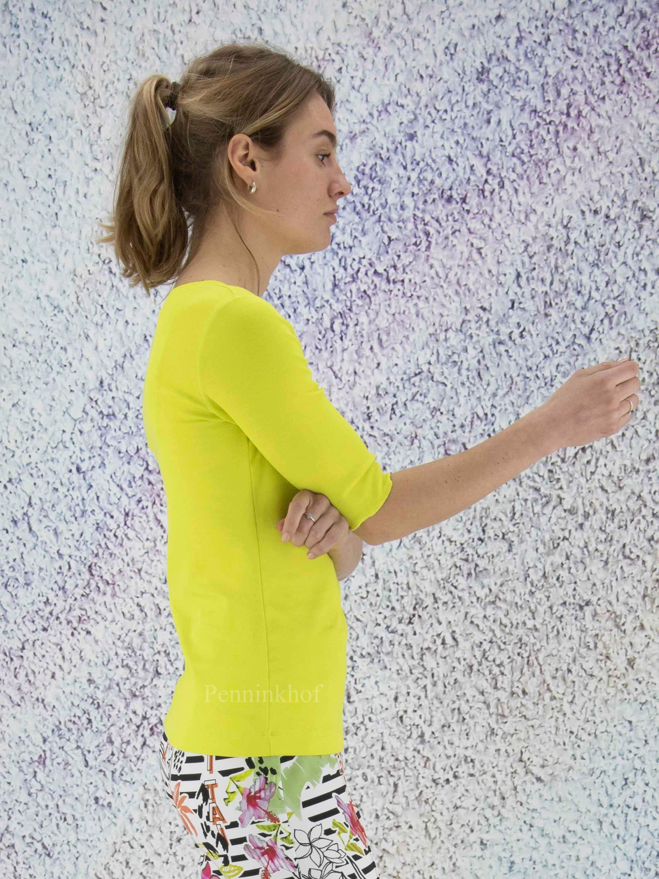 Ein limettengrünes Shirt der Designermode von Marc Cain. Das Shirt hat einen Rundhalsausschnitt und kurze Ärmel mit Umschlag. Dieses Shirt kann bei 30 Grad gewaschen werden.