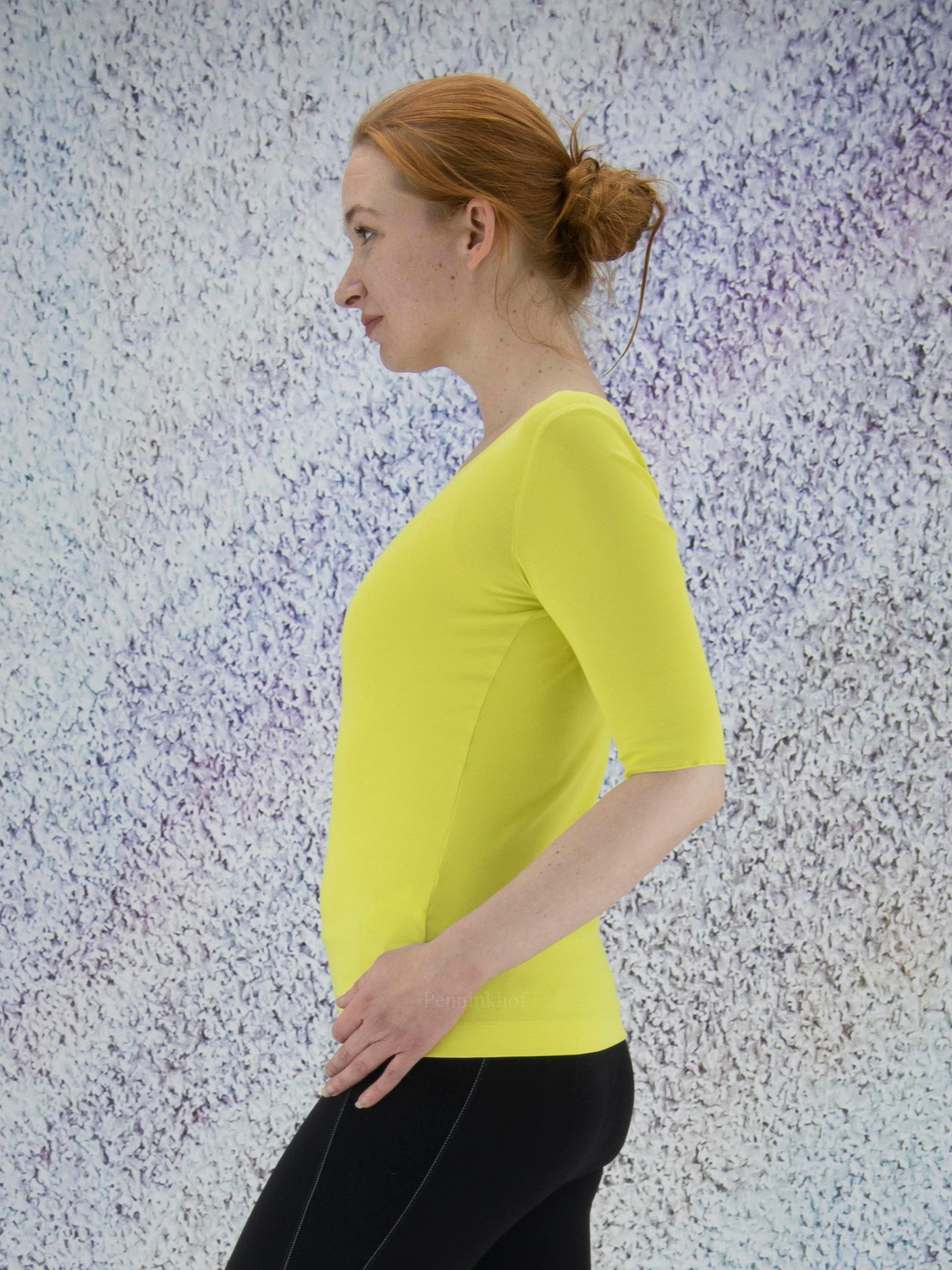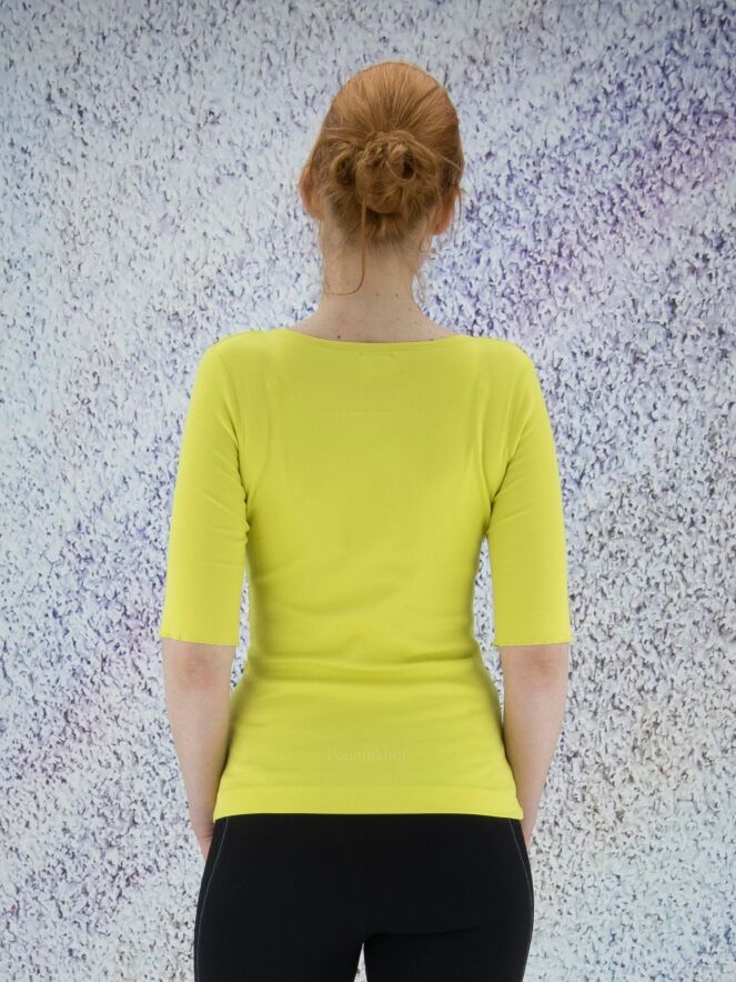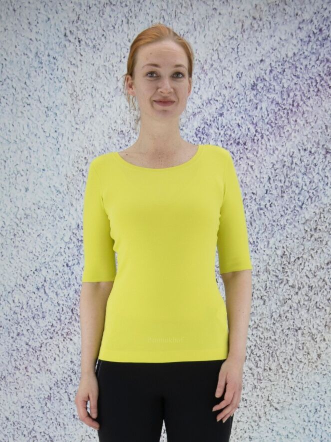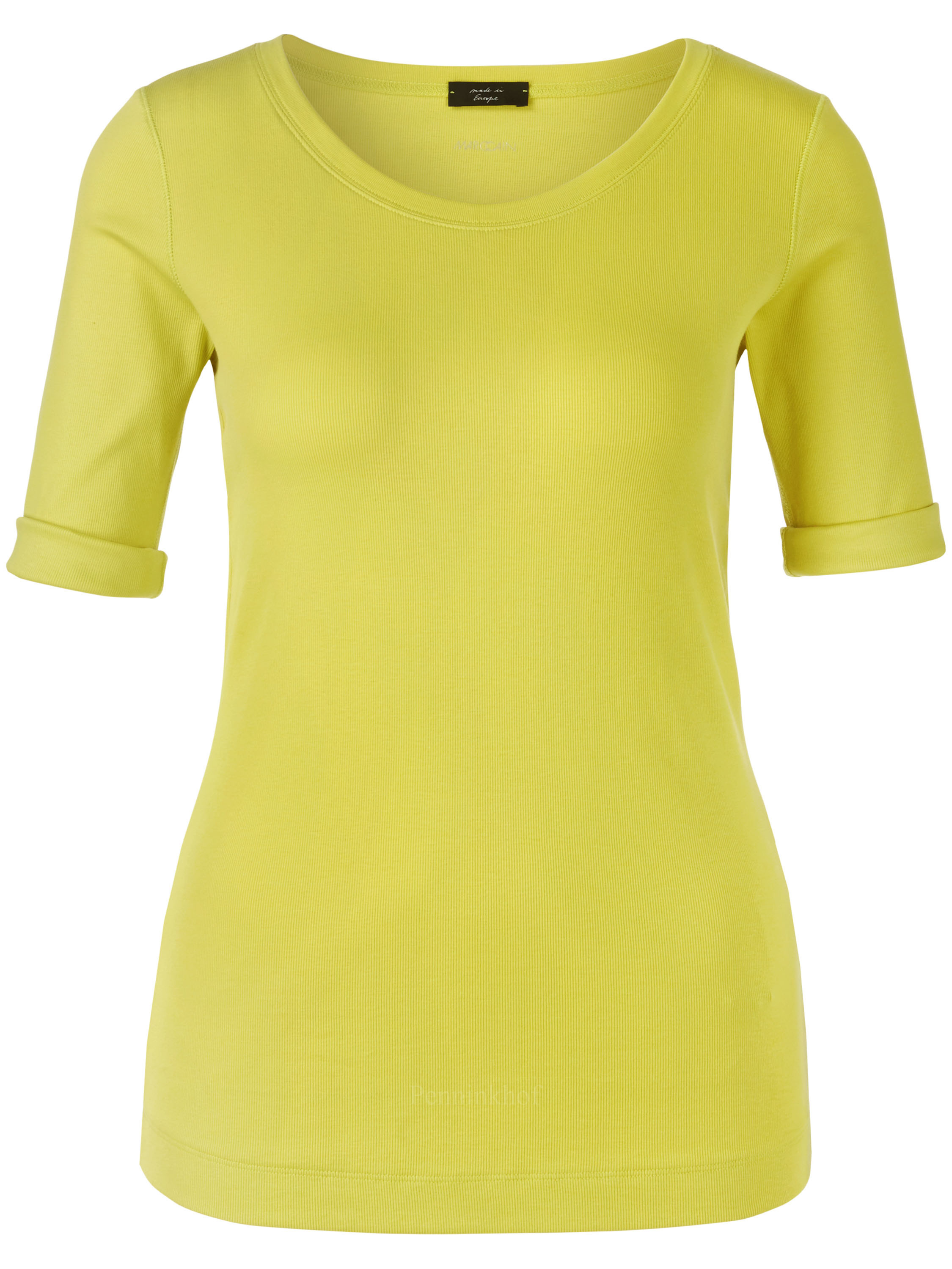 Ein Feinripp-Shirt der Designermode von Marc Cain in Limettengelb. Das Shirt hat einen Rundhalsausschnitt. Die kurzen Ärmel sind mit einem Umschlag versehen. Dieses Shirt kann bei 30 Grad gewaschen werden.