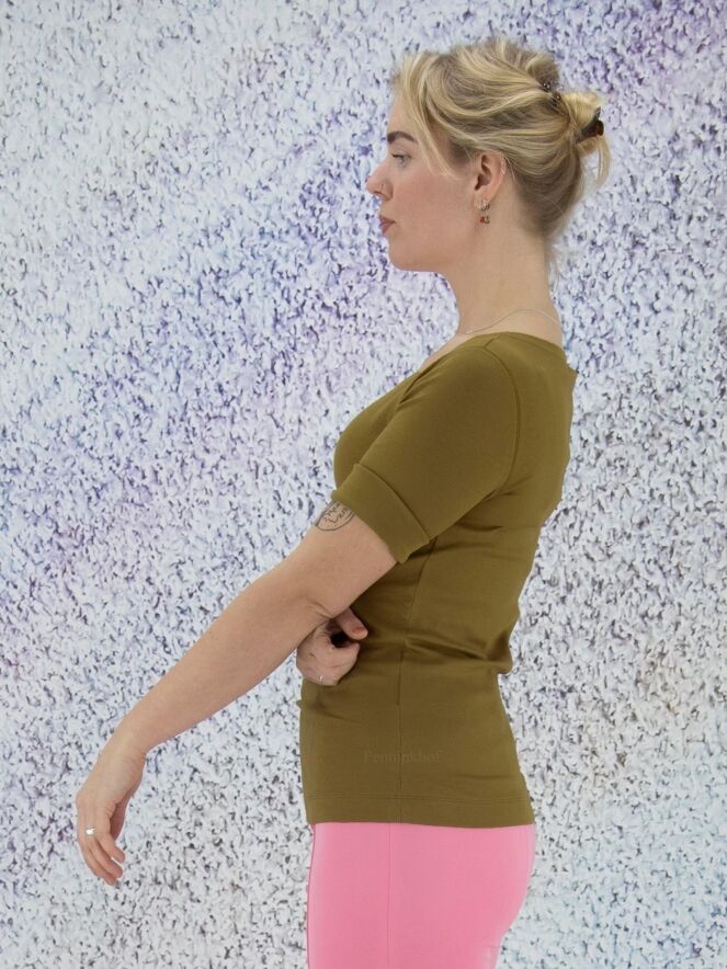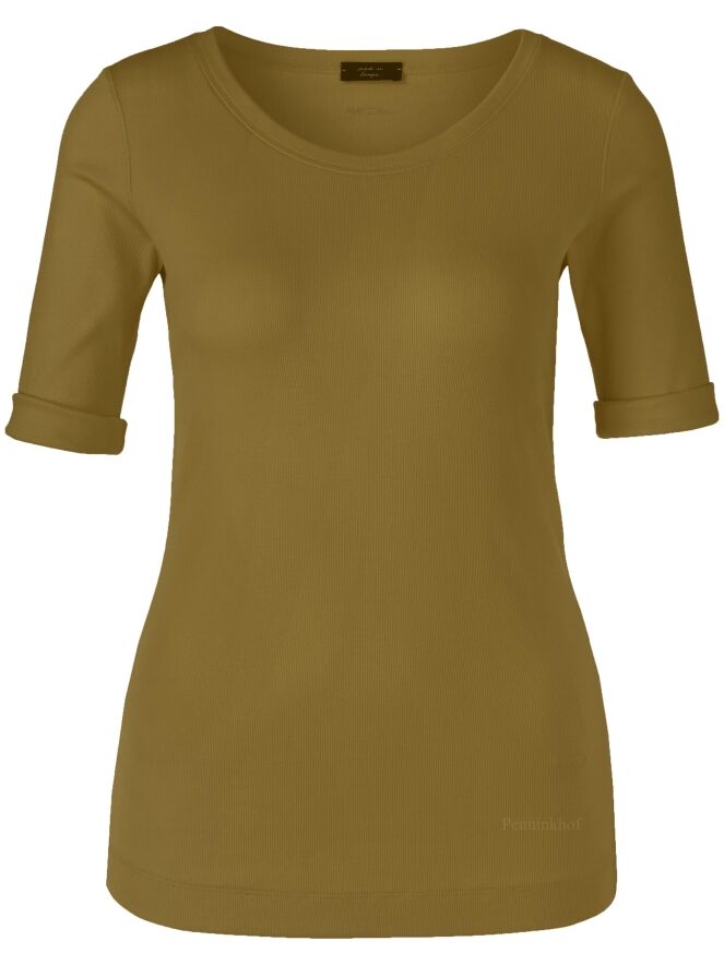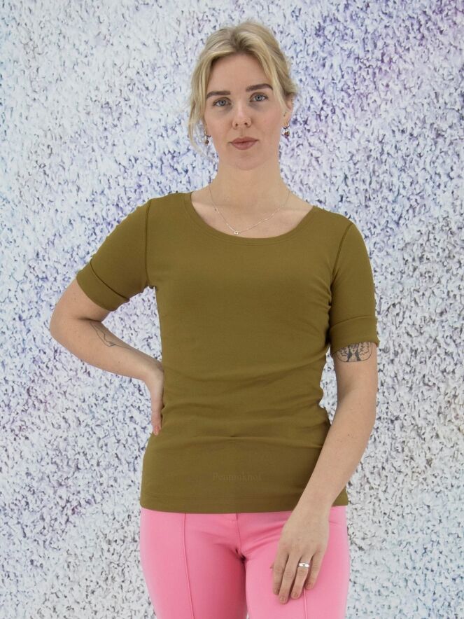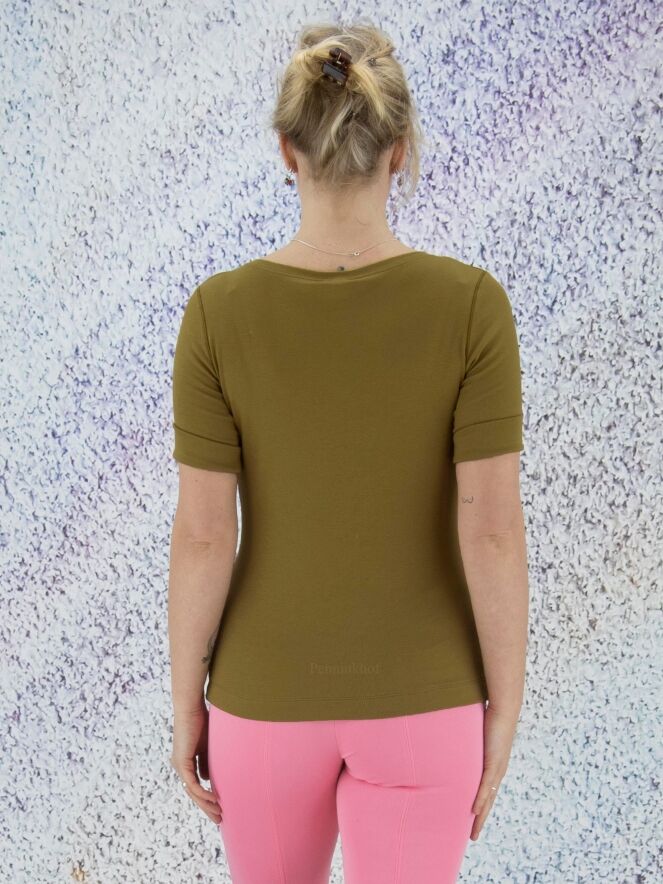 Ein olivgrünes Shirt der Designermode von Marc Cain. Das Shirt hat einen Rundhalsausschnitt und kurze Ärmel mit Umschlag. Dieses Shirt kann bei 30 Grad gewaschen werden.