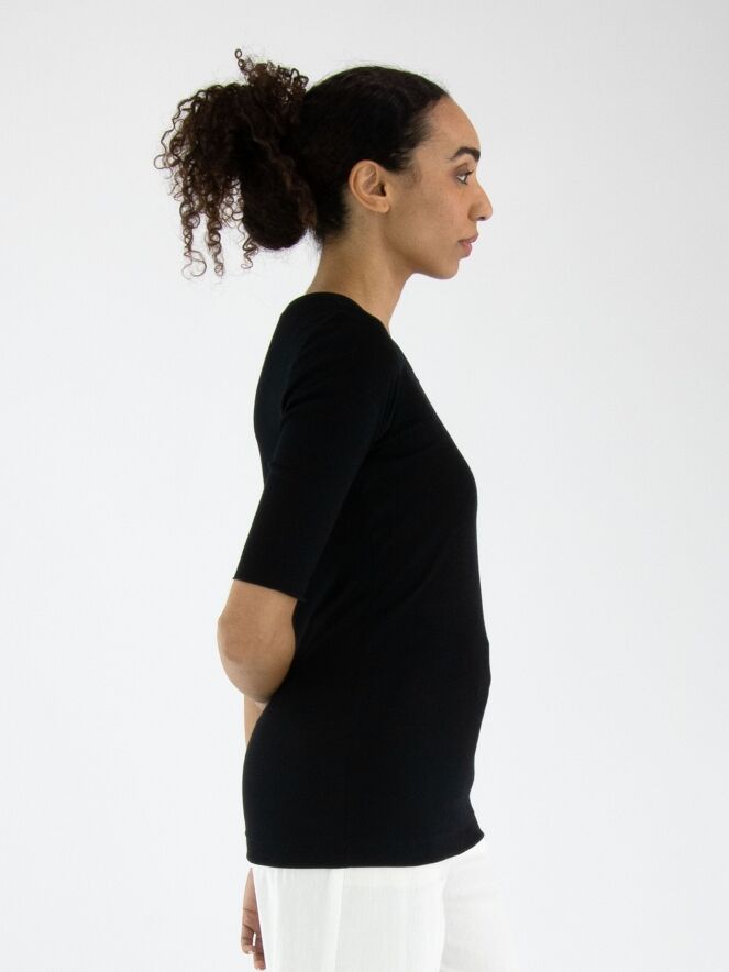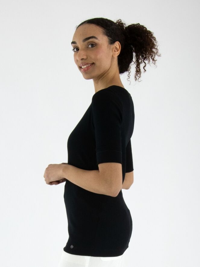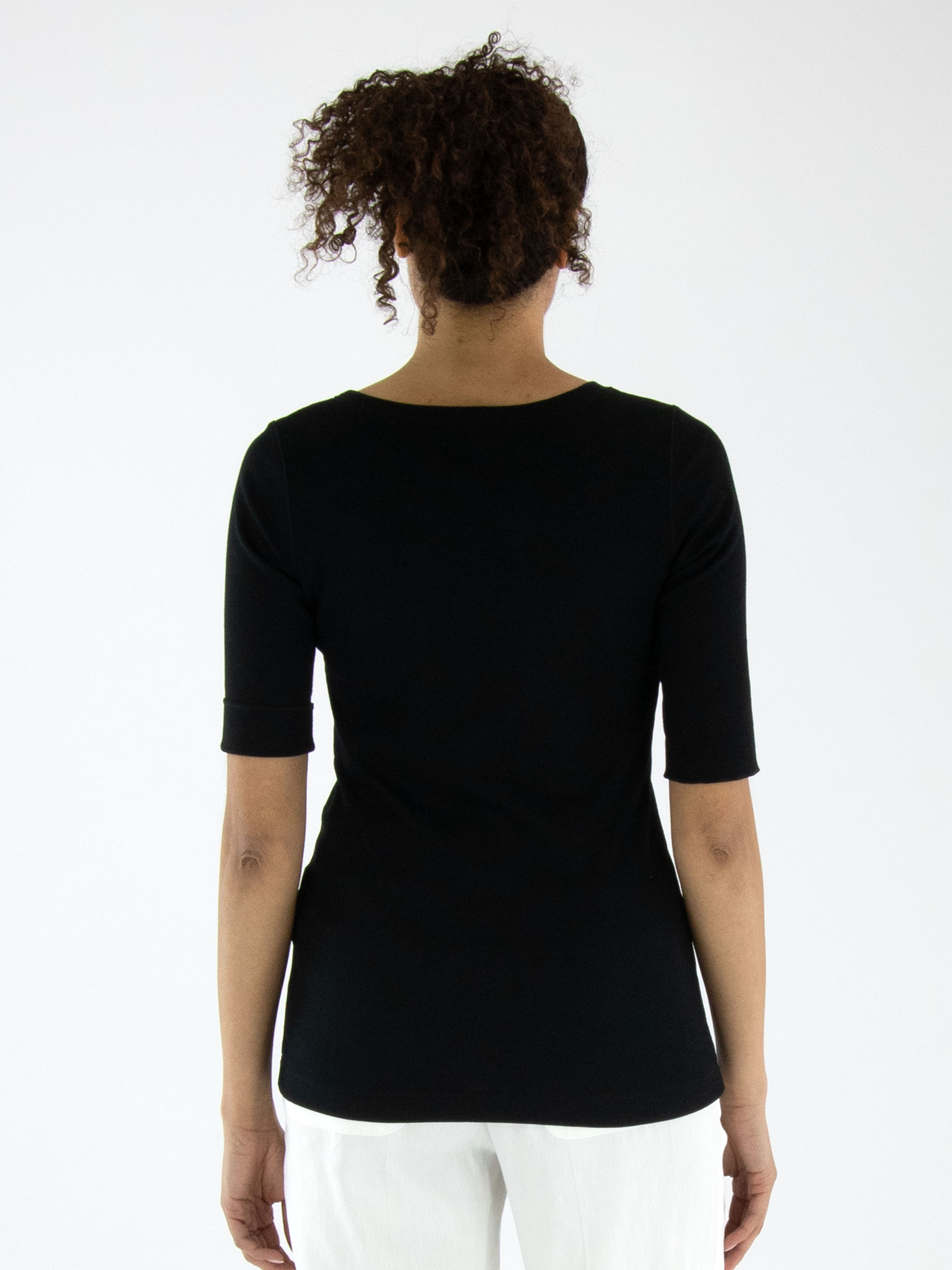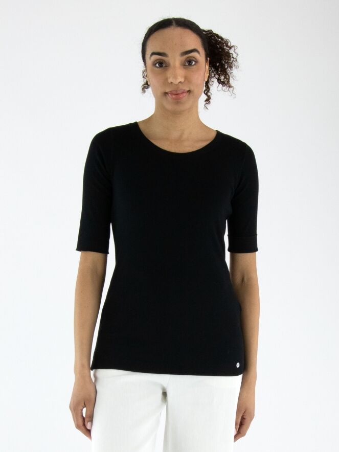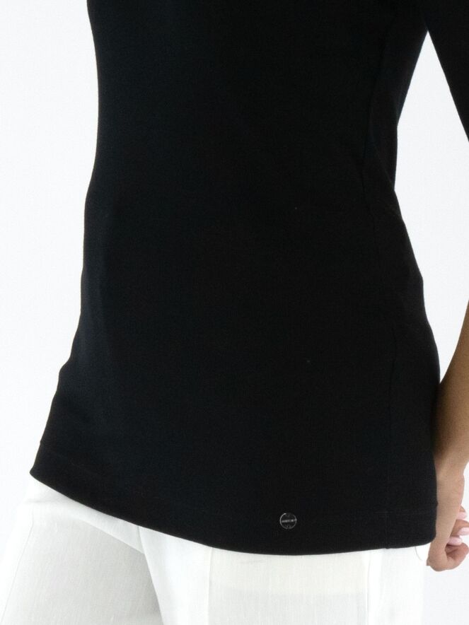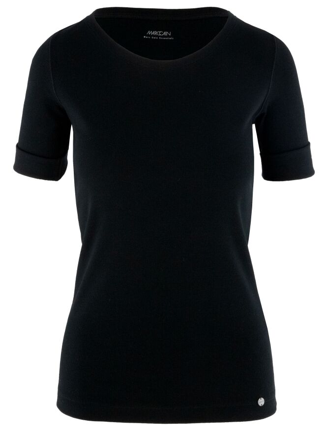 Ein Shirt von Marc Cain in Schwarz. Die kurzen Ärmel haben einen Umschlag. Das Shirt hat einen Rundhalsausschnitt und kann bei 30 Grad gewaschen werden.