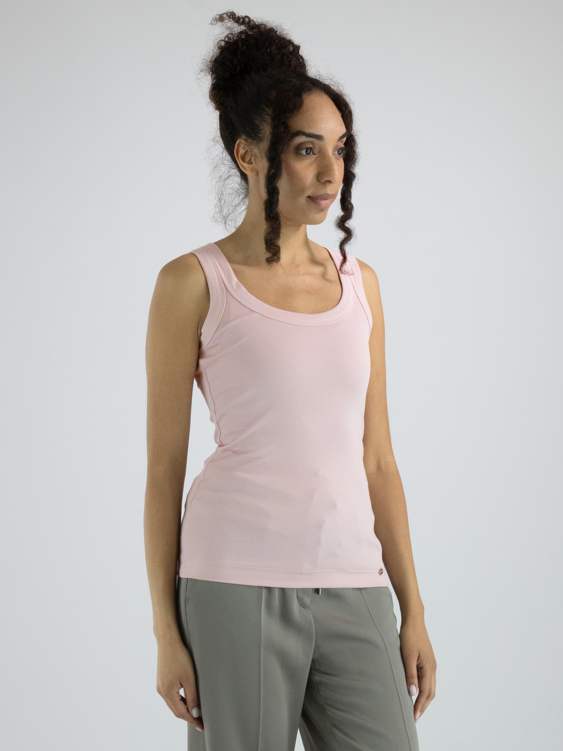 Ein rosa Top von Marc Cain. Das Top hat einen runden Halsausschnitt und der Stoff ist fein gerippt. Dieses Top kann bei 30 Grad gewaschen werden.