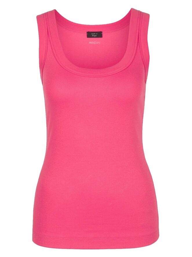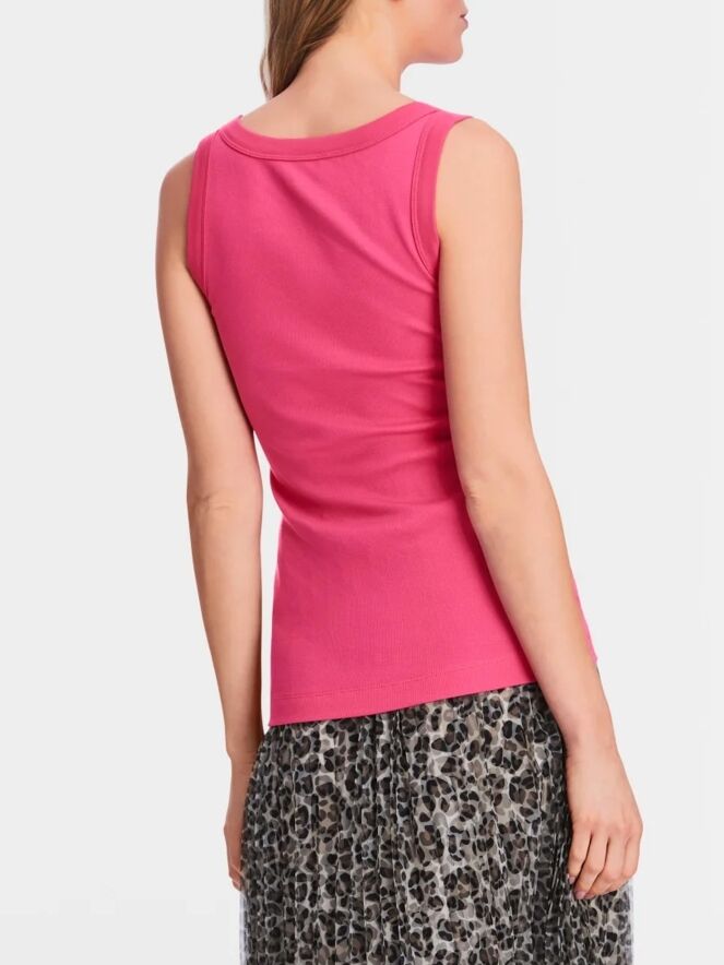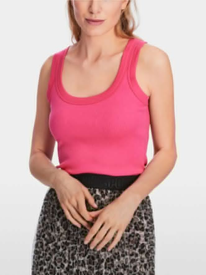 Ein Top von Marc Cain in Pink. Das Top hat einen runden Ausschnitt und der Stoff ist fein gerippt. Dieses Top kann bei 30 Grad gewaschen werden.