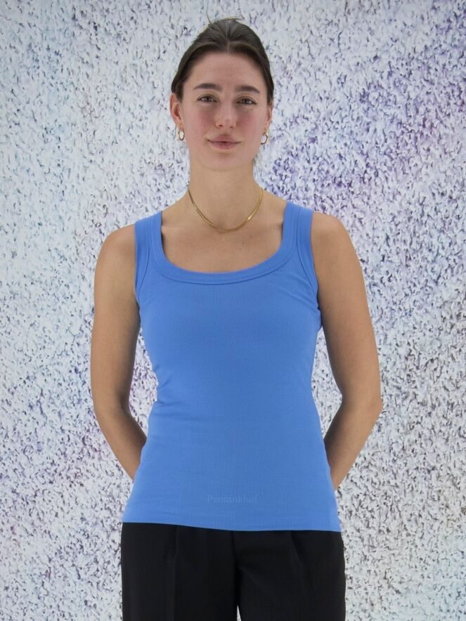 Ein blaues Top der Designermode von Marc Cain. Das Top hat einen Rundhalsausschnitt und kann bei 30 Grad gewaschen werden.