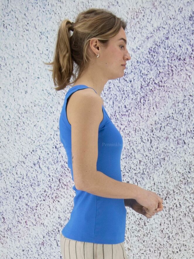 Ein blaues Top der Designermode von Marc Cain. Das Top hat einen Rundhalsausschnitt und kann bei 30 Grad gewaschen werden.