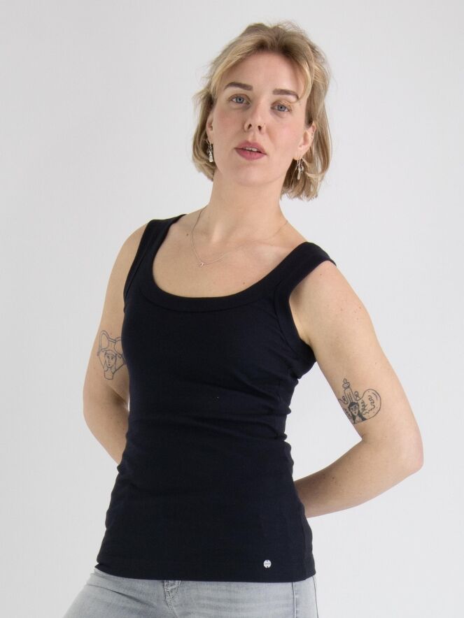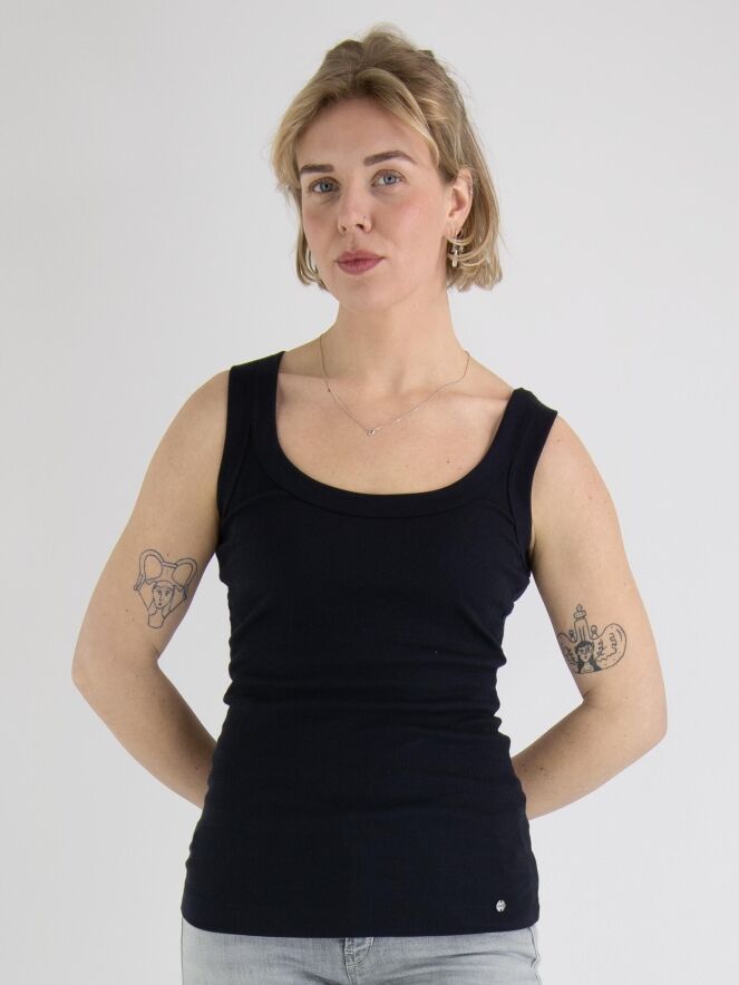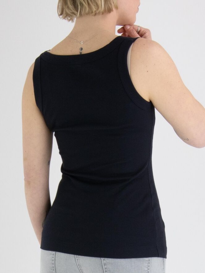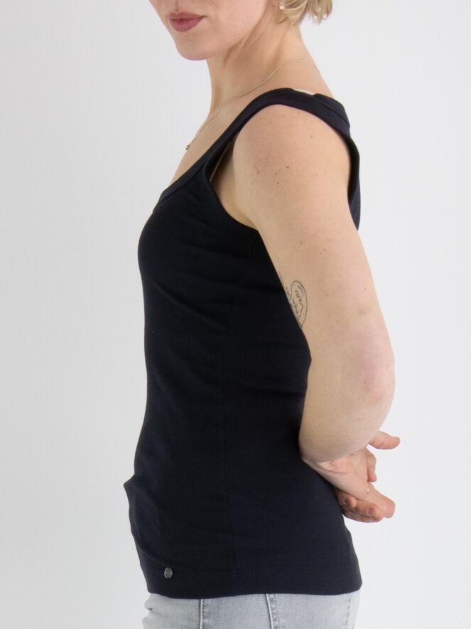 Marineblaues Basic-Top der Designermodemarke Marc Cain essentiels. Das leicht taillierte Top hat einen runden Halsausschnitt, 3 cm breite Träger und kann auf 30 Grad in der Waschmaschine gewaschen werden.