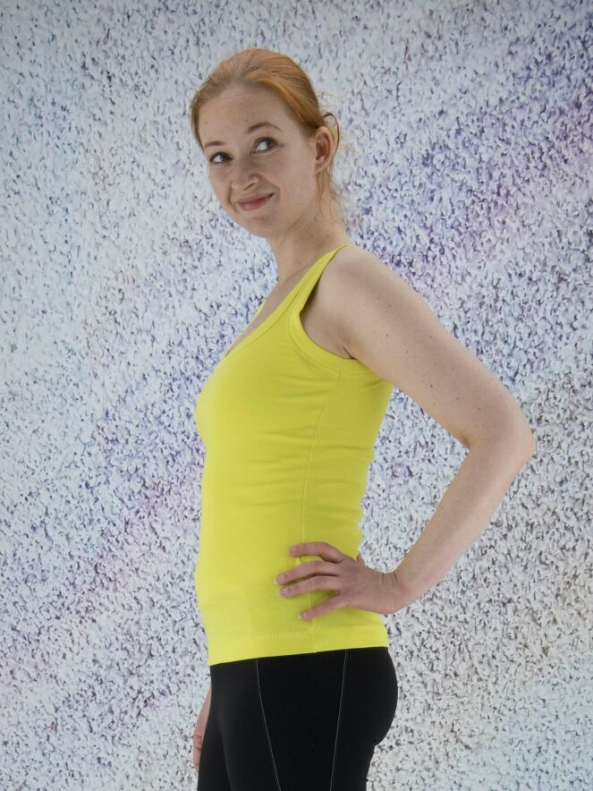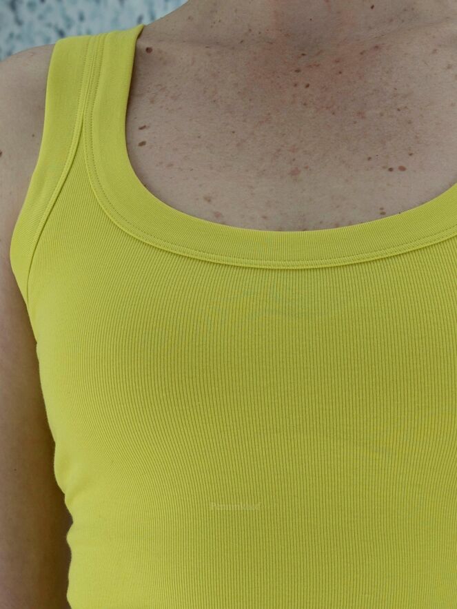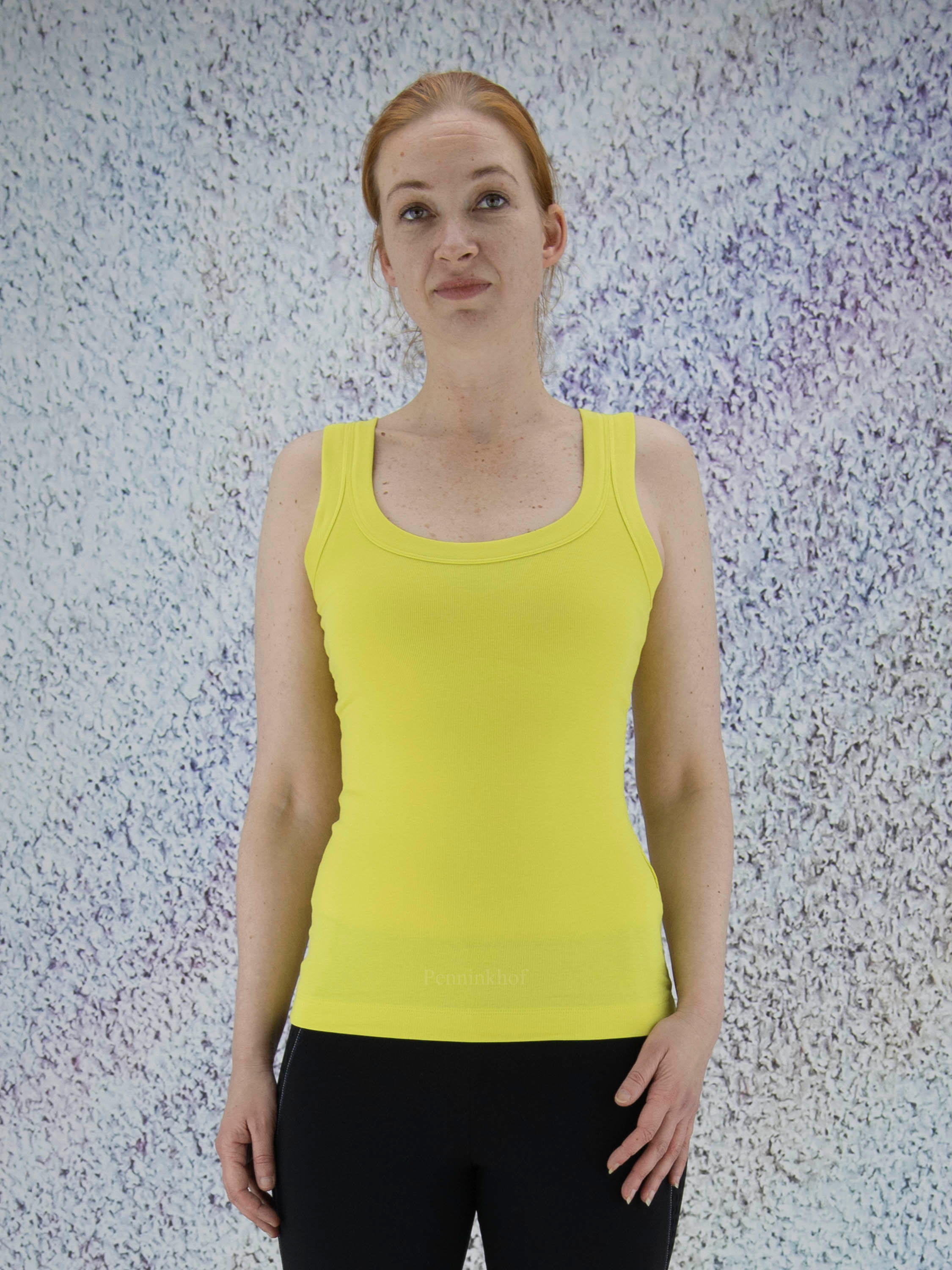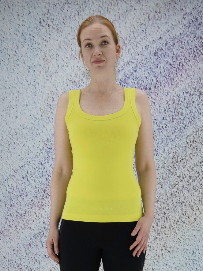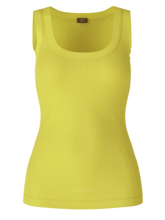 Ein Top der Designermode von Marc Cain in Limettengelb. Das Top hat einen Rundhalsausschnitt und kann bei 30 Grad gewaschen werden.