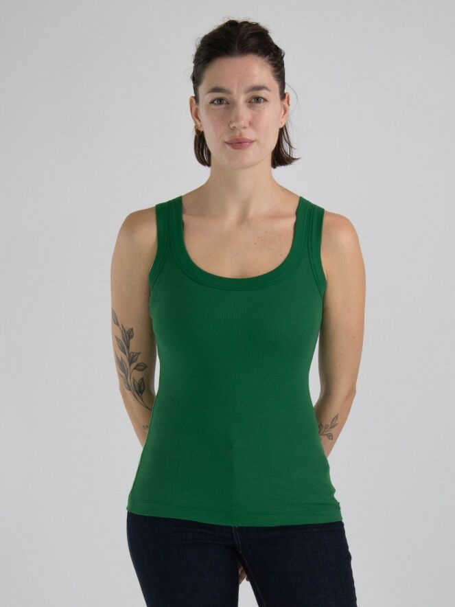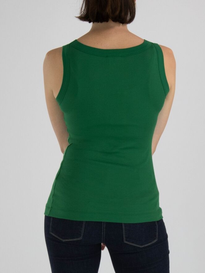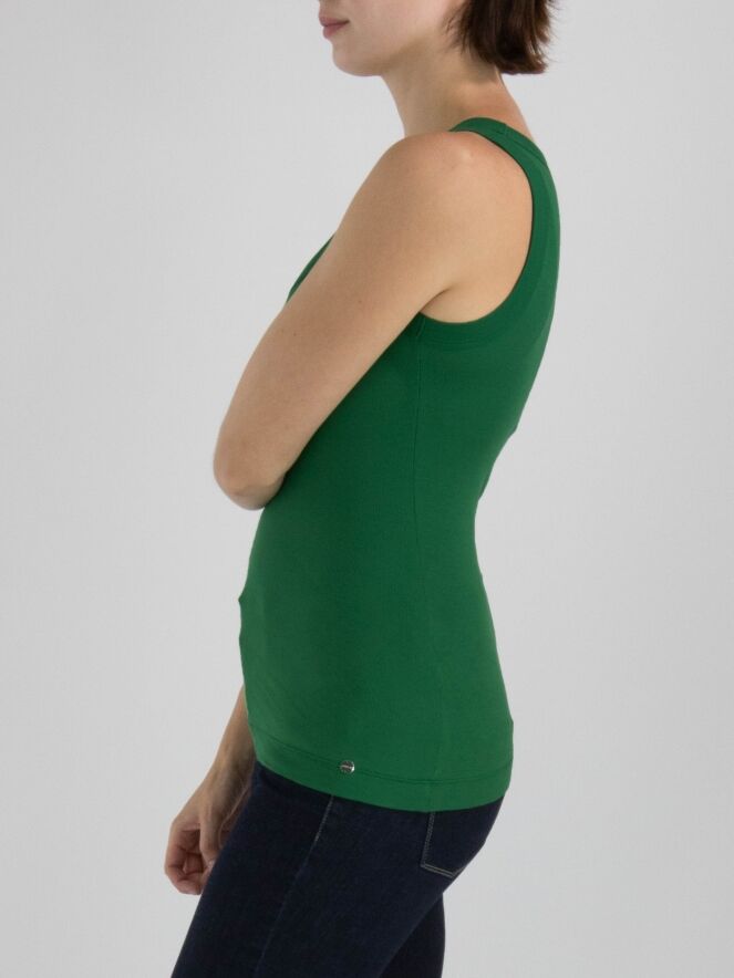 Ein Top von Marc Cain in der Farbe dunkelgrün. Das Top hat einen runden Ausschnitt und der Stoff ist fein gerippt. Dieses Oberteil kann bei 30 Grad gewaschen werden.