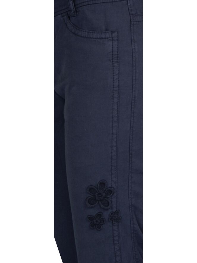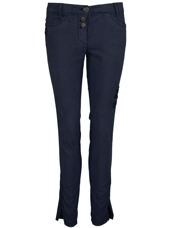 Marineblaue Hose der Designermode von Marc Cain. Die Hose ist aus einem Sommer-Baumwollstoff hergestellt. Die Hose wird in der Mitte mit Knöpfen geschlossen. Die linke Seite wird von aufgestickten Blumen in derselben Farbe wie die Hose verziert. Diese Stoffhose kann auf 30 Grad in der Waschmaschine gewaschen werden.