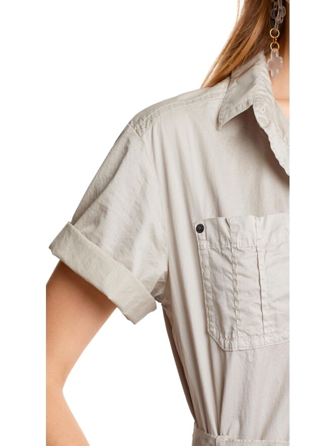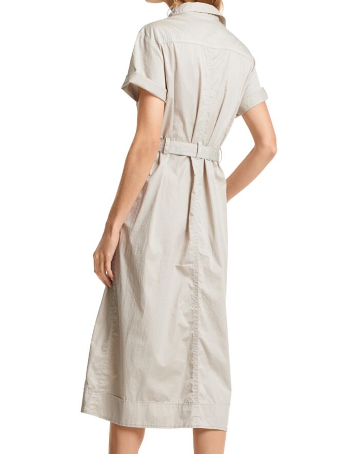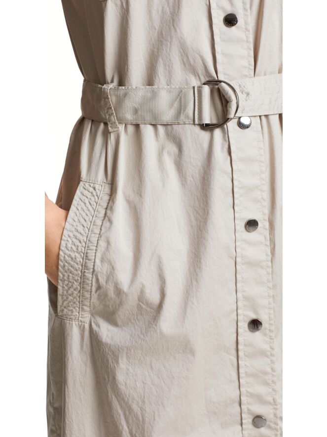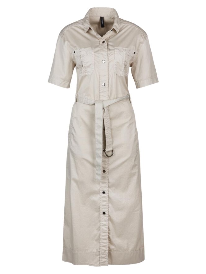 Sandfarbenes Kleid der Designermode von Marc Cain. Das Kleid wird an der Vorderseite mit Druckknöpfen geschlossen. Das Kleid verfügt über Seitentaschen und ist mit einer breiten Gürtelschärpe aus demselben Material ausgestattet. Das Kleid kann bei 30 Grad in der Waschmaschine gewaschen werden.