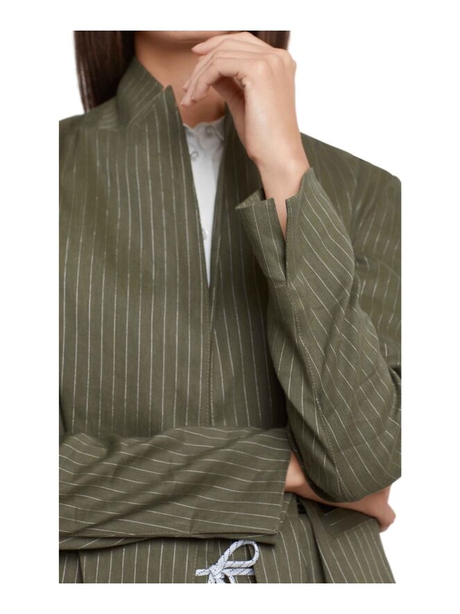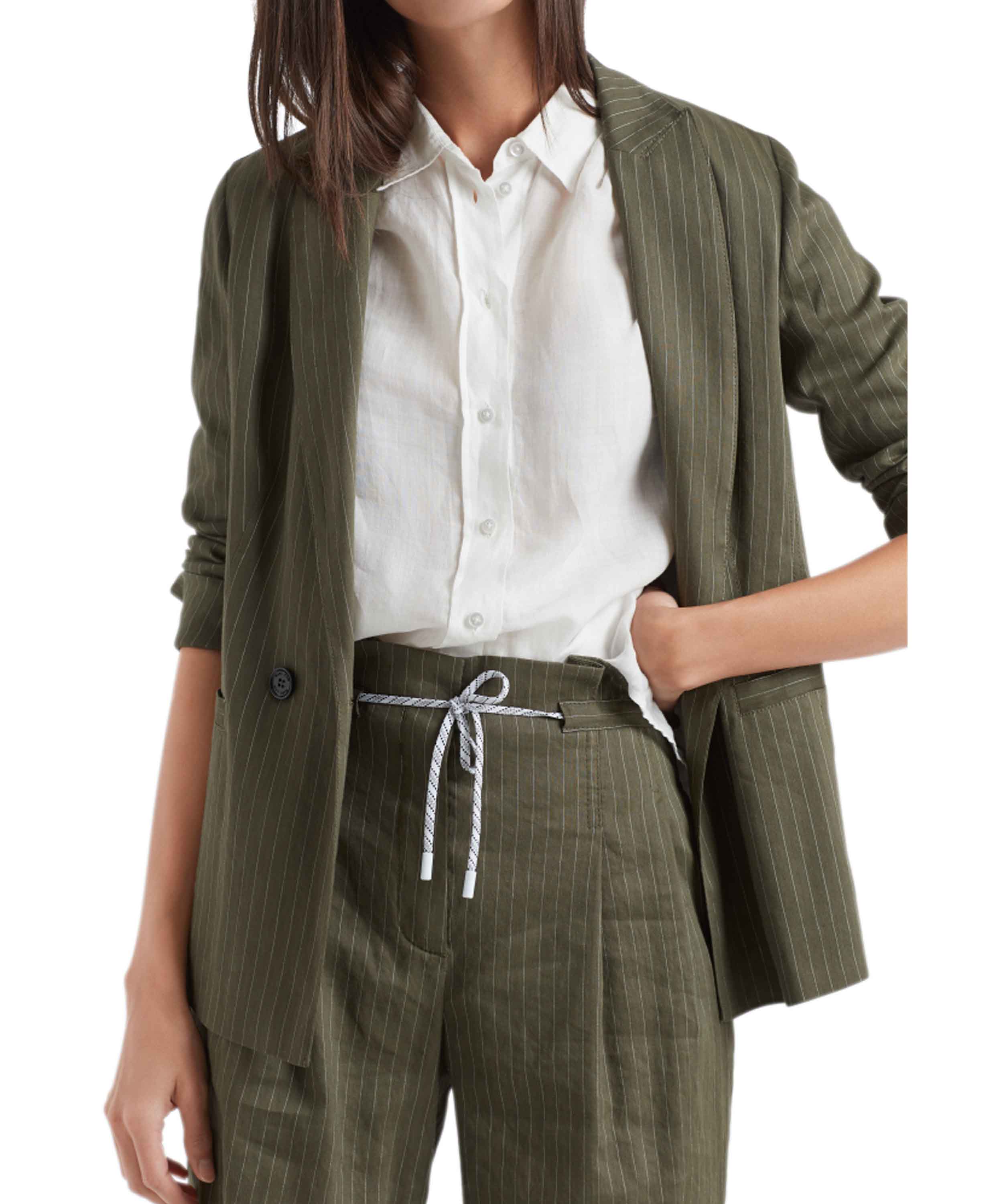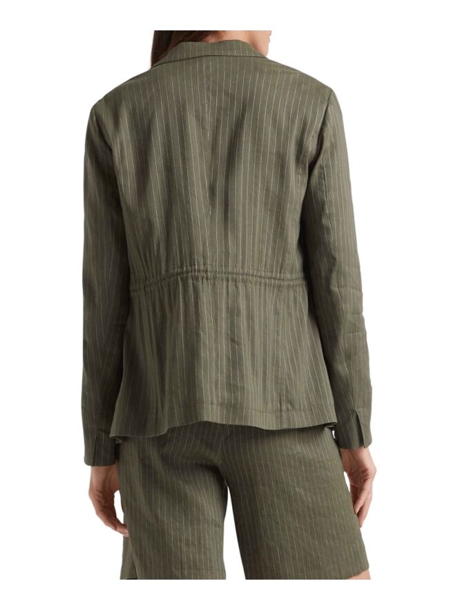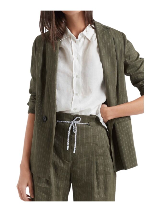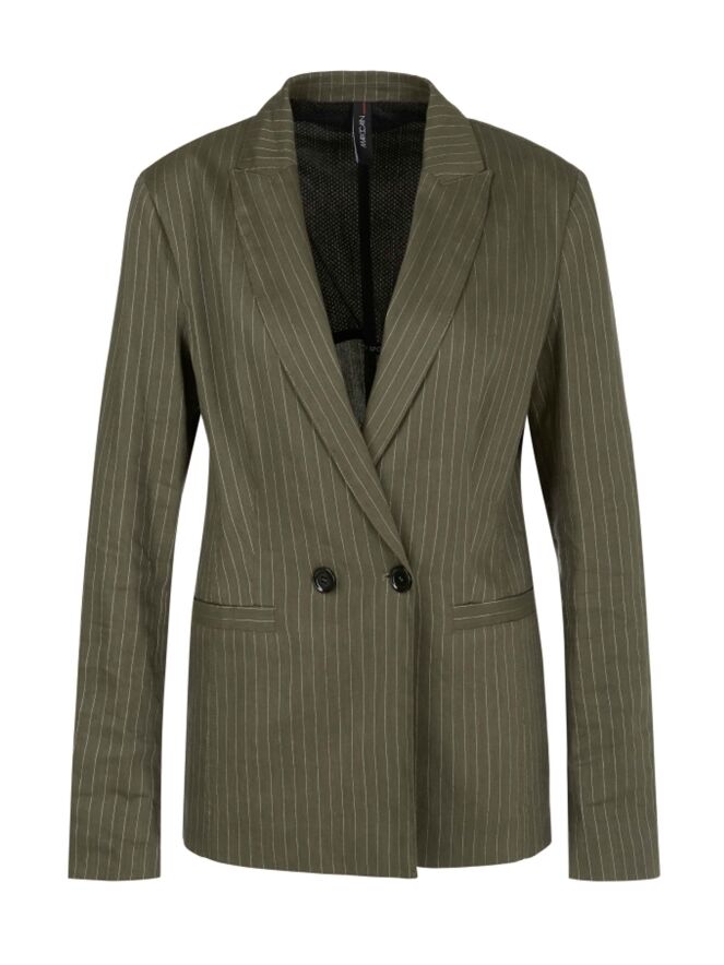 Ein zweireihiger Nadelstreifenblazer der Designermode von Marc Cain in Olivgrün und Weiß. Der Blazer ist halb gefüttert und kann bei 30 Grad gewaschen werden.