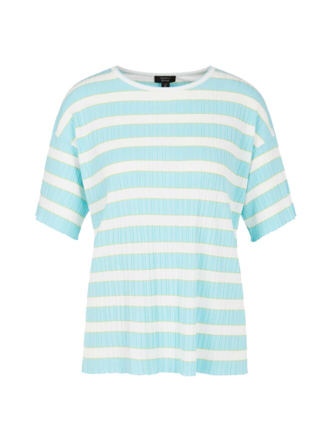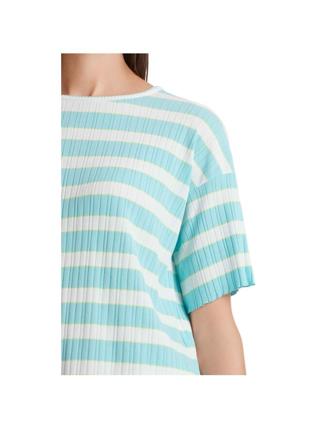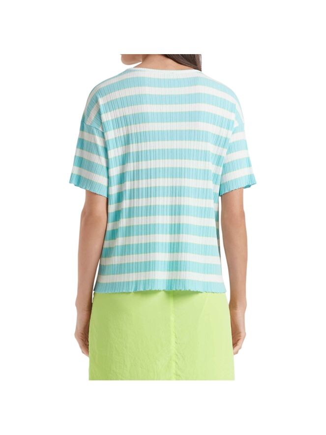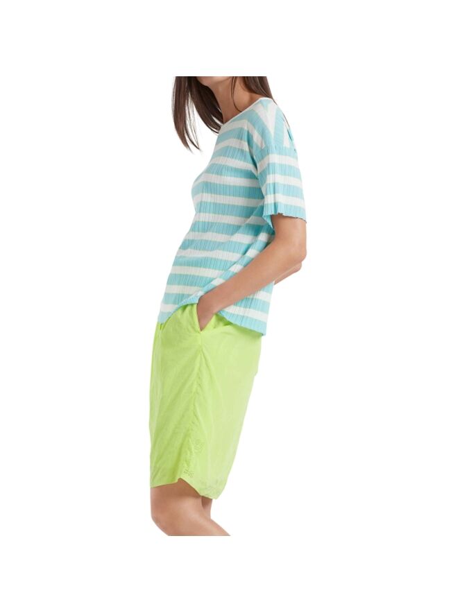 Ein Pullover der Designermode von Marc Cain mit Streifenmuster in Eisblau, Limettengrün und Weiß. Der Stoff ist mit einem eingewobenen vertikalen Streifenmuster versehen. Die Kante des Rundhalsausschnitts kommt mit einem limettengrünen Bündchen. Dieser Pullover kann bei 30 Grad gewaschen werden.