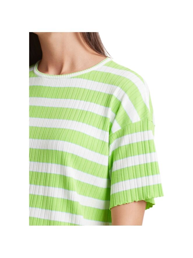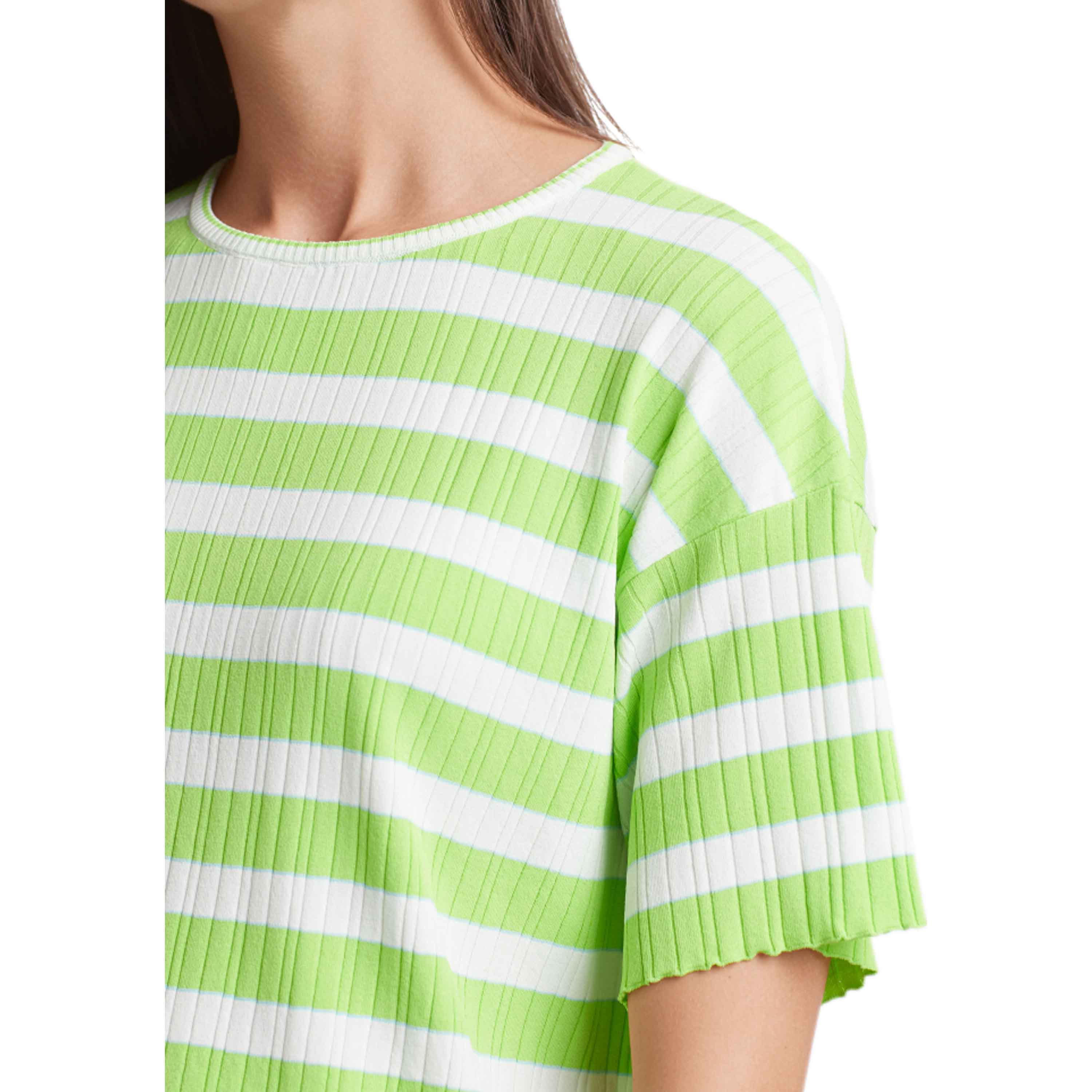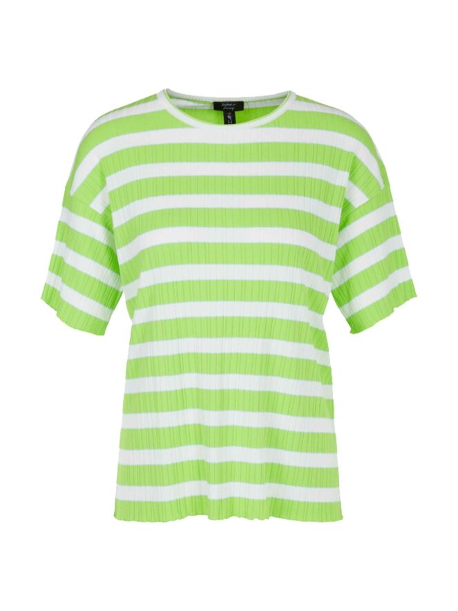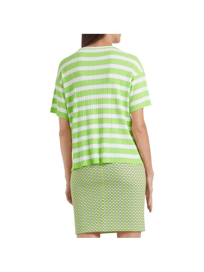 Ein Pullover der Designermode von Marc Cain in einem Streifenmuster mit den Farben Limettengrün, Eisblau und Weiß. Der Stoff ist mit einem eingewobenen vertikalen Streifenmuster versehen. Die Kante des Rundhalsausschnitts kommt mit einem limettengrün-weißen Bündchen. Dieser Pullover kann bei 30 Grad gewaschen werden.