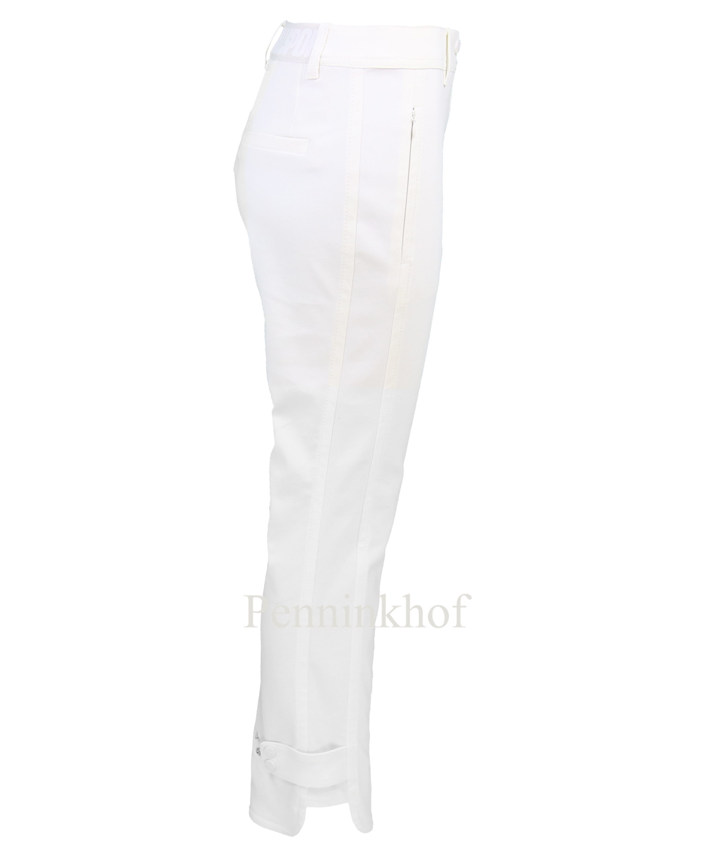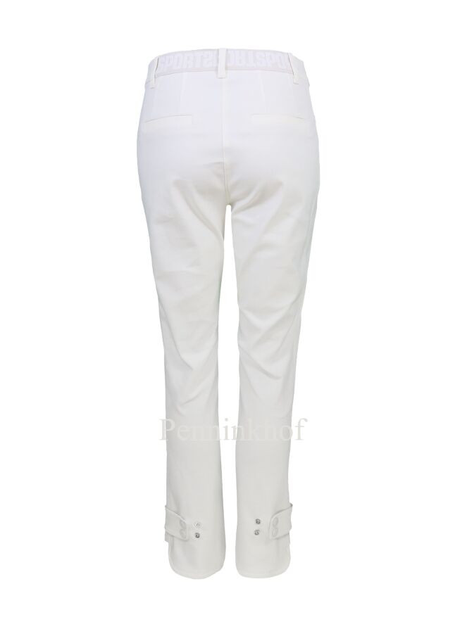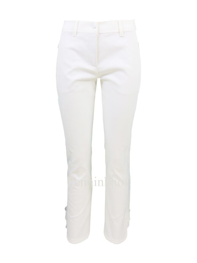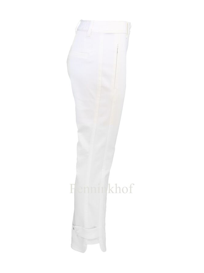 Eine cremeweiße Hose der Designermode von Marc Cain. Die Eingrifftaschen haben einen Reißverschluss. Der untere Saum der Hosenbeine wird an der Außenseite durch einen breiten kleinen Besatz mit Druckknöpfen akzentuiert. Der untere Saum ist abgerundet. Diese Hose kann bei 30 Grad gewaschen werden.