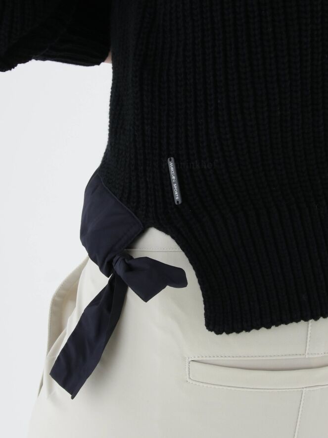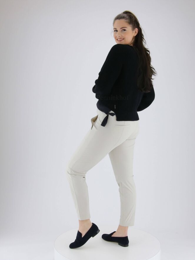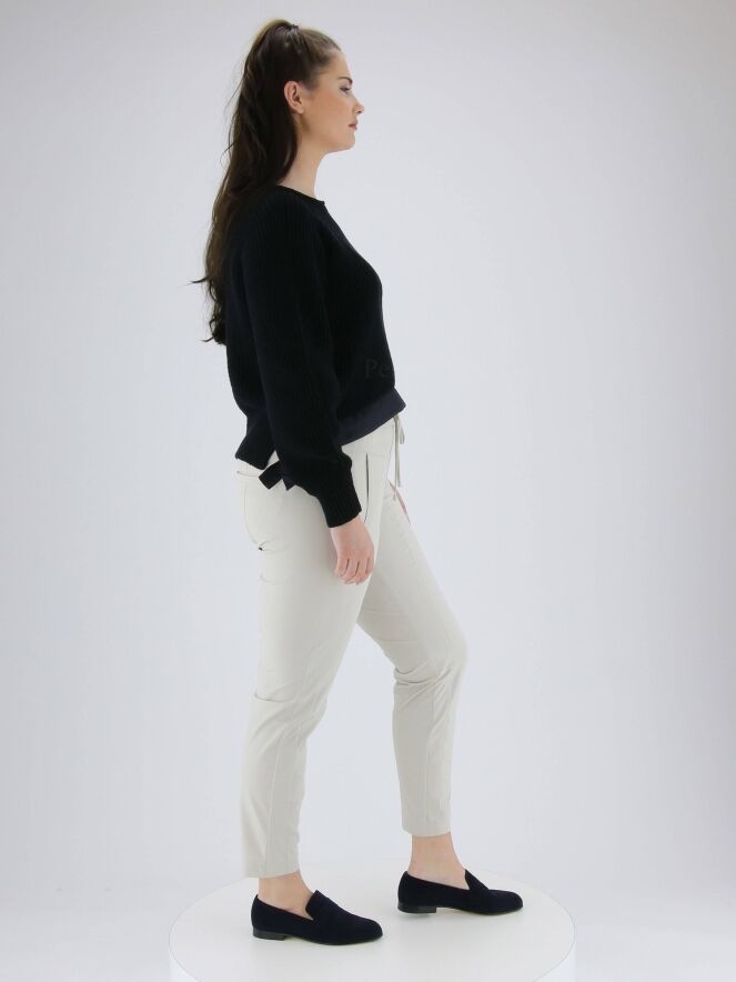 Ein marineblaue Strickpullover der Designermode von Marc Cain. Der Pullover hat einen Rundhalsausschnitt. Vorne ist der untere Saum mit einem matten Satinbund mit 2 Bändern an den Seiten versehen. Dieser Pullover kann bei 30 Grad gewaschen werden.