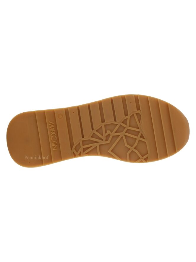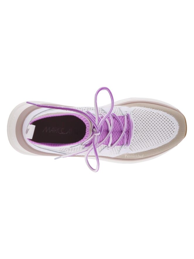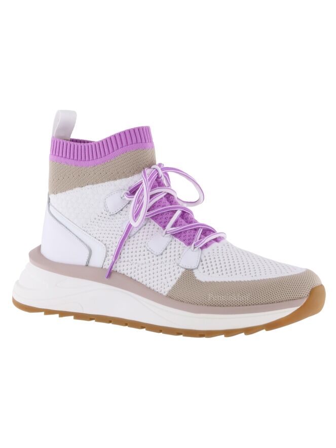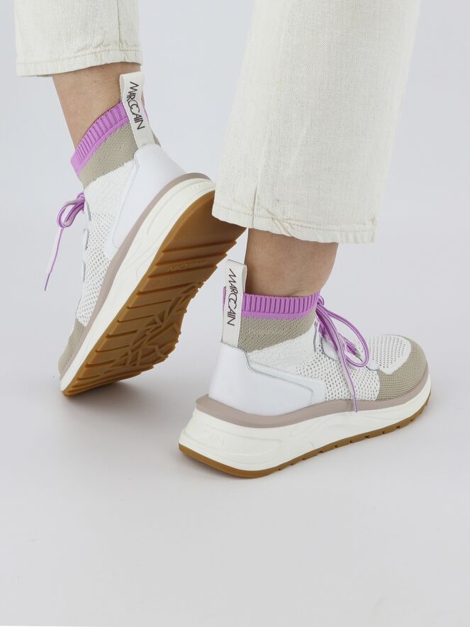 Ein hoher Sneaker der Designermode von Marc Cain in den Farben Weiß, Sand und Lila. Beide Seiten und der vordere Fußbereich sind aus einem perforierten elastischen Gewebe. Auf dem Spann befindet sich eine dekorative diagonale Kordel, die festgezogen werden kann. Der Absatz ist aus weißem Leder und der kurze Schaft hat die Form einer Socke. Die Einlegesohle ist herausnehmbar.