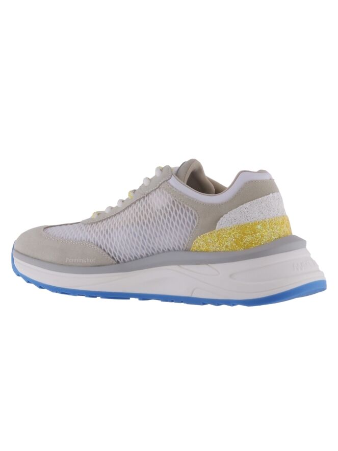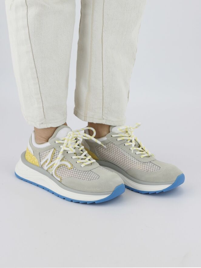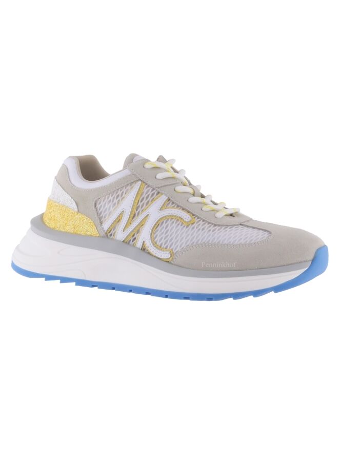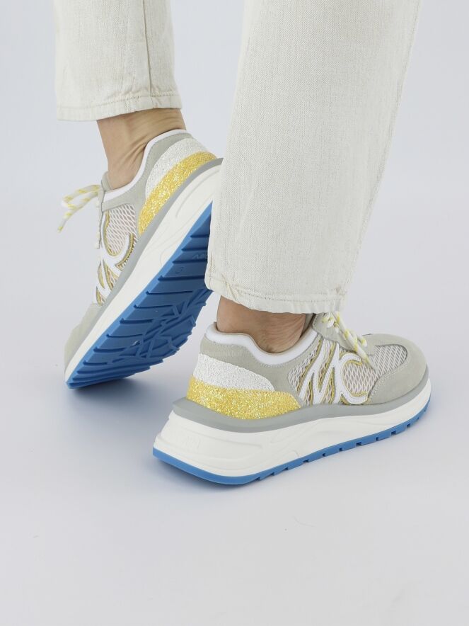 Ein Sneaker der Designermode von Marc Cain in Gelb und Blau auf weißem Grund. Beide Seiten sind mit einer perforierten Netzstruktur mit den Buchstaben MC auf der Außenseite versehen. An der Ferse befinden sich Straßsteinchen. Die Sohle ist weiß mit einer schmalen blauen Schicht an der Unterseite. Die Einlegesohle ist herausnehmbar.
