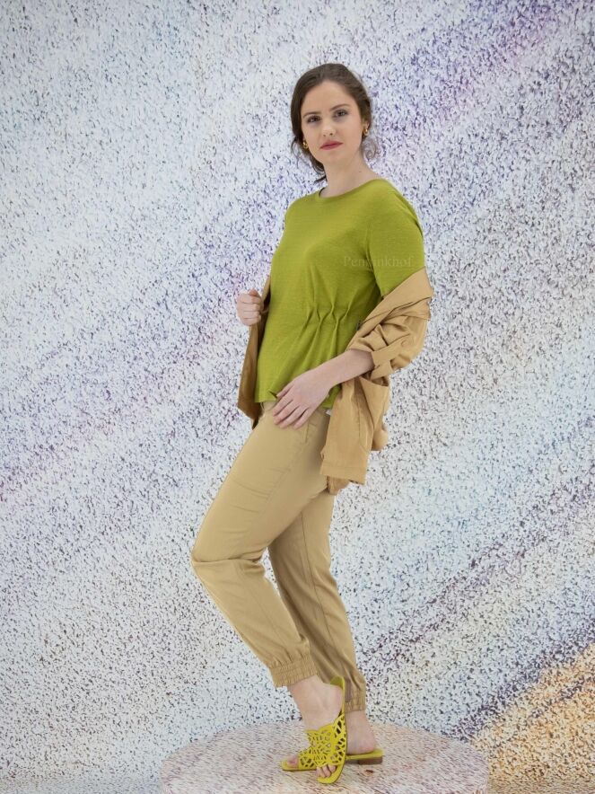 Ein Shirt der Designermode von Marc Cain mit Grafikprint in Weiß und Pastellrosa. Die Rückseite ist einfarbig rosa gehalten. In der Kante des Rundhalsausschnitts befindet sich ein Fallschirmgewebe mit Kordelzug, der einen Plisseeeffekt ermöglicht. Der Abschluss der kurzen Ärmel ist mit einem perforierten Netzgewebe versehen. An der Unterseite befinden sich auf beiden Seiten Schlitze mit einer silberfarbenen Paspel. Dieses Shirt kann bei 30 Grad gewaschen werden.