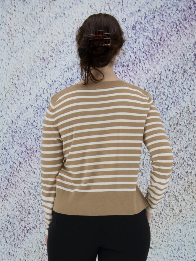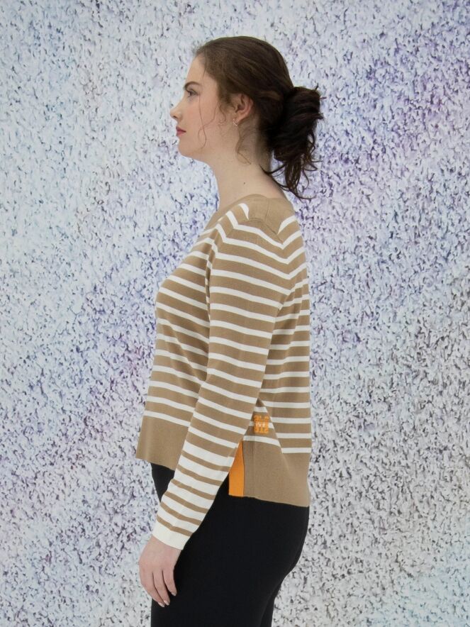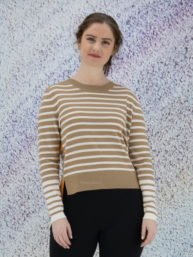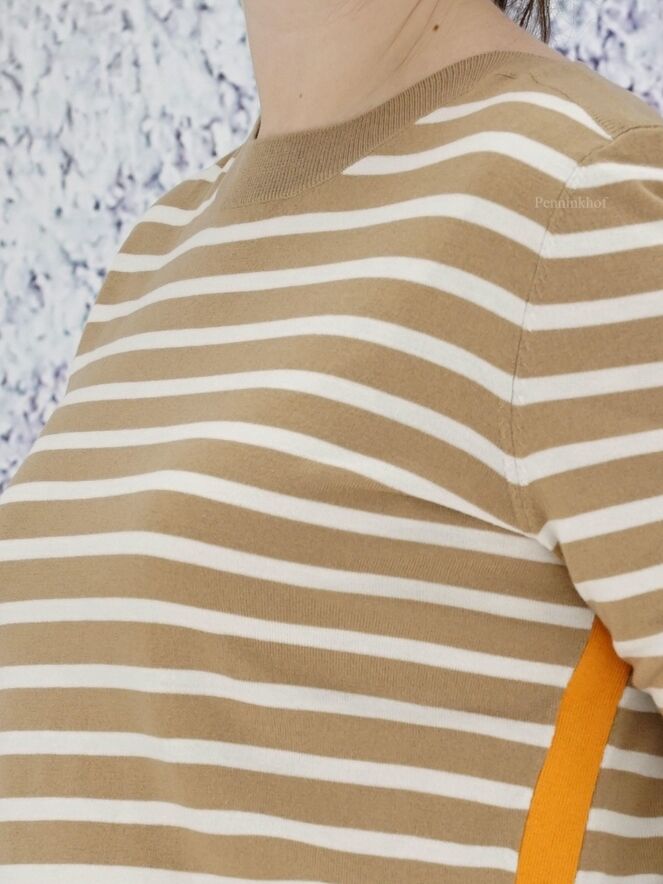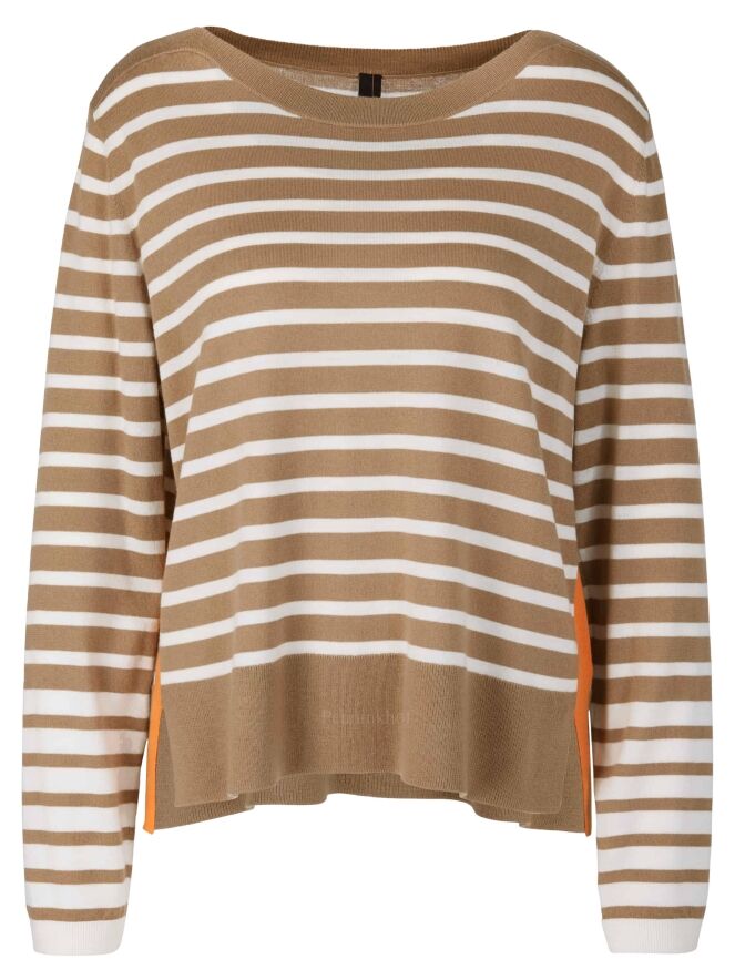 Ein gestreifter Pullover der Designermode von Marc Cain in Taupe-cremeweiß. An den Seiten befindet sich eine orangefarbene Zierleiste. Dieser Pullover darf von Hand gewaschen werden.