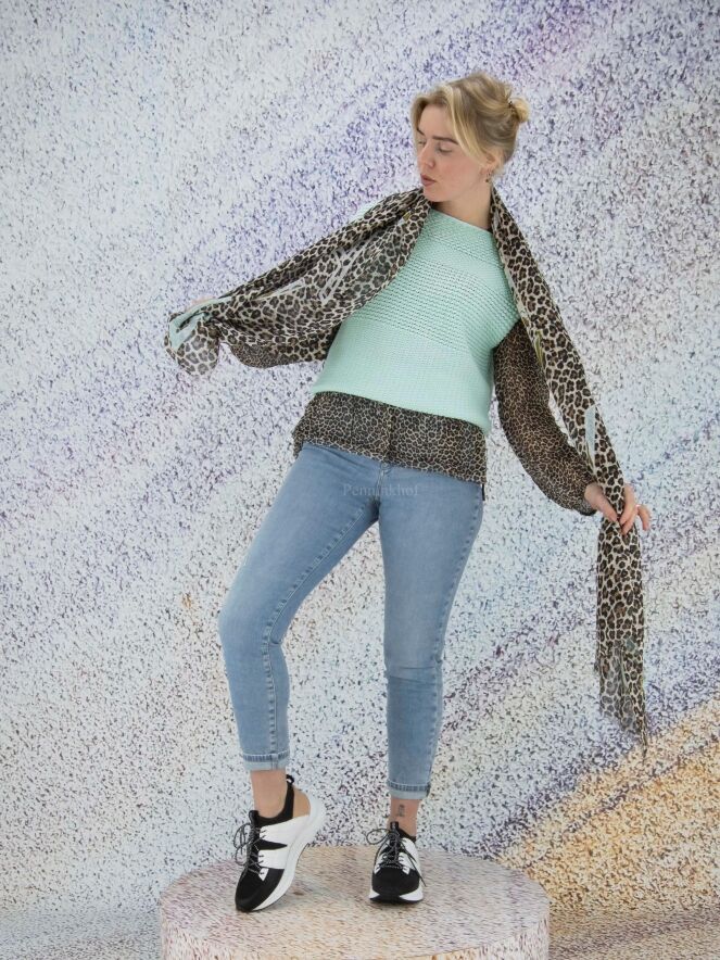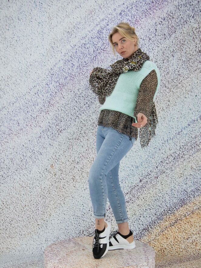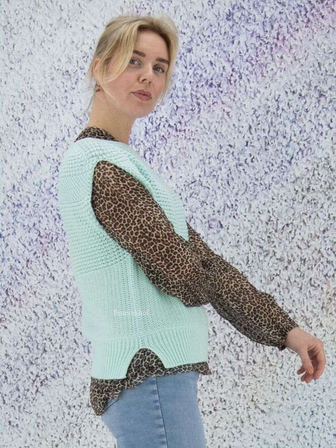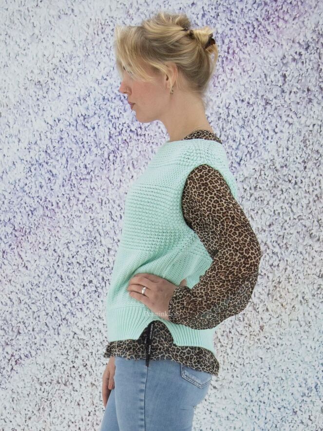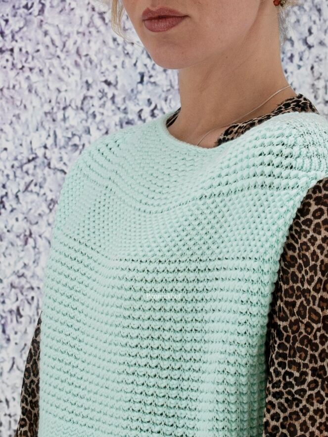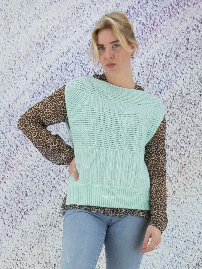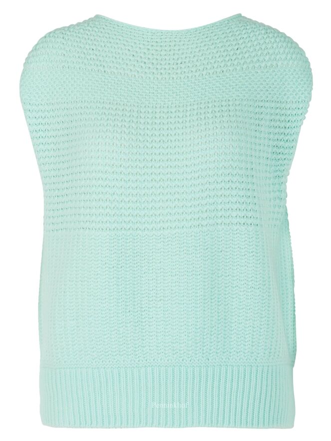 Eine Strickweste der Designermode von Marc Cain in Mintgrün. Durch das offene Strickmuster ist die Weste leicht transparent. Diese Weste kann von Hand gewaschen werden.
