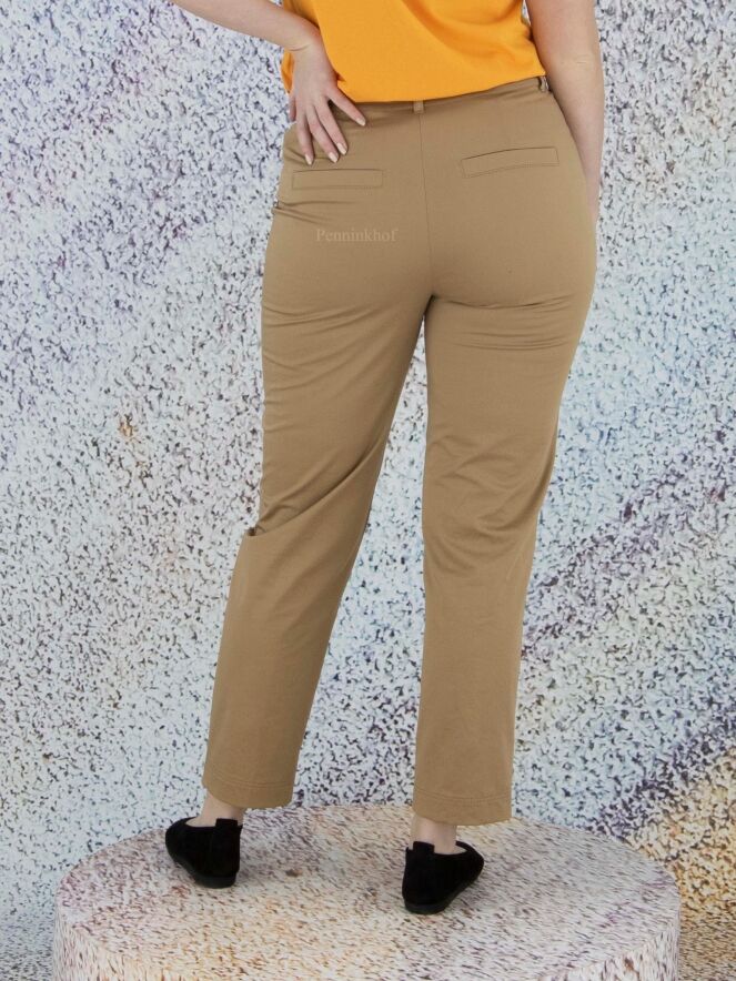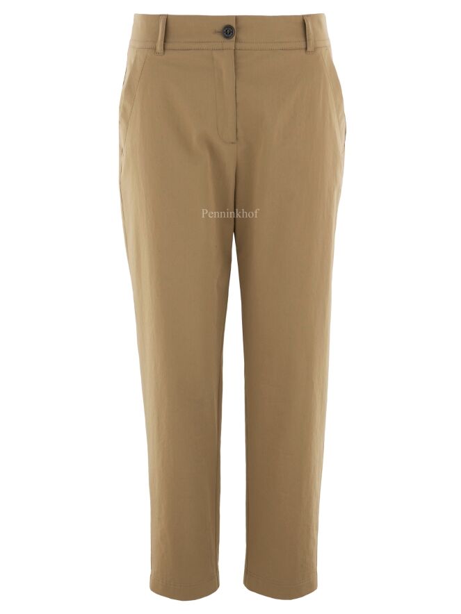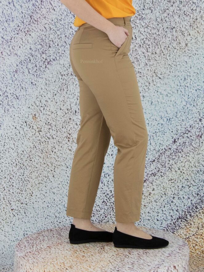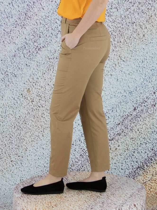 Eine Hose der Designermode von Marc Cain in Taupe. Die Hose hat Eingriffstaschen. Der untere Saum ist mit einer dekorativen Doppelnaht versehen. Diese Hose kann bei 30 Grad gewaschen werden.