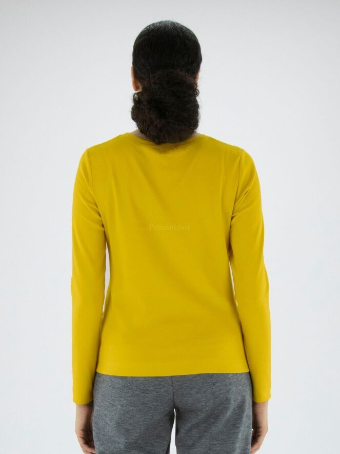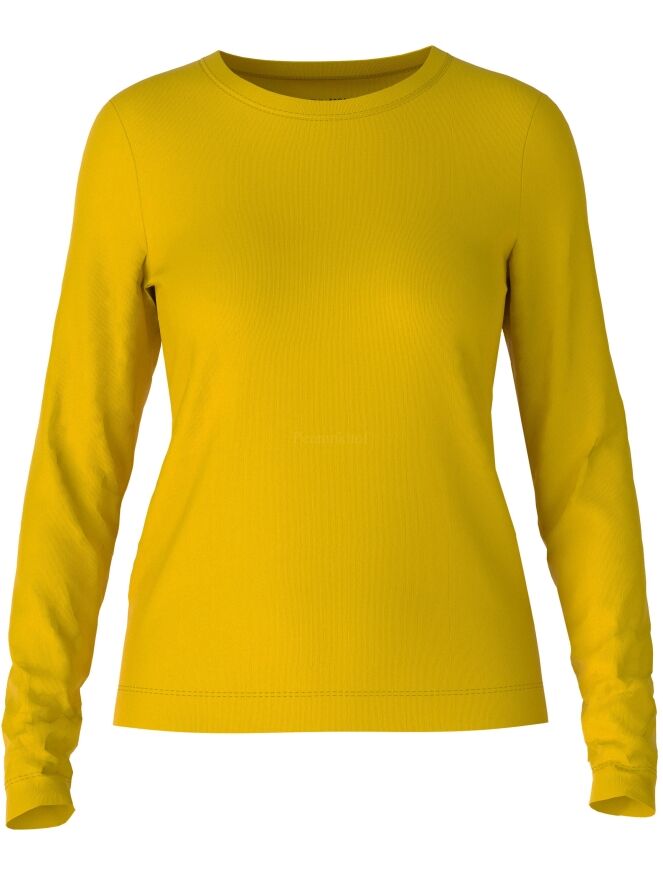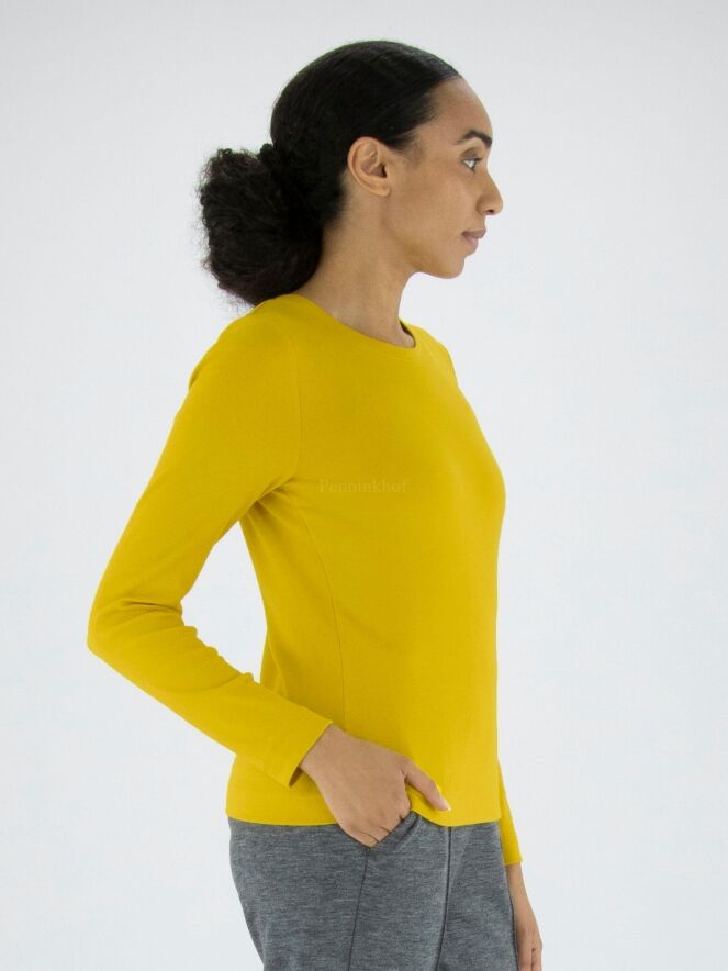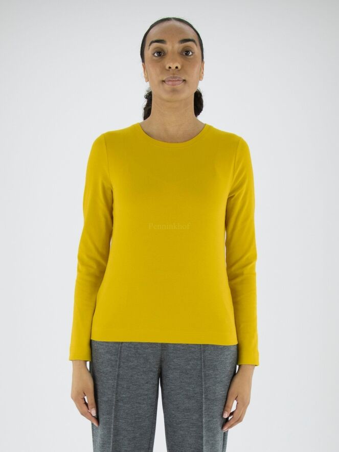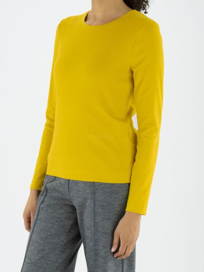 Ein feines geripptes Shirt von Marc Cain in der Farbe Gelb. Das Shirt hat einen Rundhalsausschnitt und lange Ärmel. Dieses Shirt kann bei 30 Grad gewaschen werden.
