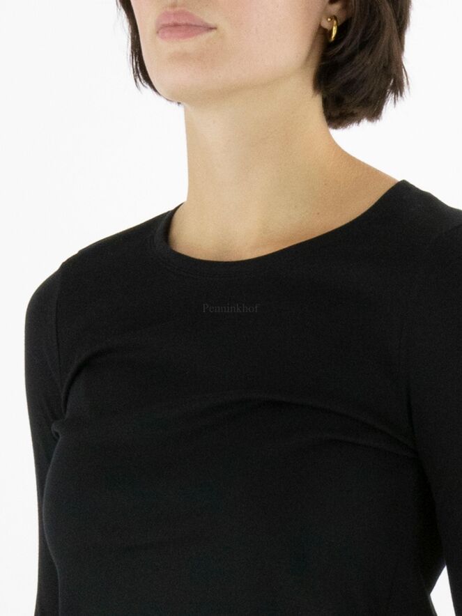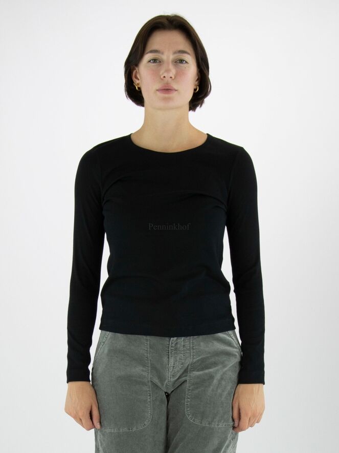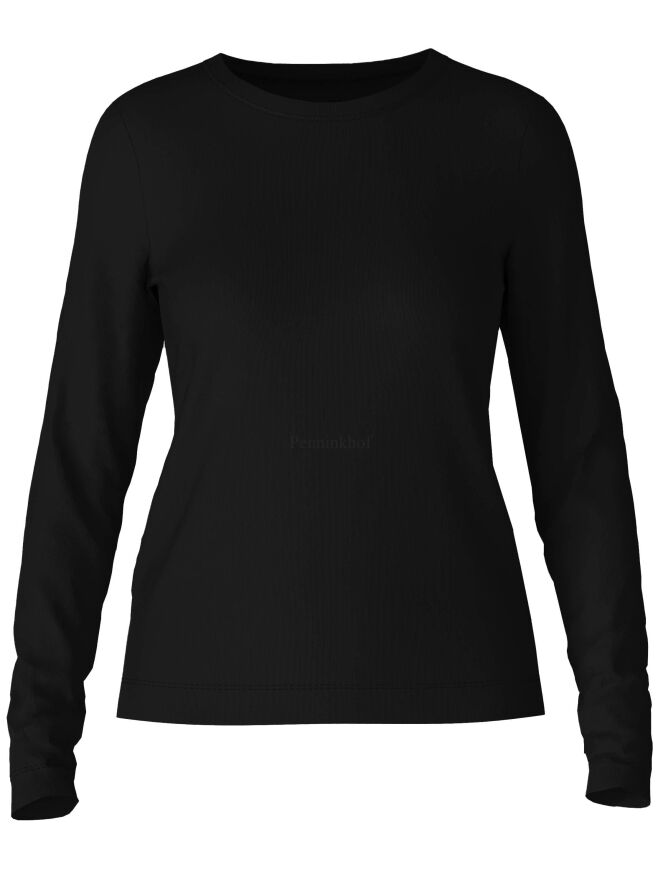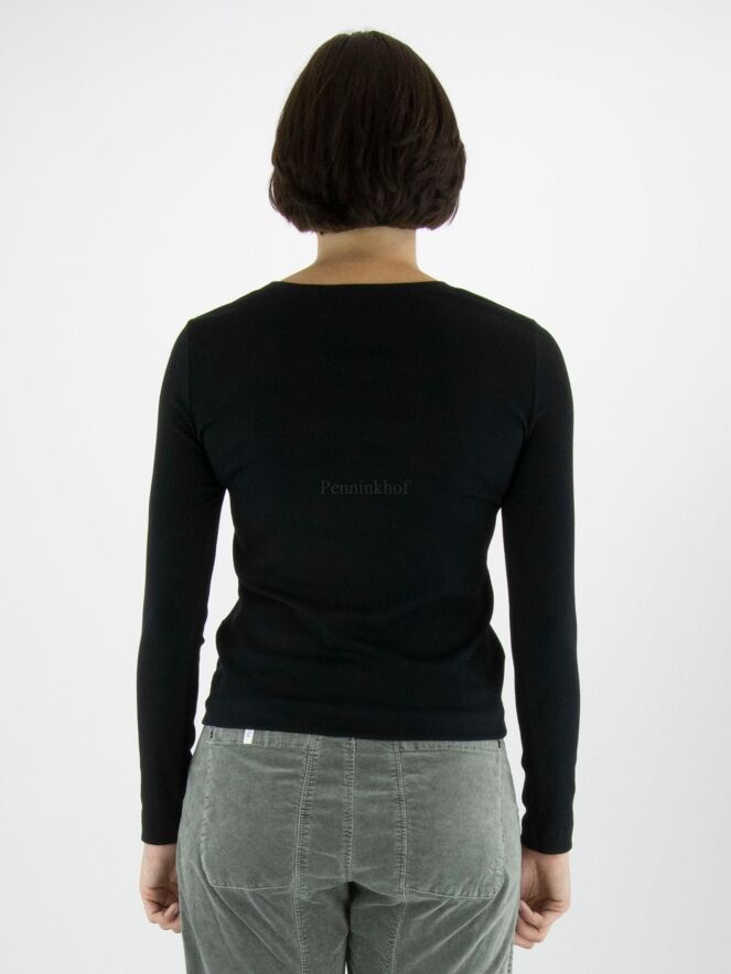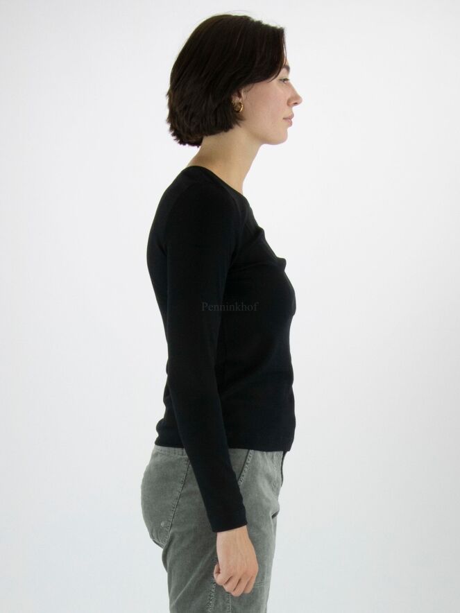 Ein feines geripptes Shirt von Marc Cain in der Farbe Schwarz. Das Shirt hat einen Rundhalsausschnitt und lange Ärmel. Dieses Shirt kann bei 30 Grad gewaschen werden.