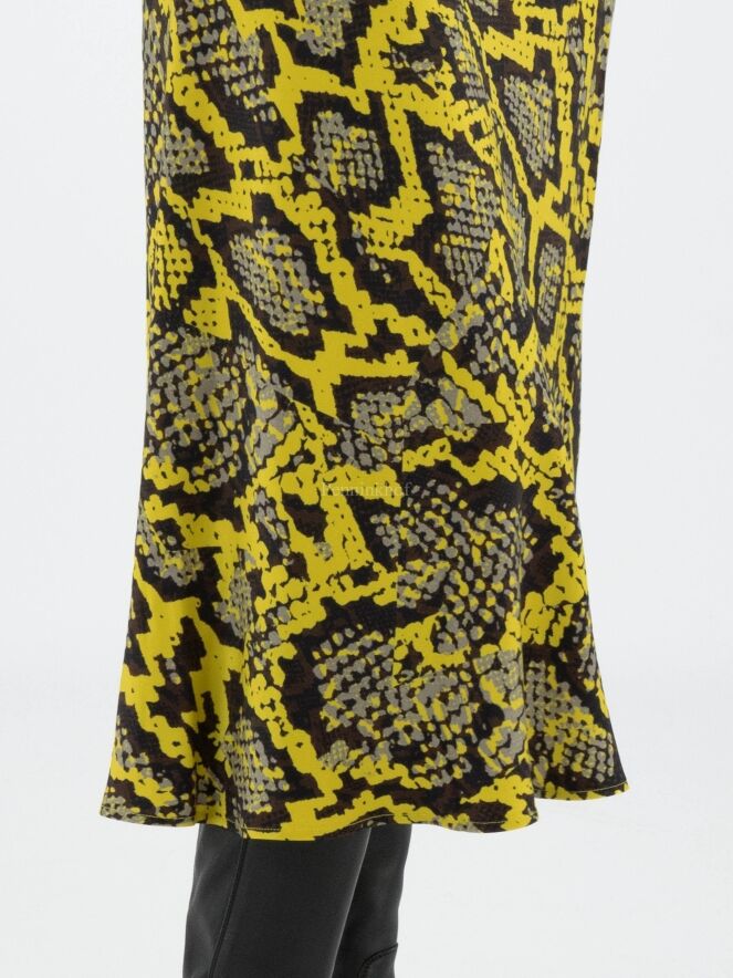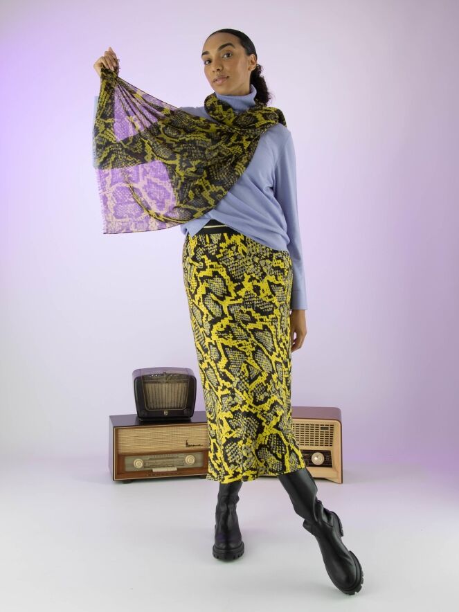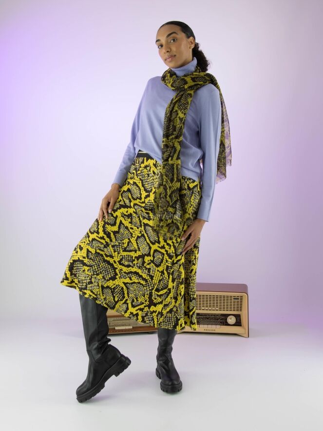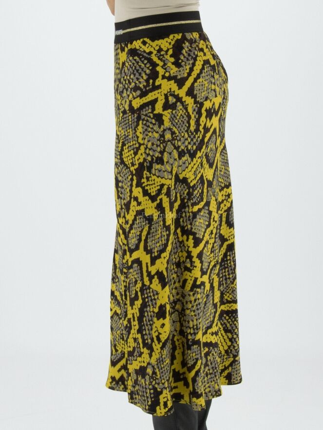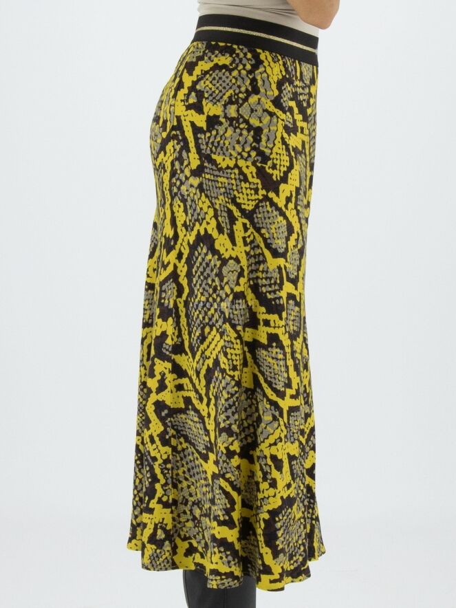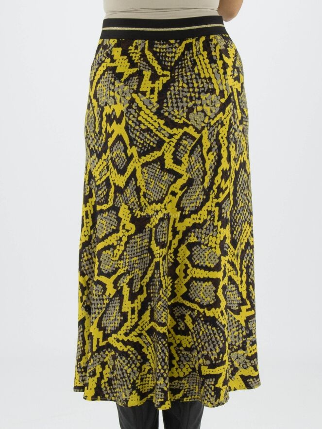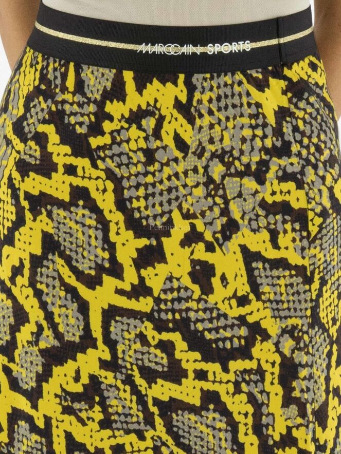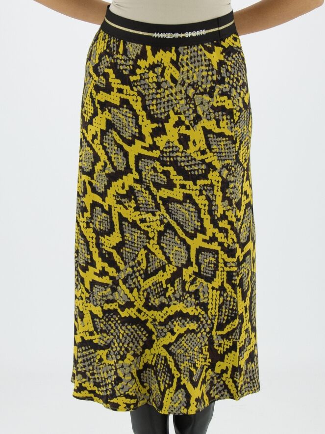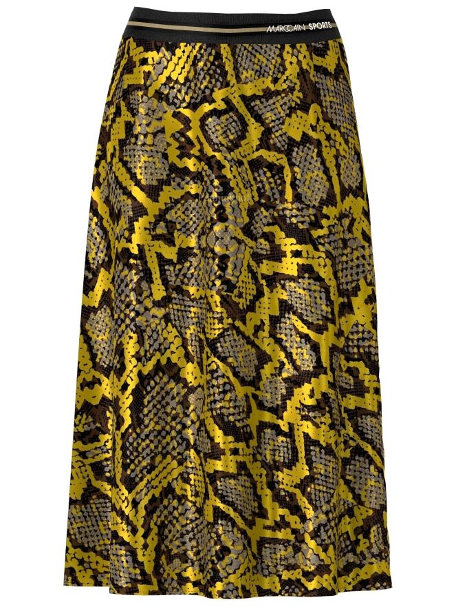 Marc Cain Rock mit Reptil-Print in den Farben gelb, schwarz und grau. In der Taille befindet sich ein schwarzes Gummiband. Der Rock hat eine leichte A-Linie und ist ungefüttert. Dieser Rock kann bei 30 Grad gewaschen werden.
