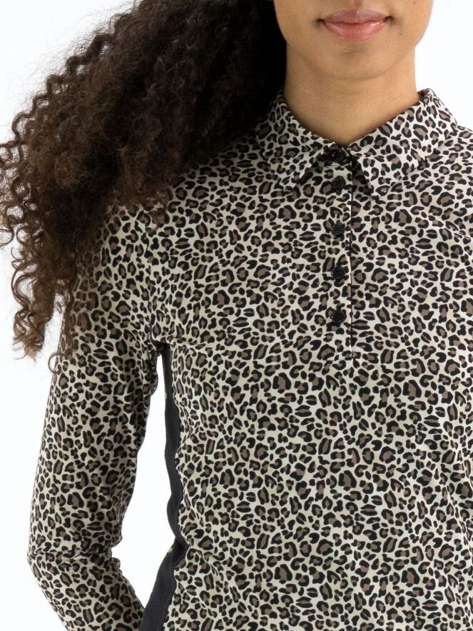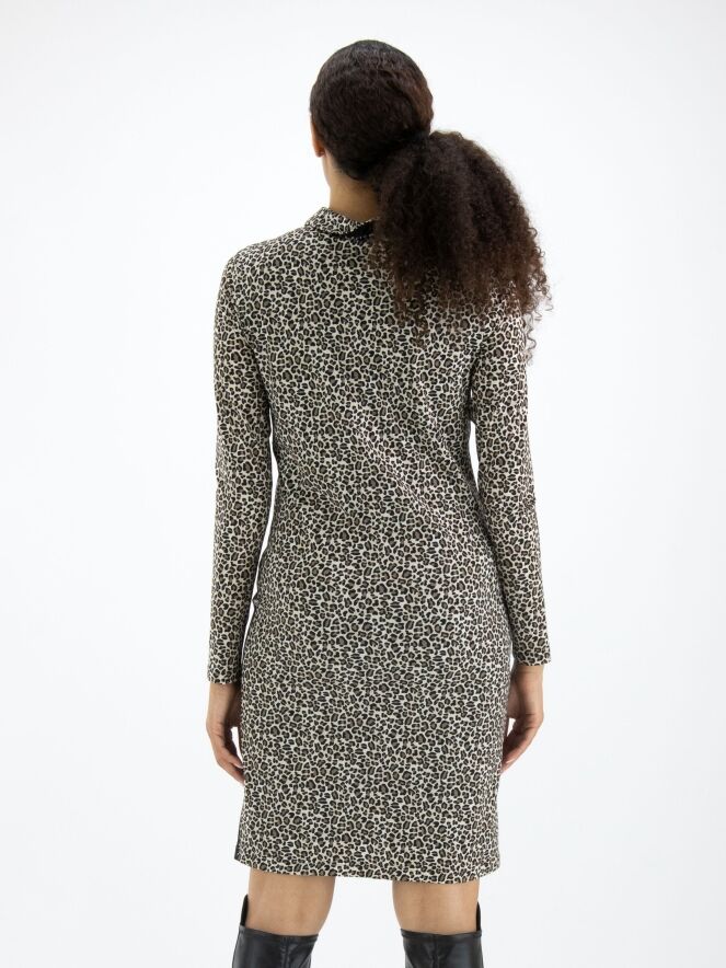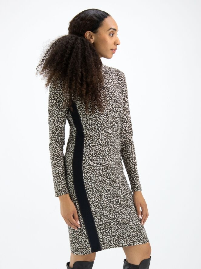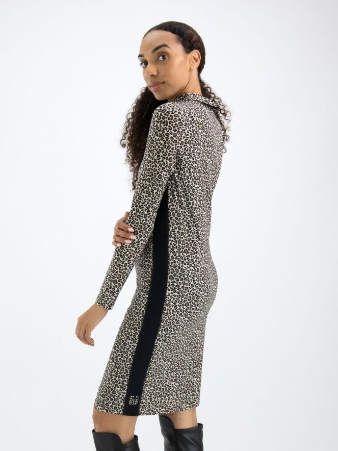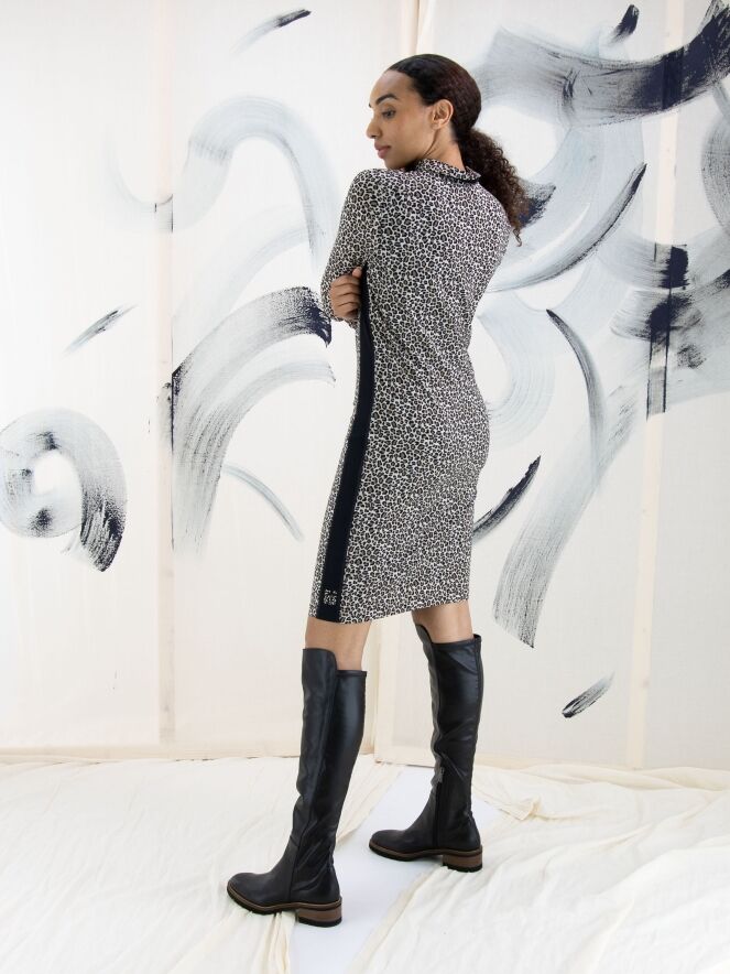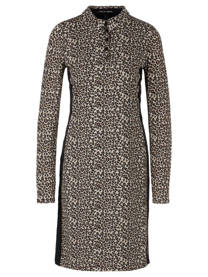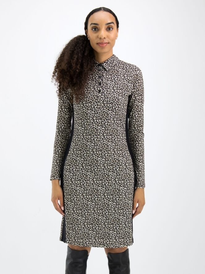 Ein Kleid von Marc Cain im Leopardenmuster mit Schwarz und Taupe auf sandfarbenem Hintergrund. Es hat eine breite schwarze Borte an den Seiten. Das Kleid verfügt über einen Polo-Verschluss mit Kragen, hat lange Ärmel und ist gefüttert. Dieses Kleid kann bei 30 Grad gewaschen werden.