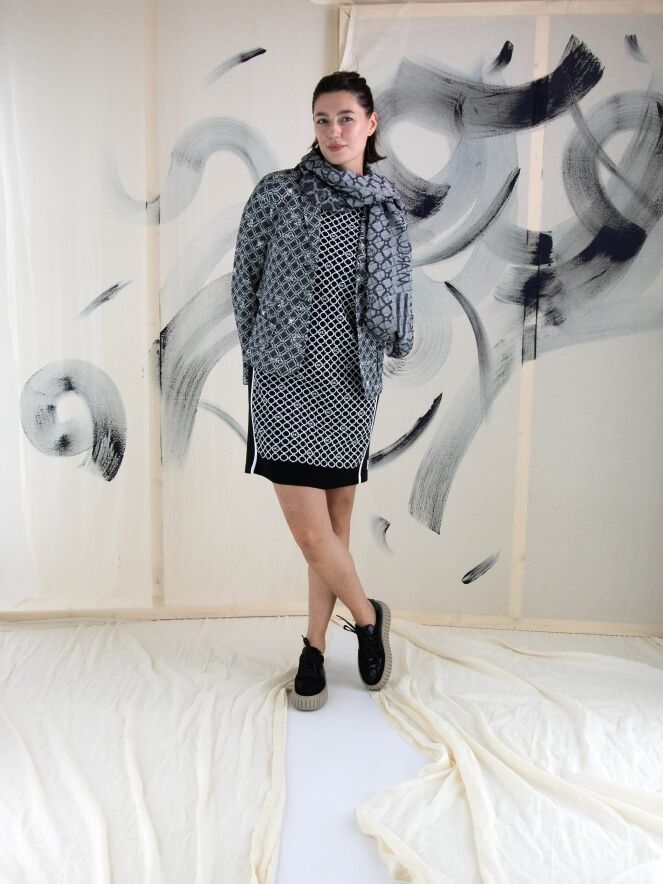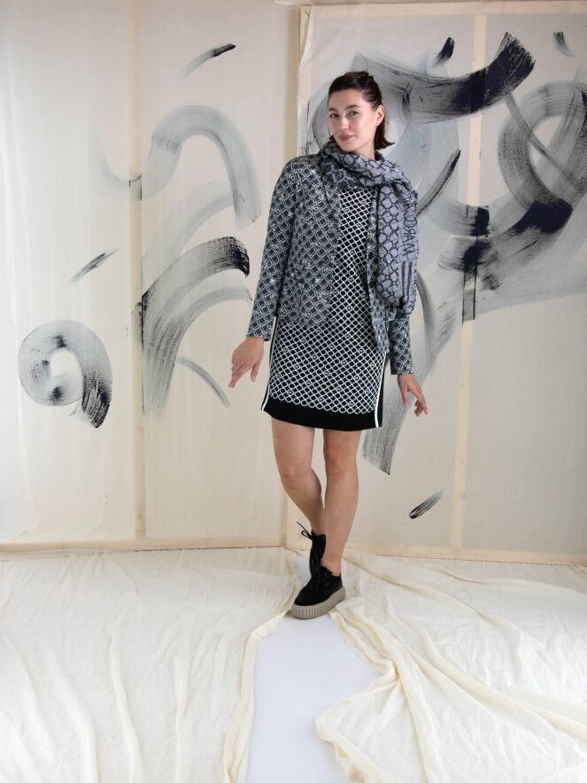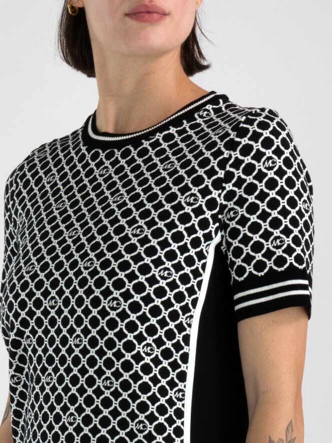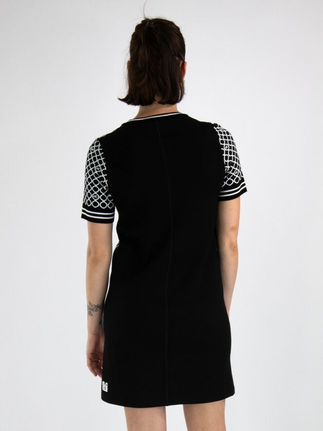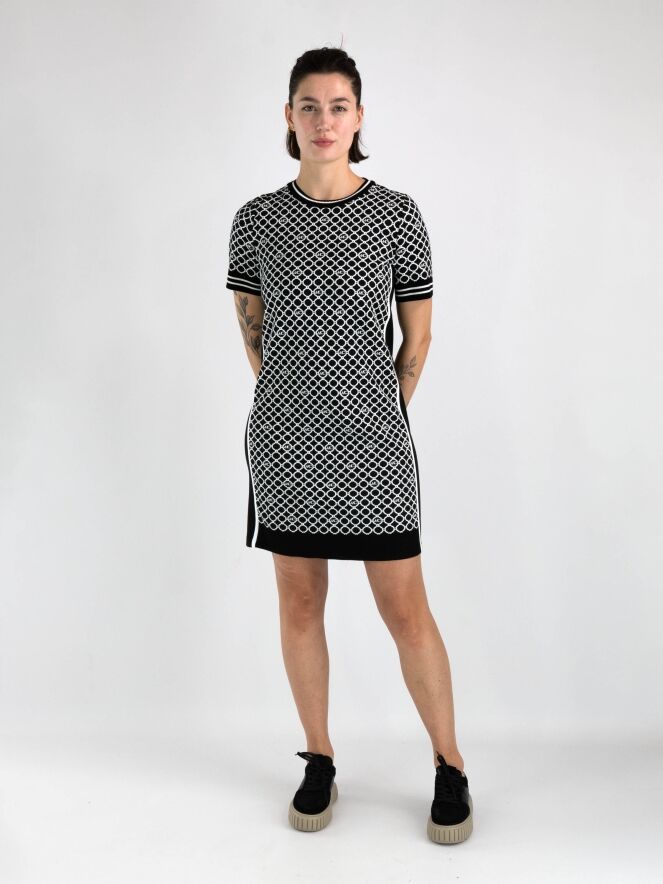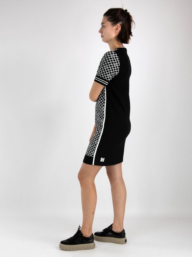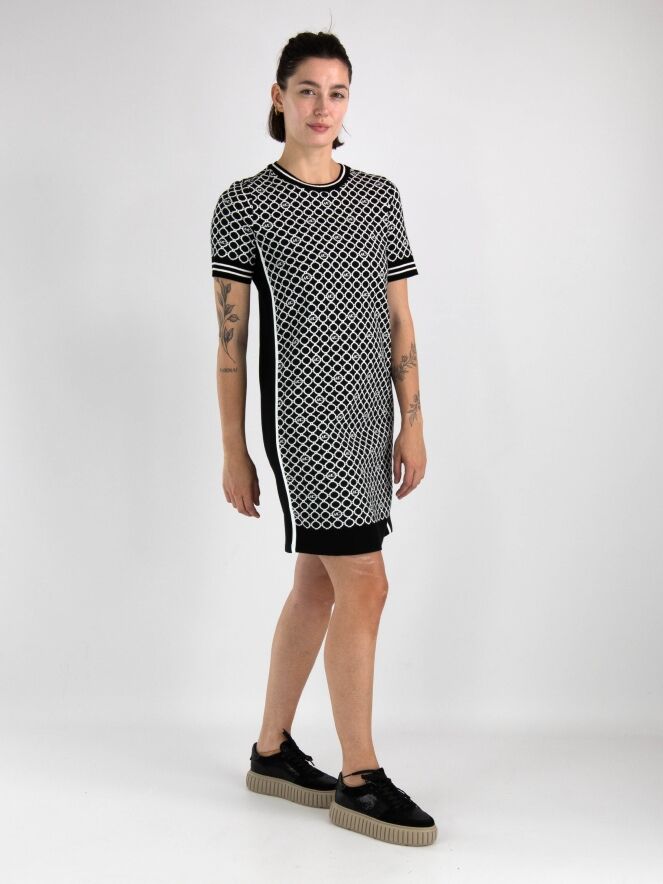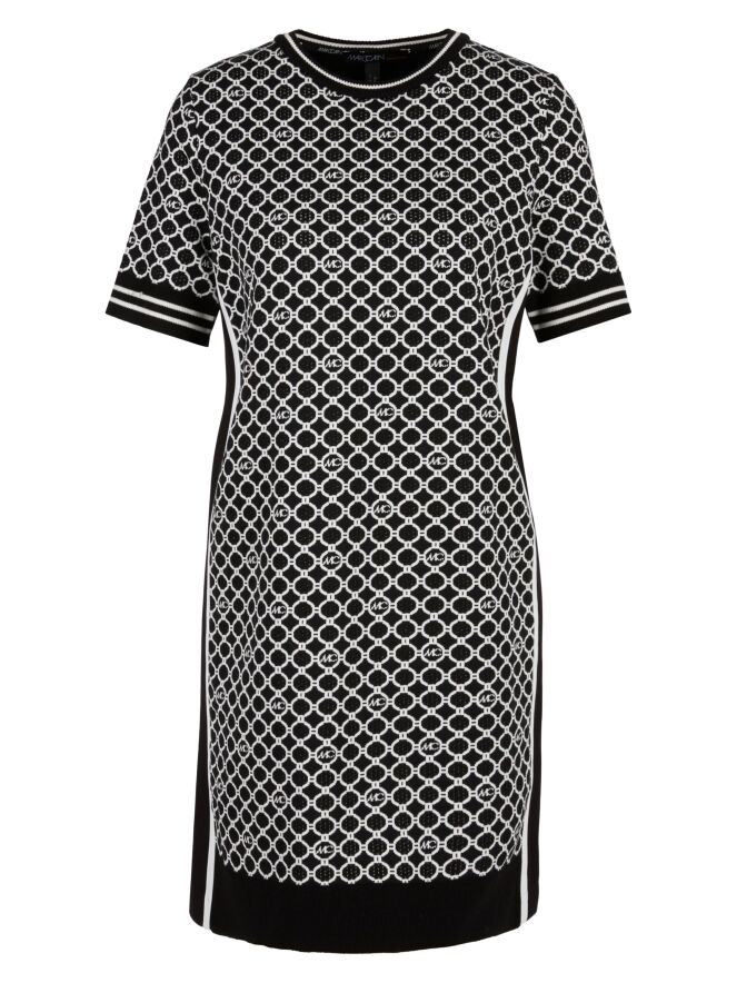 Ein Kleid von Marc Cain mit einem Rasterdruck auf der Vorderseite in Schwarz und Weiß. Die Rückseite ist einfarbig schwarz. Entlang des Randes des runden Ausschnitts und der kurzen Ärmel befindet sich eine fein gerippte Strickborte mit einem Streifenmuster. An der Seite ist eine vertikale weiße Borte. Dieses Kleid kann bei 30 Grad gewaschen werden.