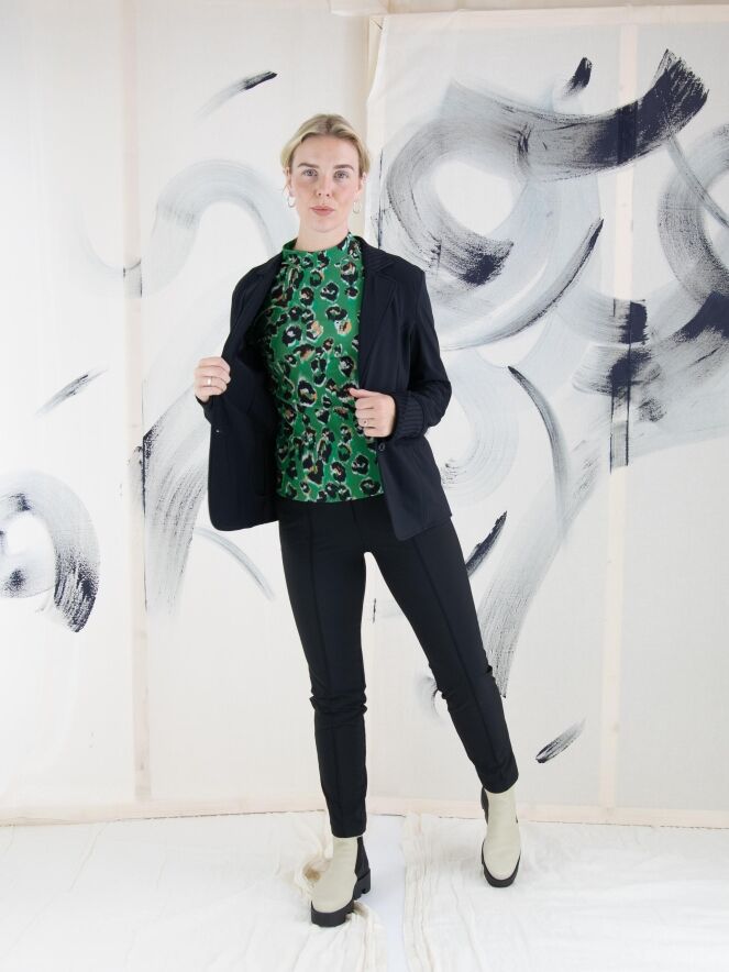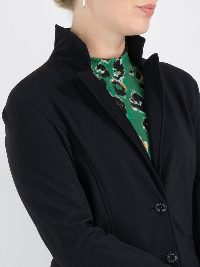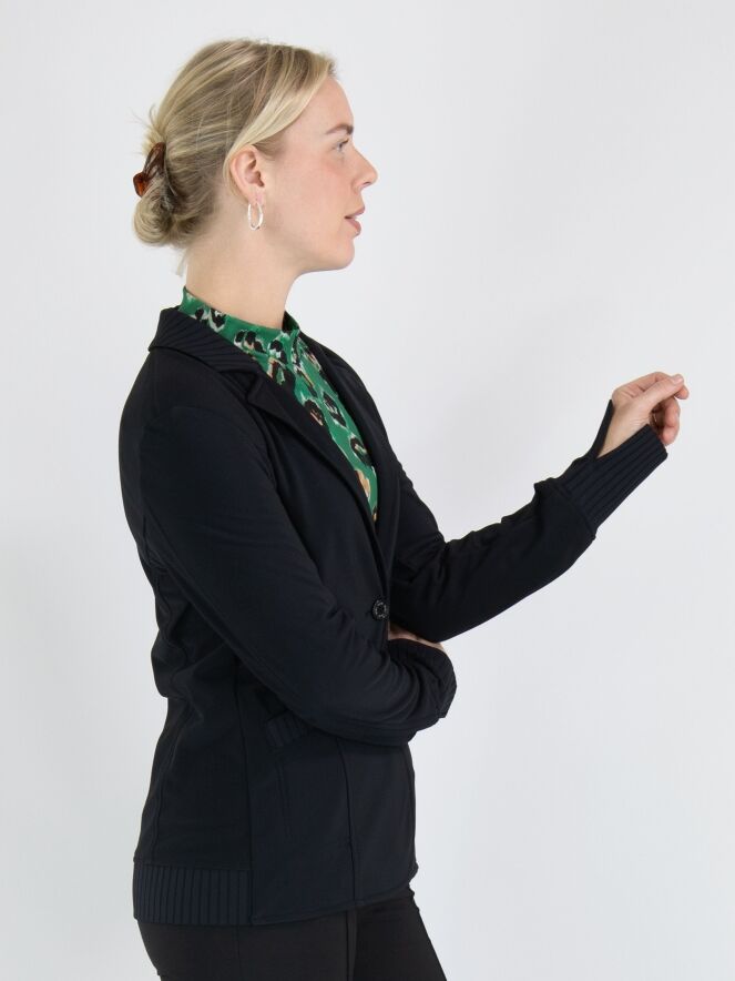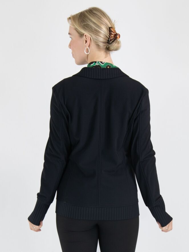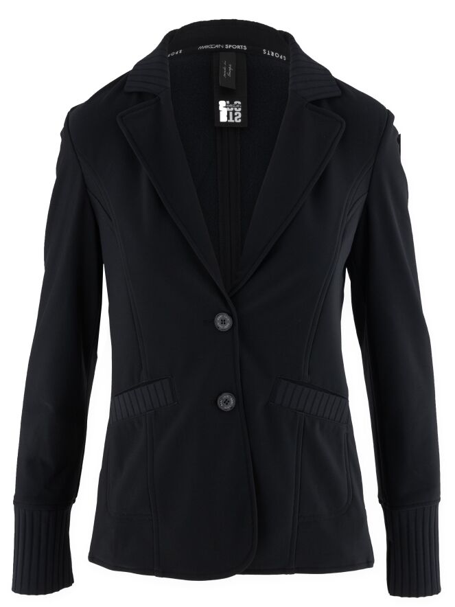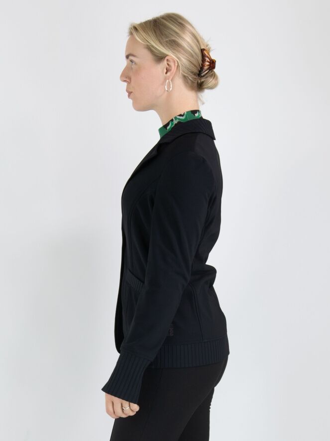 Ein Blazer von Marc Cain in Scuba-Qualität in schwarzer Farbe. Der Kragen, die Enden der langen Ärmel und die Ränder der Taschen sind aus geripptem Strickstoff gefertigt. Dieser Blazer kann bei 30 Grad gewaschen werden.