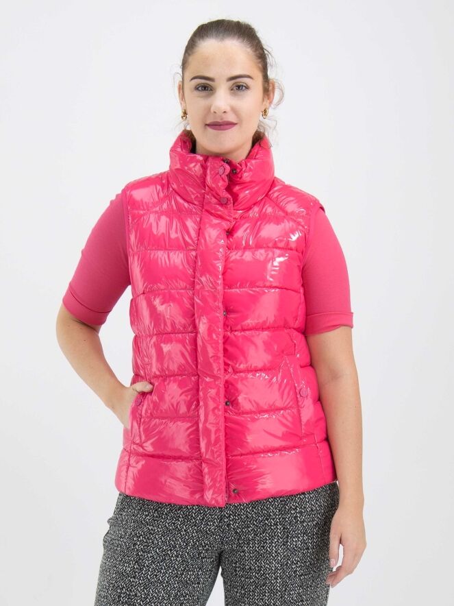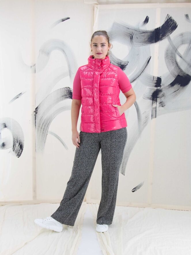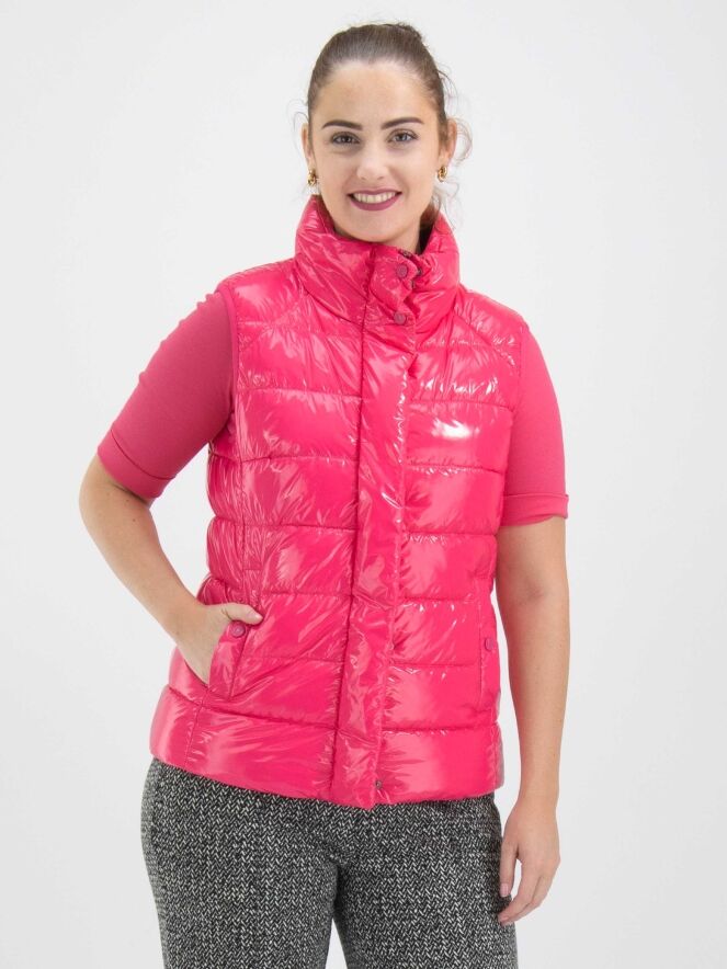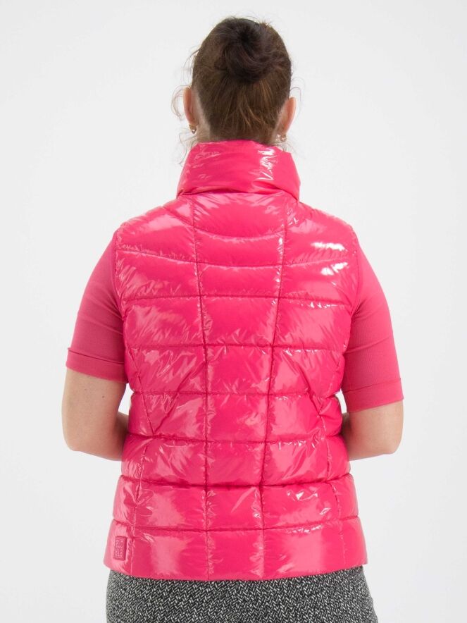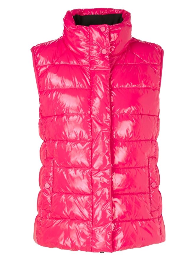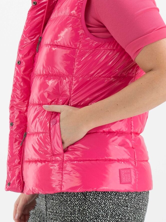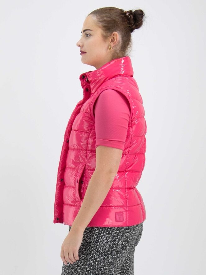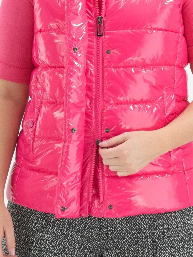 Eine gesteppte kurze Weste von Marc Cain in frischem Pink-Lack. Die Weste hat einen Reißverschluss mit verdeckten Druckknöpfen als zweite Verschlussart. Diese Weste kann bei 30 Grad gewaschen werden.