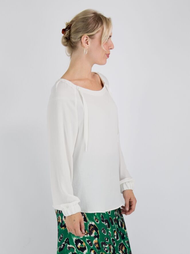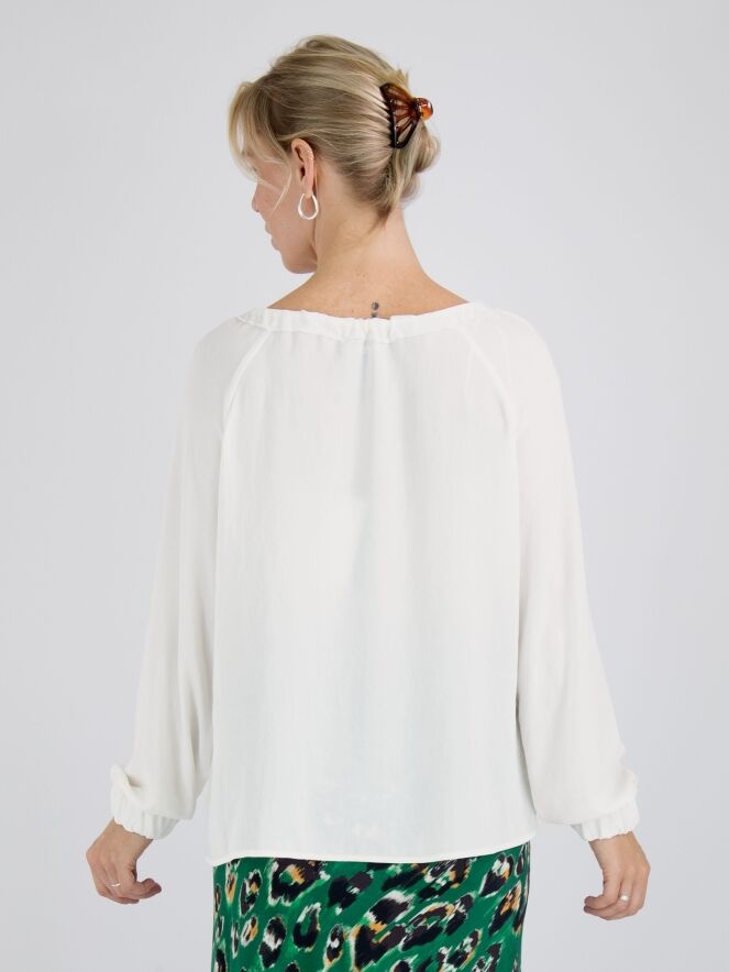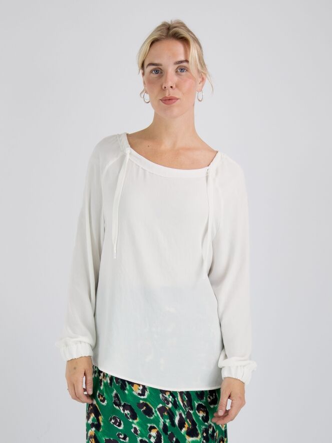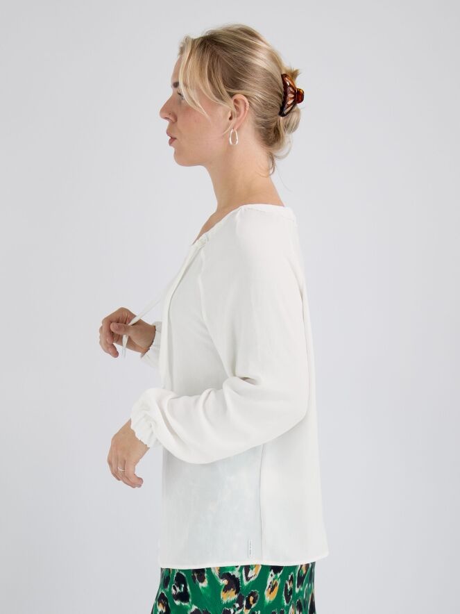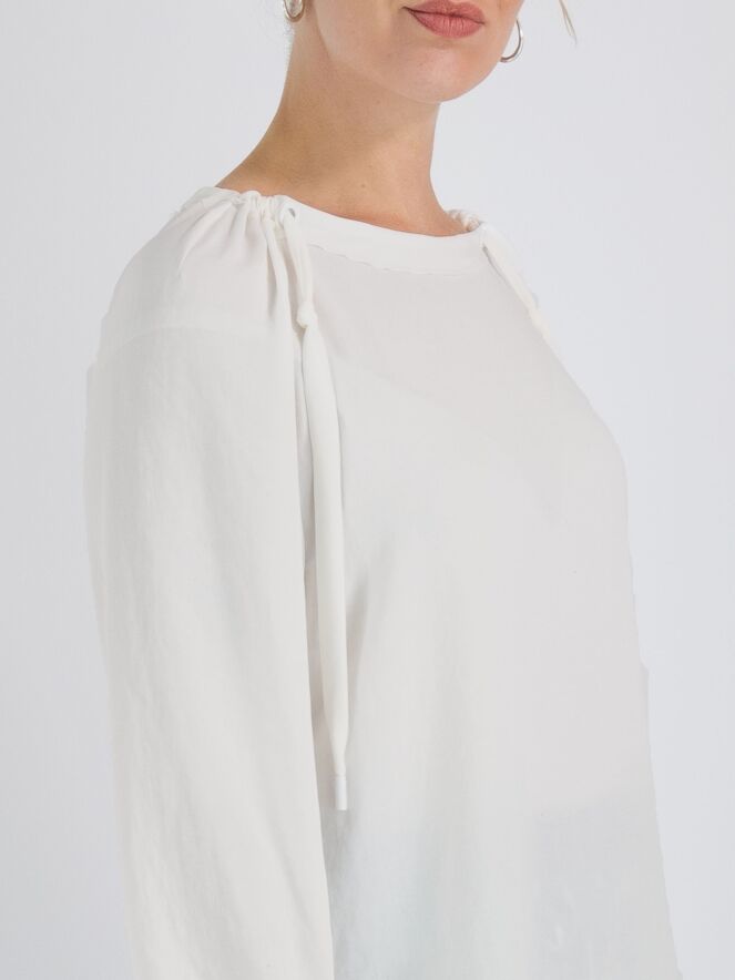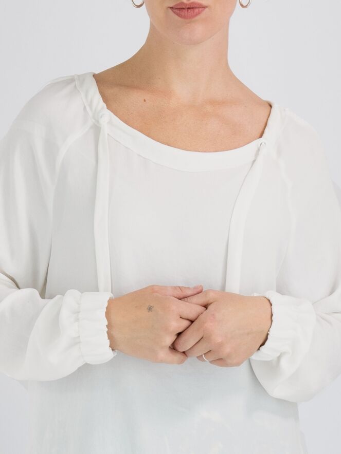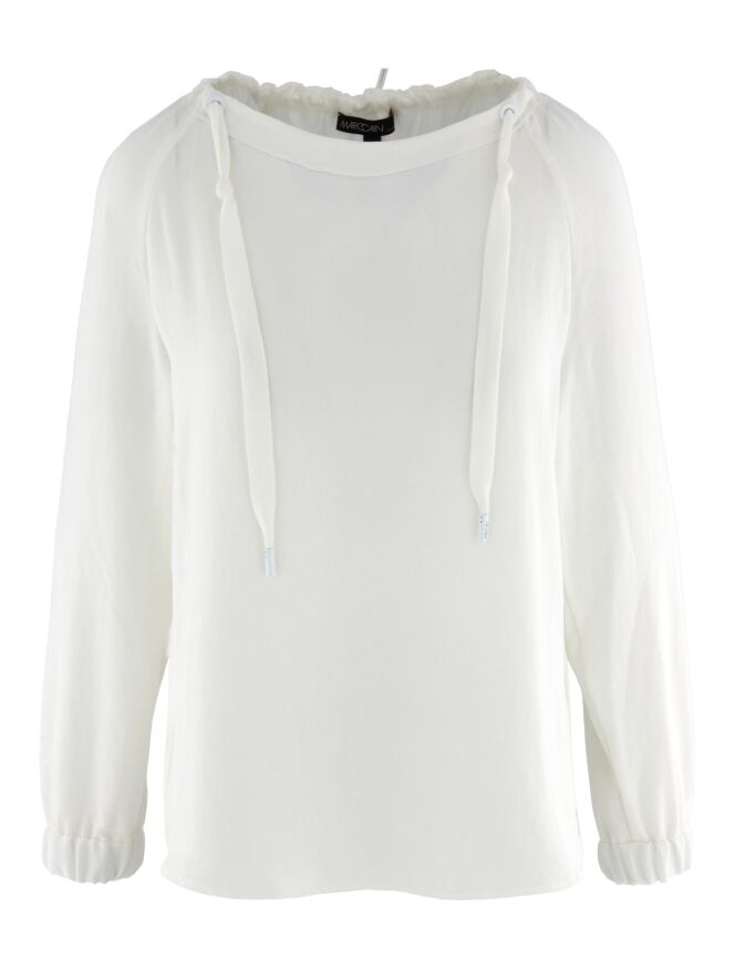 Ein Shirt von Marc Cain in Cremeweiß. Im Rand des weiten Rundhalsausschnitts befindet sich ein Band, mit dem ein Falteneffekt erzeugt werden kann. Am Ende der langen Ärmel befindet sich eine geraffte Borte mit Gummizug. Dieses Shirt kann bei 30 Grad gewaschen werden.