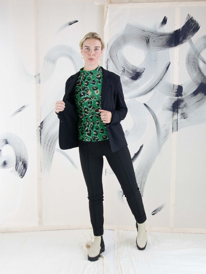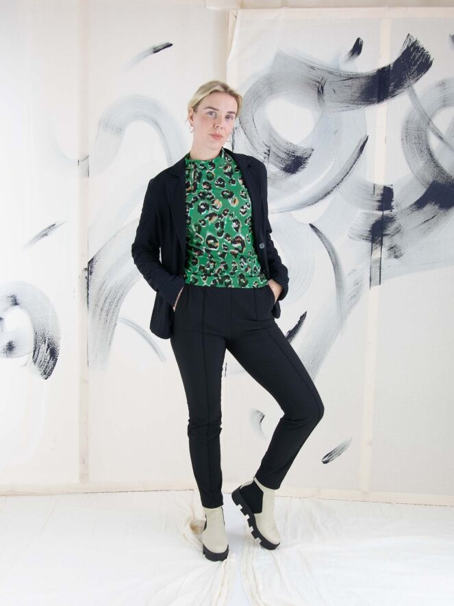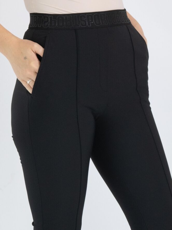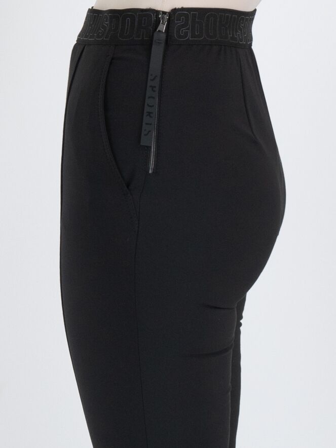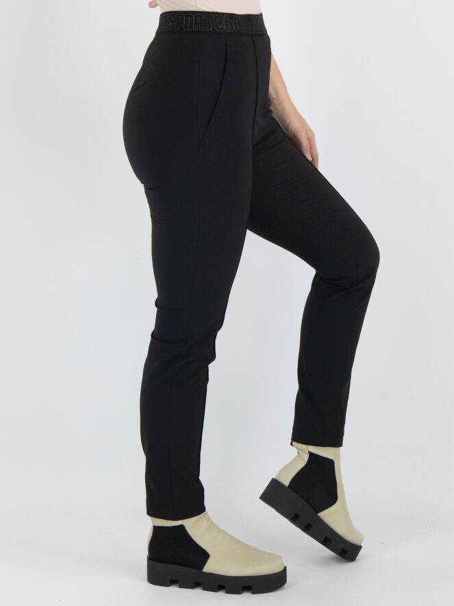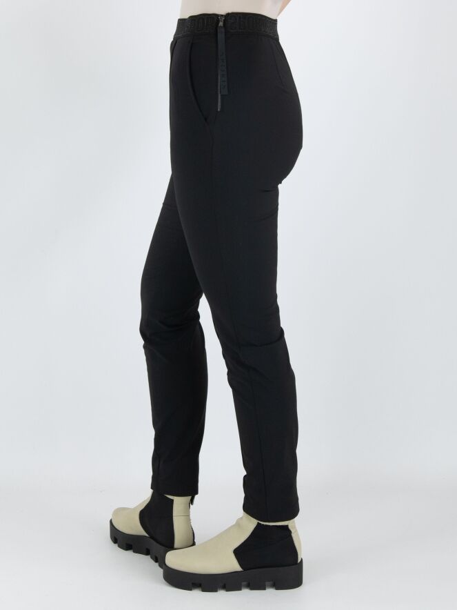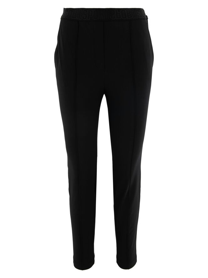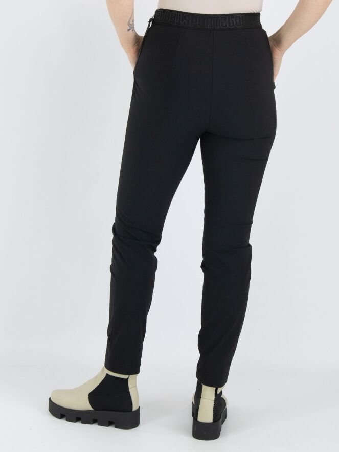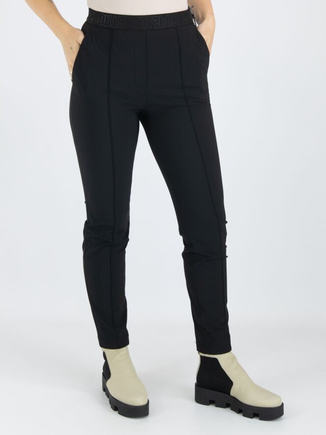 Eine Hose von Marc Cain in schwarzer Farbe. In der Taille befindet sich ein Gummiband mit einem seitlichen Reißverschluss. In der Mitte der Hosenbeine gibt es eine umgekehrte Naht. Die Hose hat Eingrifftaschen und kann bei 30 Grad gewaschen werden.