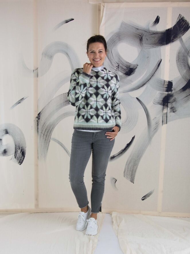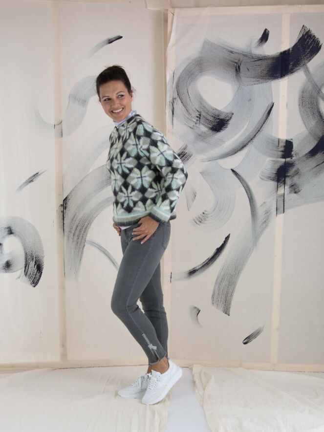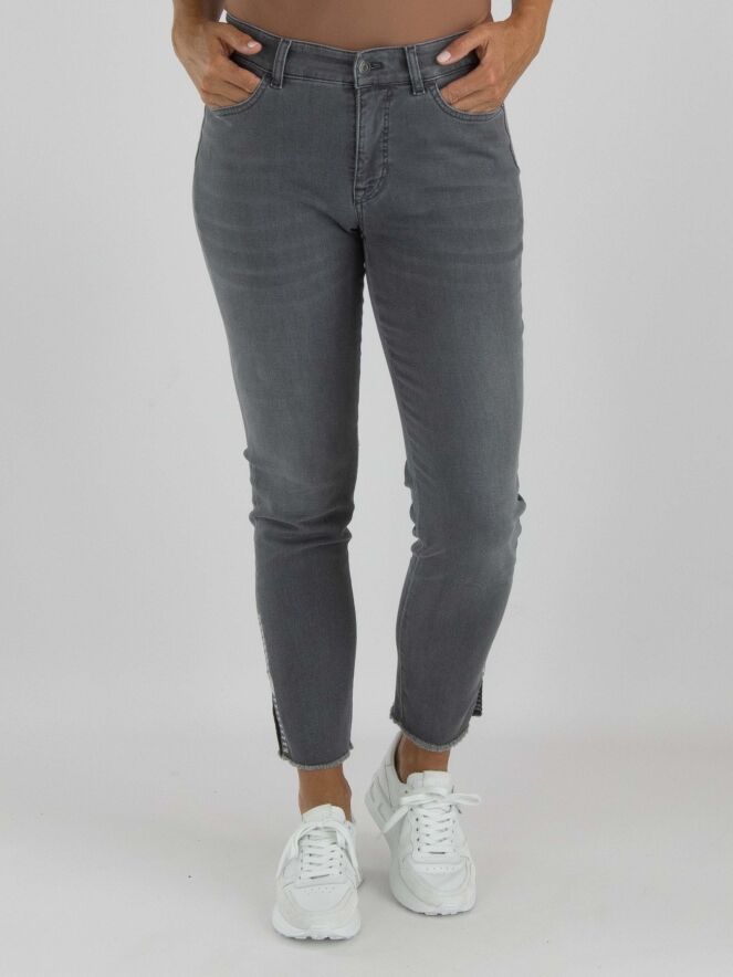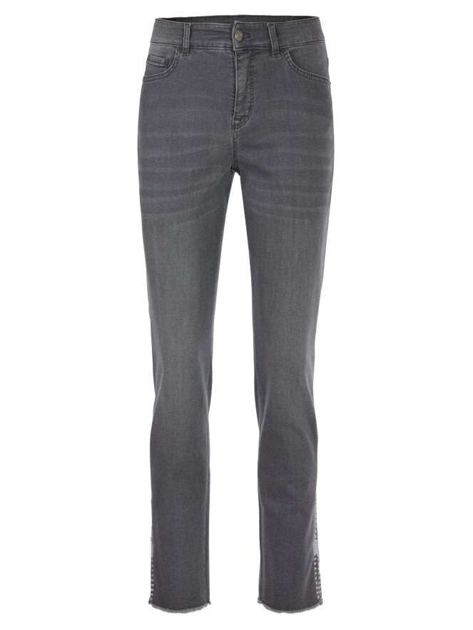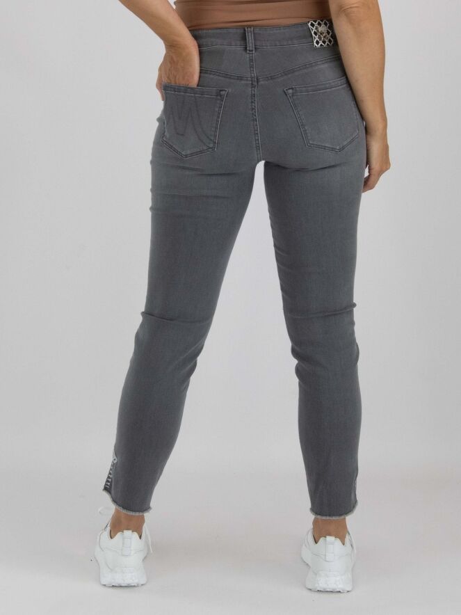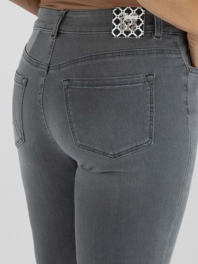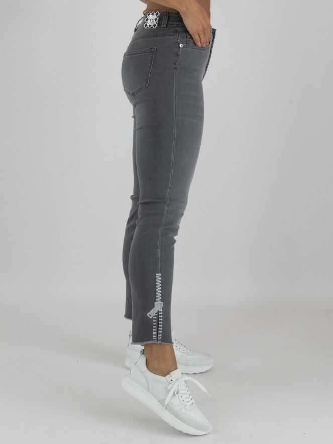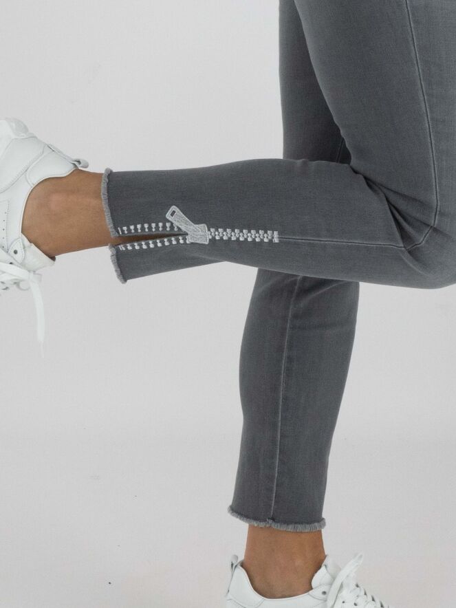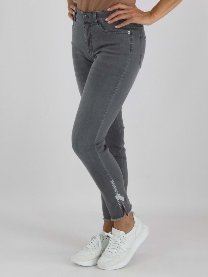 Graue Jeans von Marc Cain im 5-Pocket-Stil. Unten an beiden Seiten befinden sich kurze Schlitze mit entlang der Ränder eingestickten Reißverschlüssen in hellgrauem Garn. Diese Jeans können bei 30 Grad gewaschen werden.