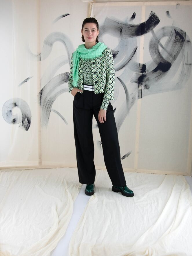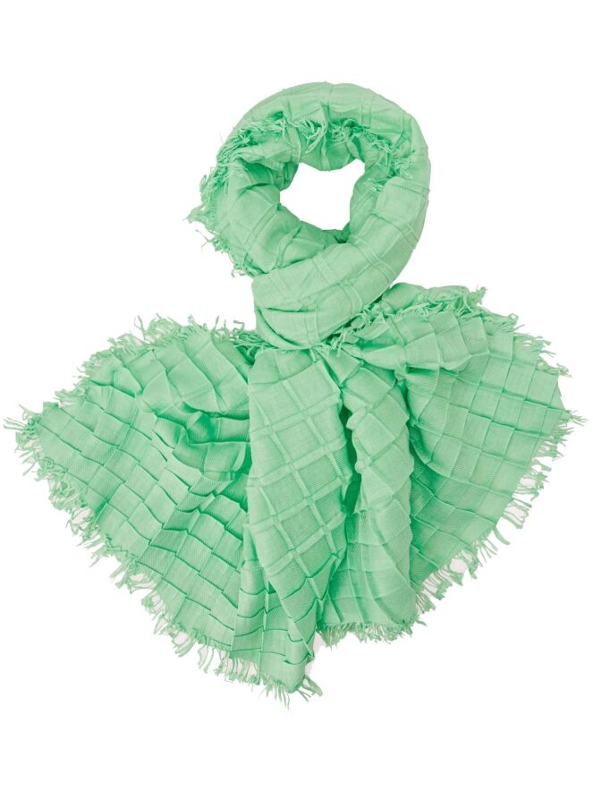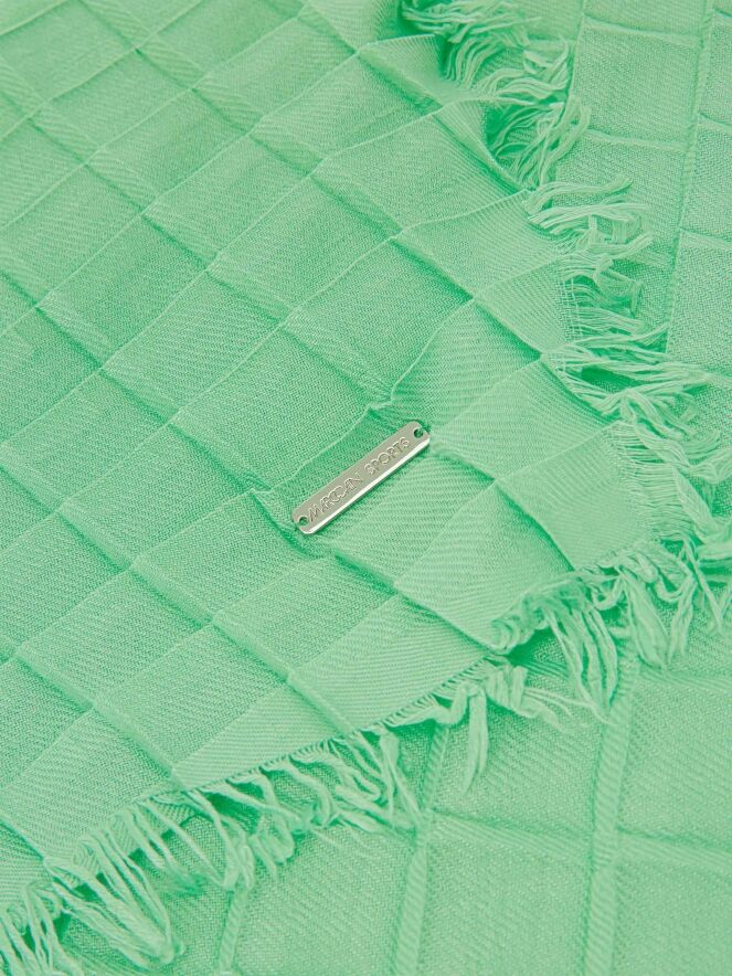 Ein Schal von Marc Cain in einem leuchtenden Grün, gewebt in einer Waffelstruktur. Die Ränder sind fein ausgefranst. Dieser Schal kann von Hand gewaschen werden.
