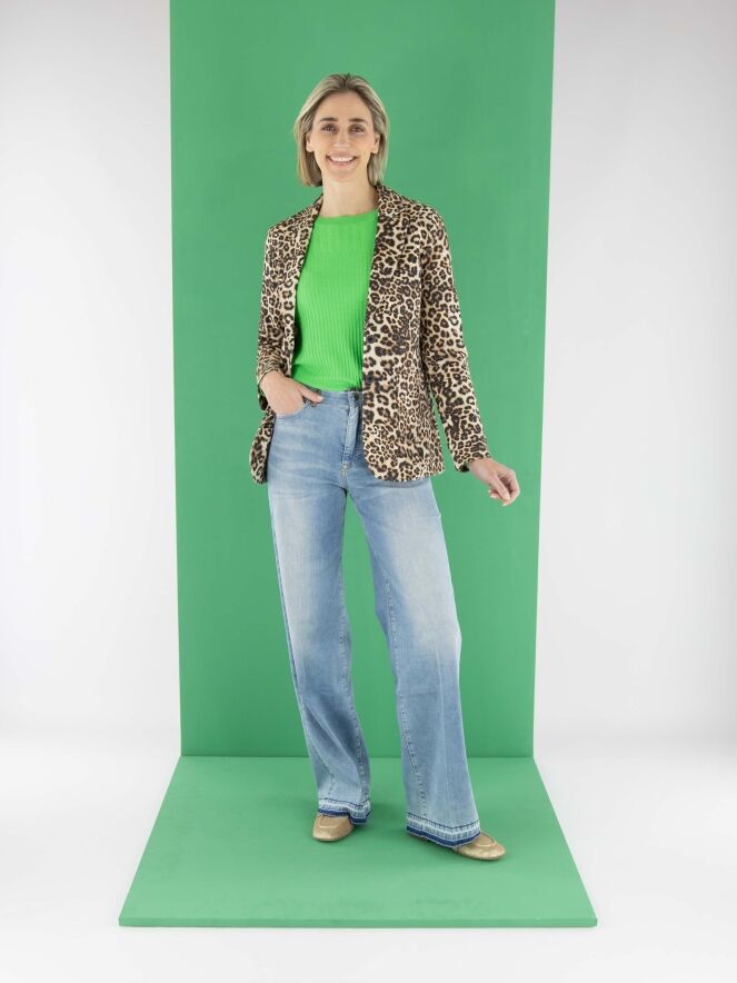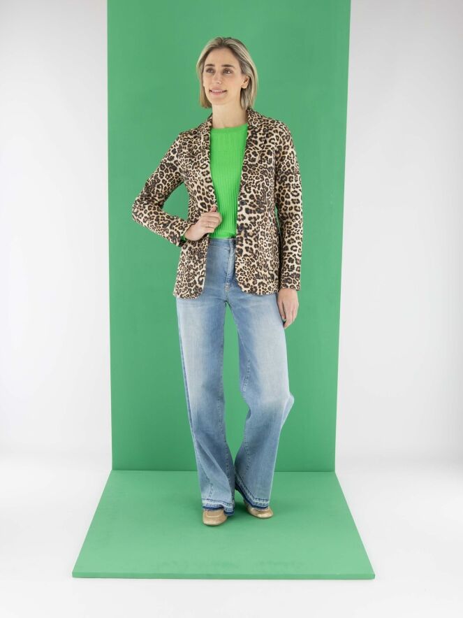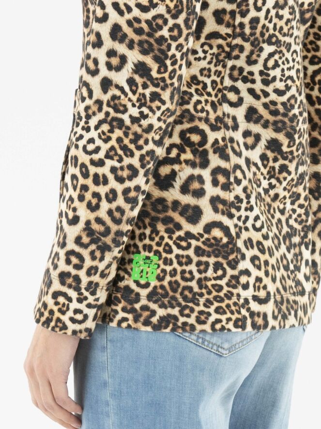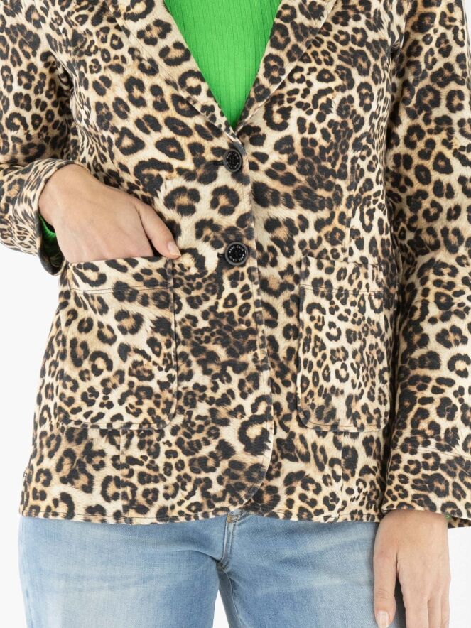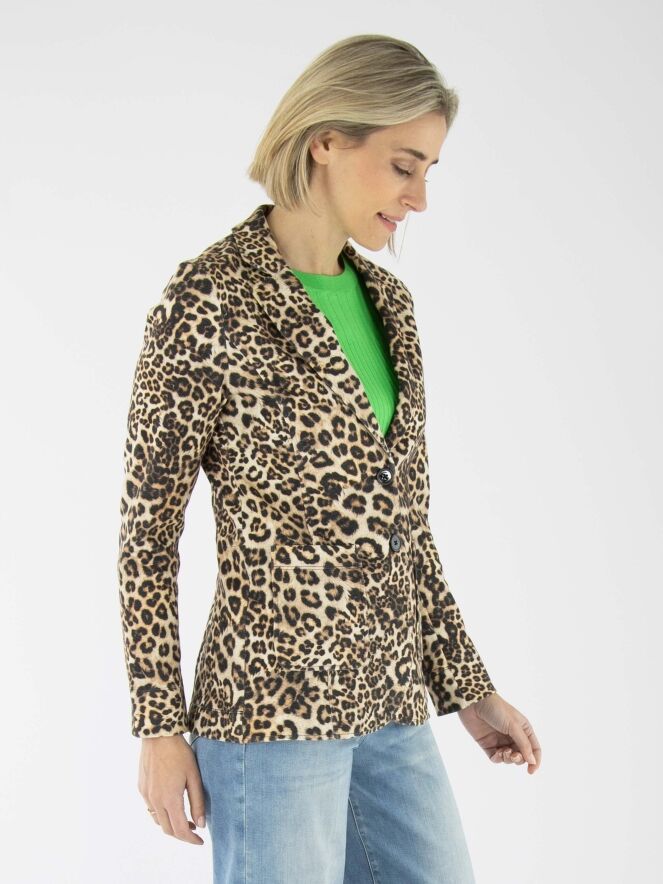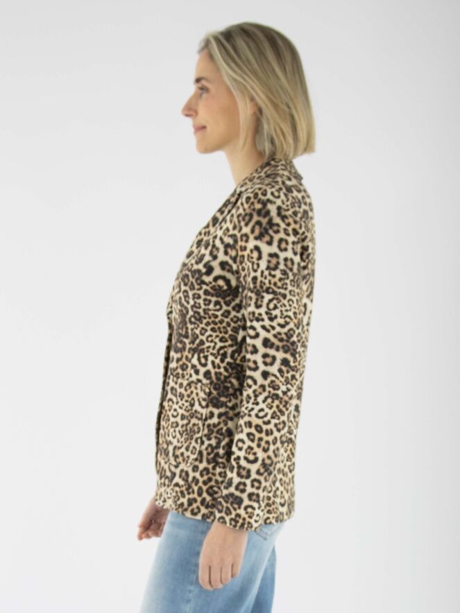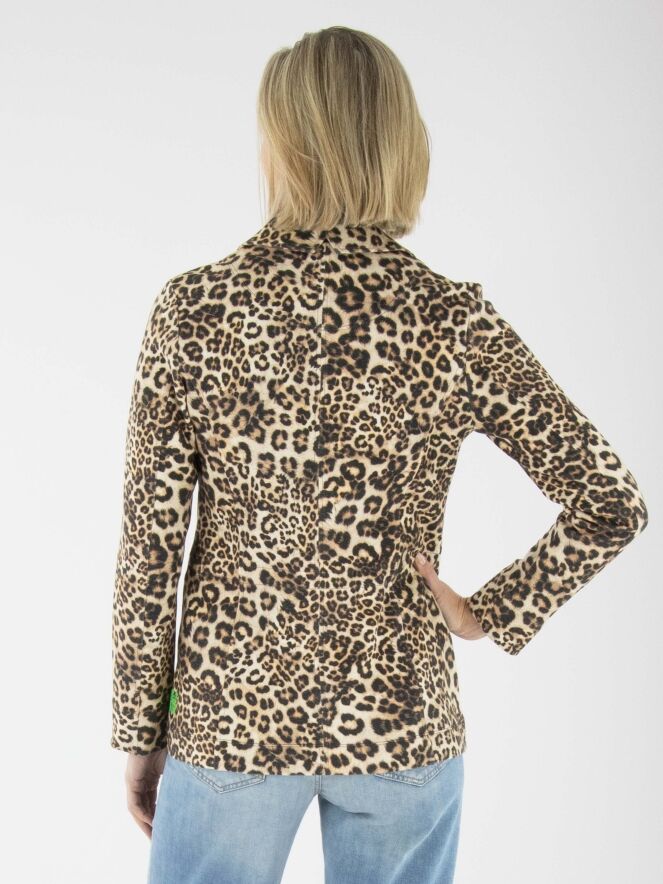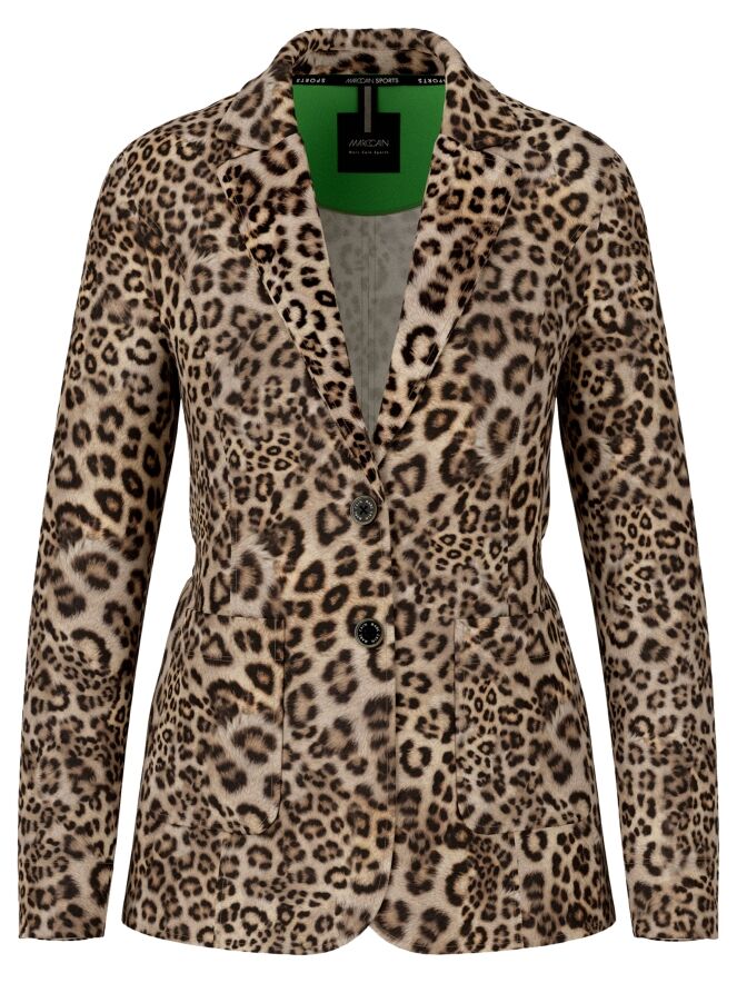 Ein Blazer von Marc Cain mit einem Leopardenmuster in verschiedenen Brauntönen und Schwarz. Der Blazer hat eine Zweiknopf-Verschluss. Auf Taillenhöhe ist am Rücken ein Kordelzug in den Stoff eingearbeitet, der von der Innenseite des Blazers zugänglich ist und ein leicht tailliertes Aussehen ermöglicht. Dieser Blazer kann bei 30 Grad gewaschen werden.