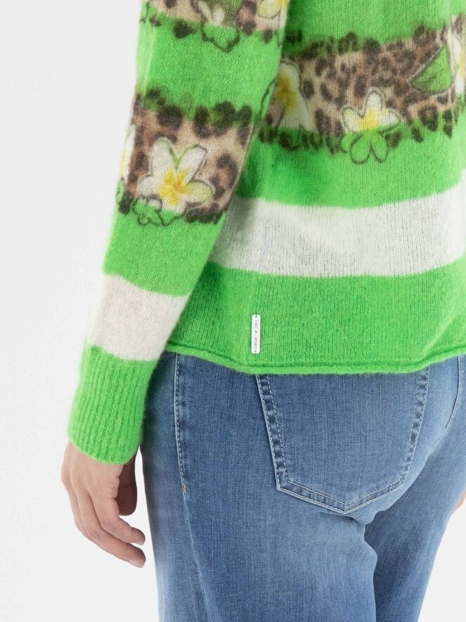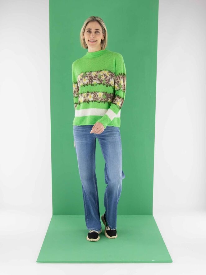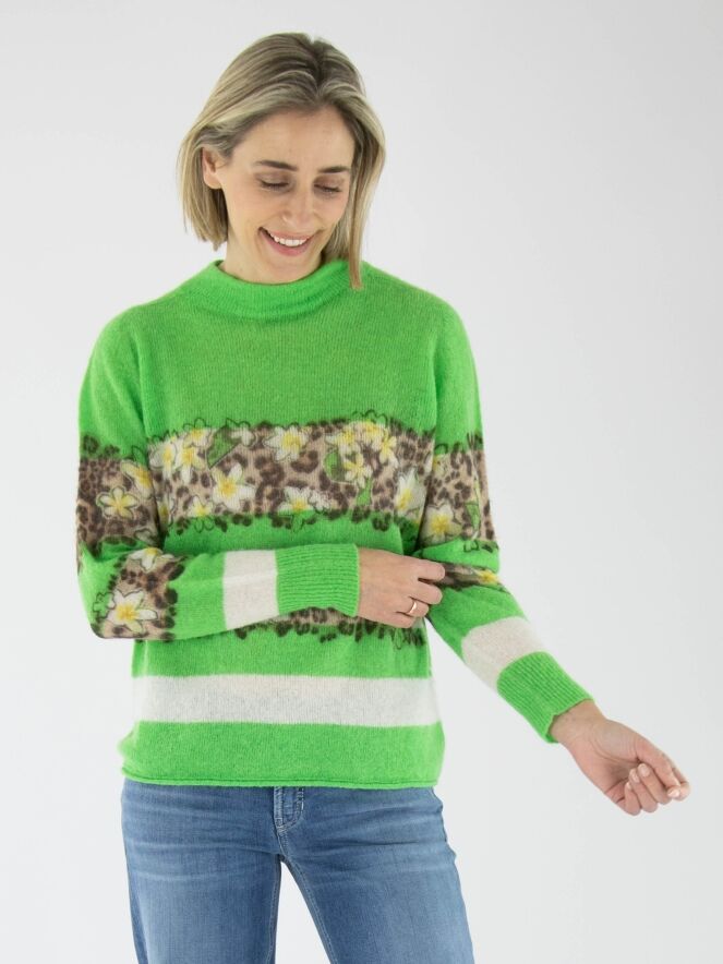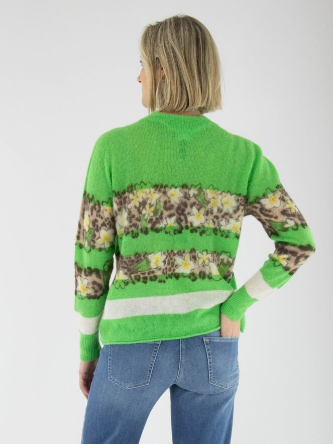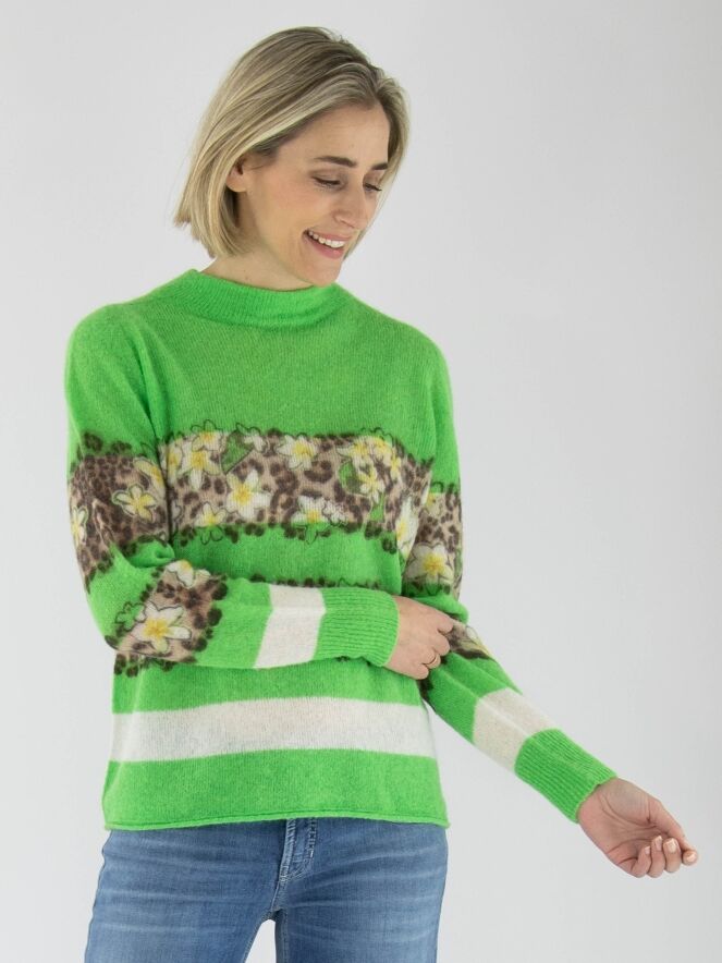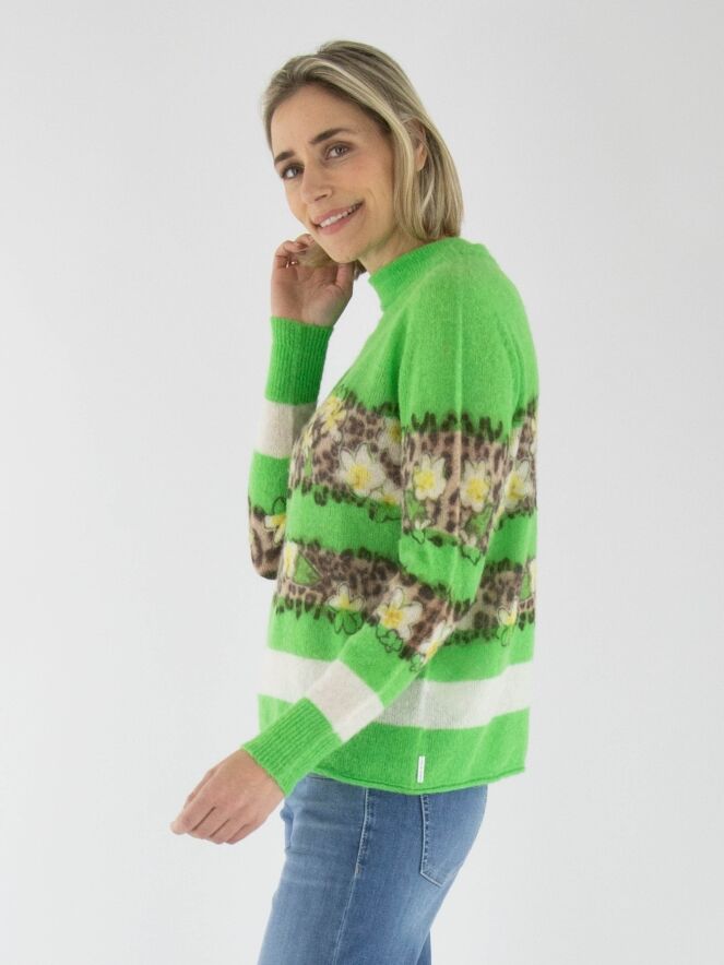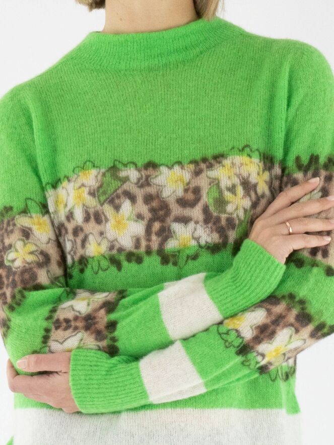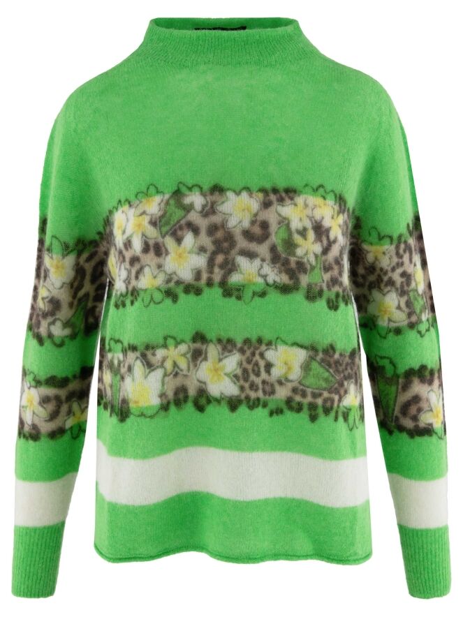 Ein weicher Pullover von Marc Cain in leuchtendem Grün. Der Pullover hat zwei breite Bahnen mit einem Blumenmuster in Cremeweiß und Gelb auf einem Leopardenmuster-Hintergrund. Er hat einen hohen Rundhalsausschnitt und sollte von Hand gewaschen werden.