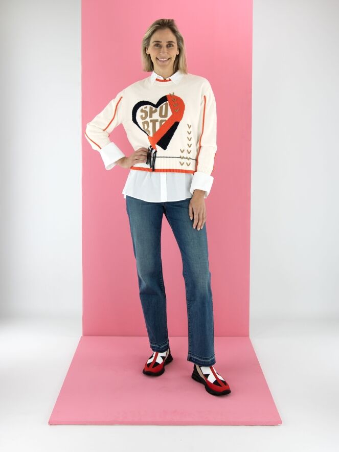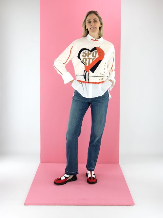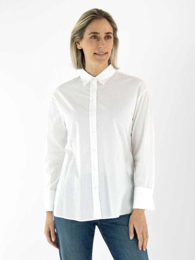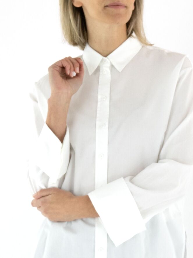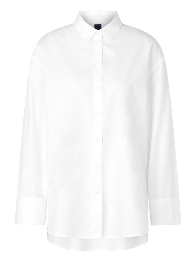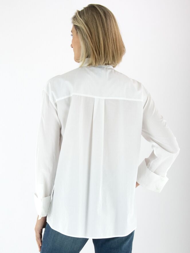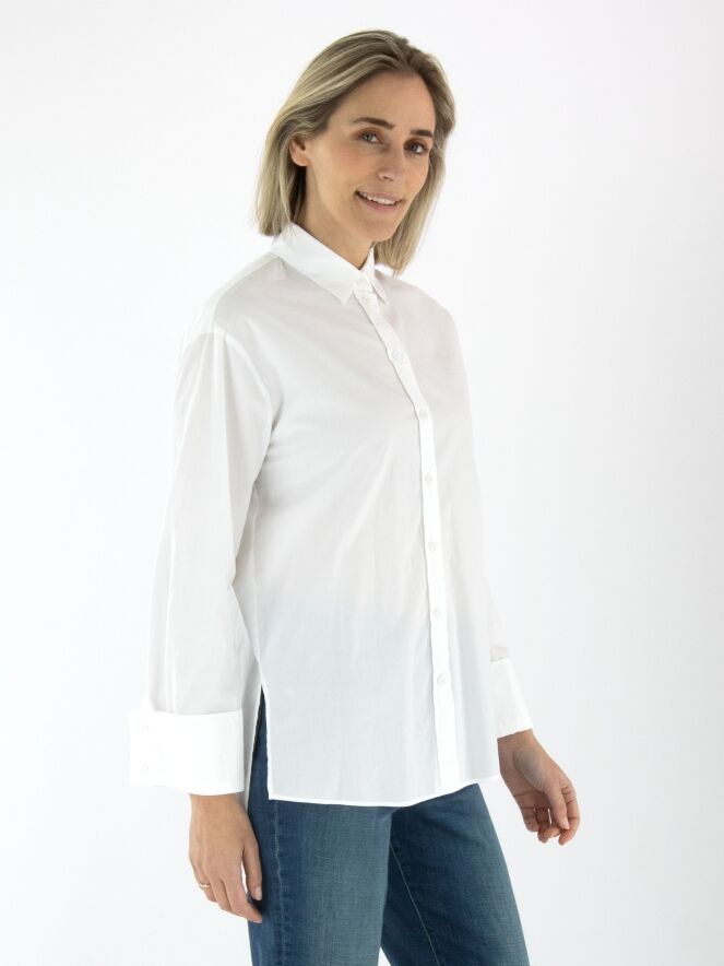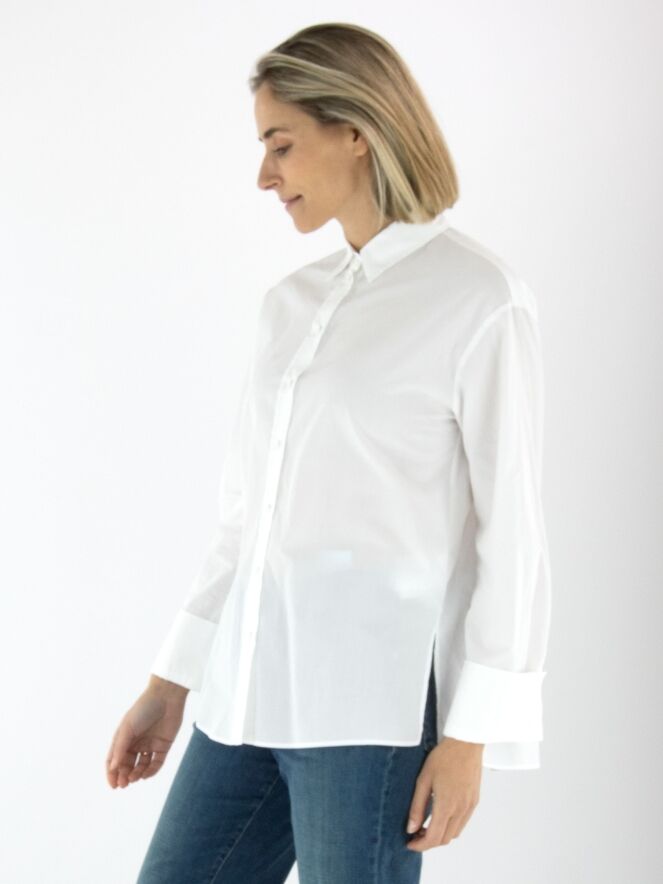 Eine weiße Bluse von Marc Cain. Am unteren Saum befinden sich kurze Schlitze an beiden Seiten. Die Enden der langen Ärmel sind mit breiten Manschetten versehen. Diese Bluse kann bei 30 Grad gewaschen werden.