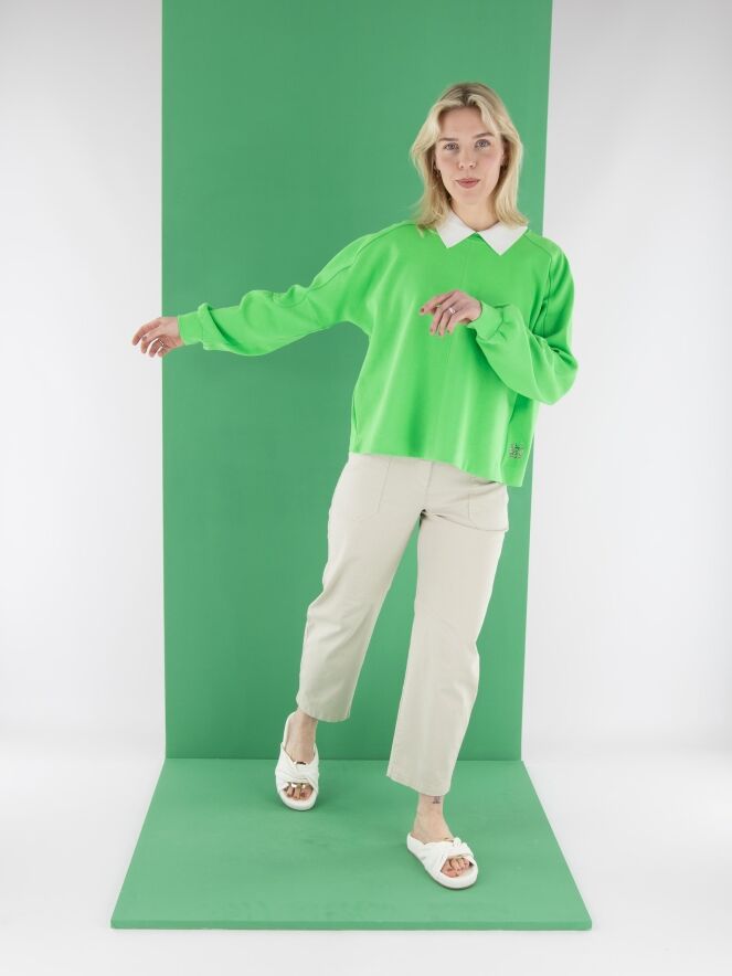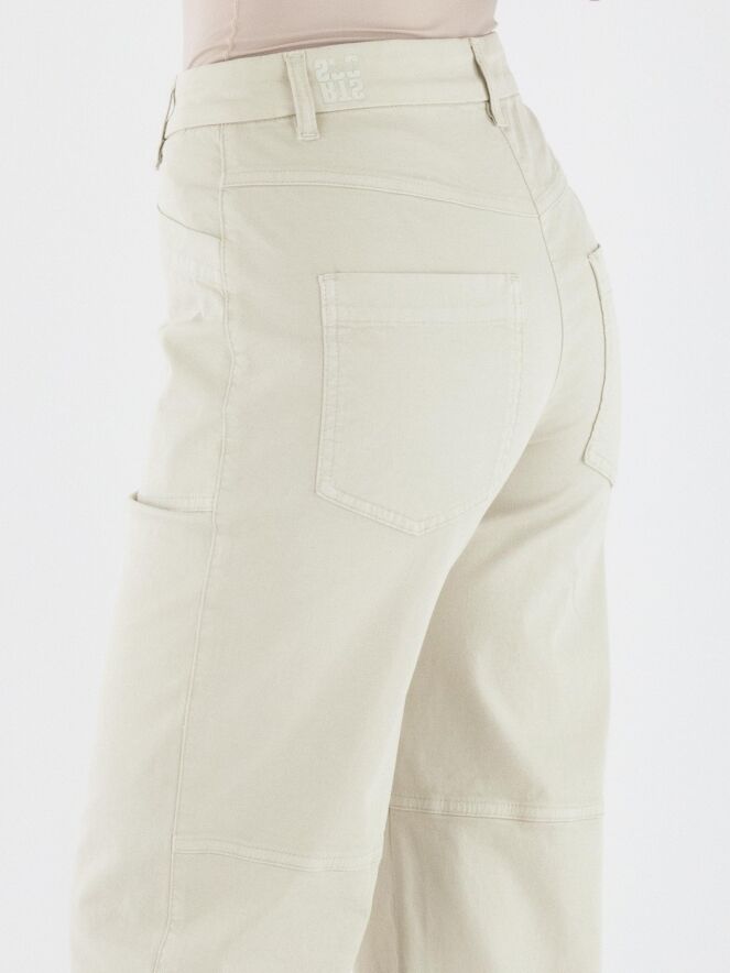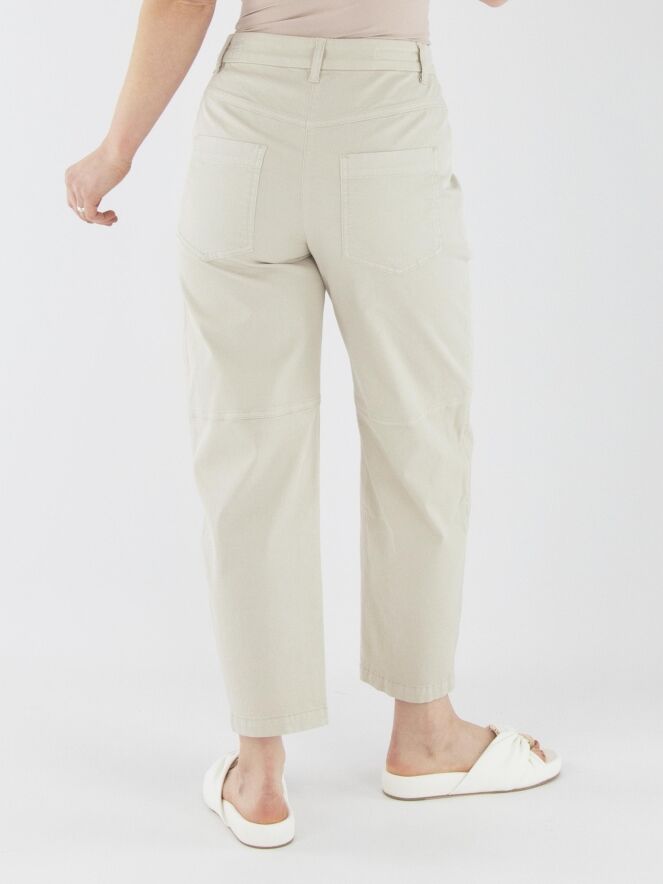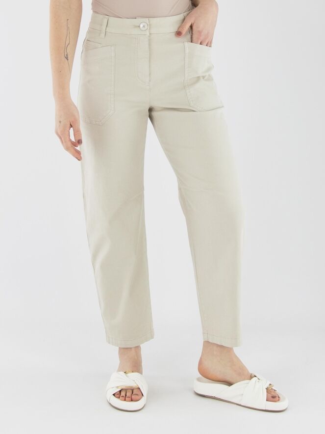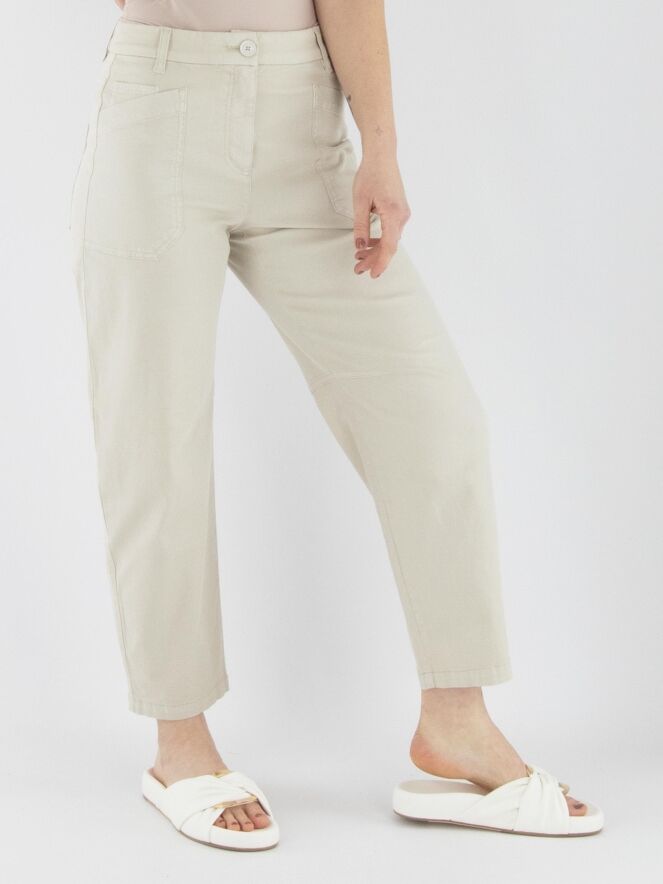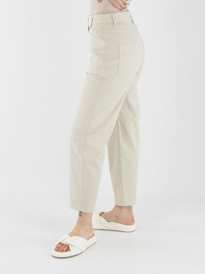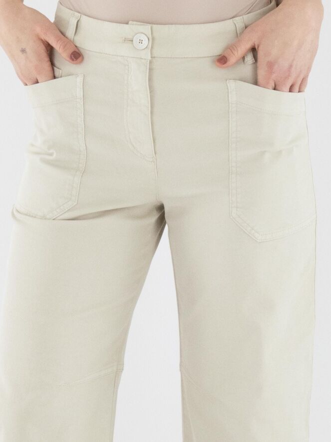 Eine Hose von Marc Cain in Beige. Die Hose hat ein 5-Pocket-Design mit tiefen Taschen an der Vorderseite. Auf Kniehöhe befindet sich auf der Innenseite eine Abnähnaht. Diese Hose kann bei 30 Grad gewaschen werden.