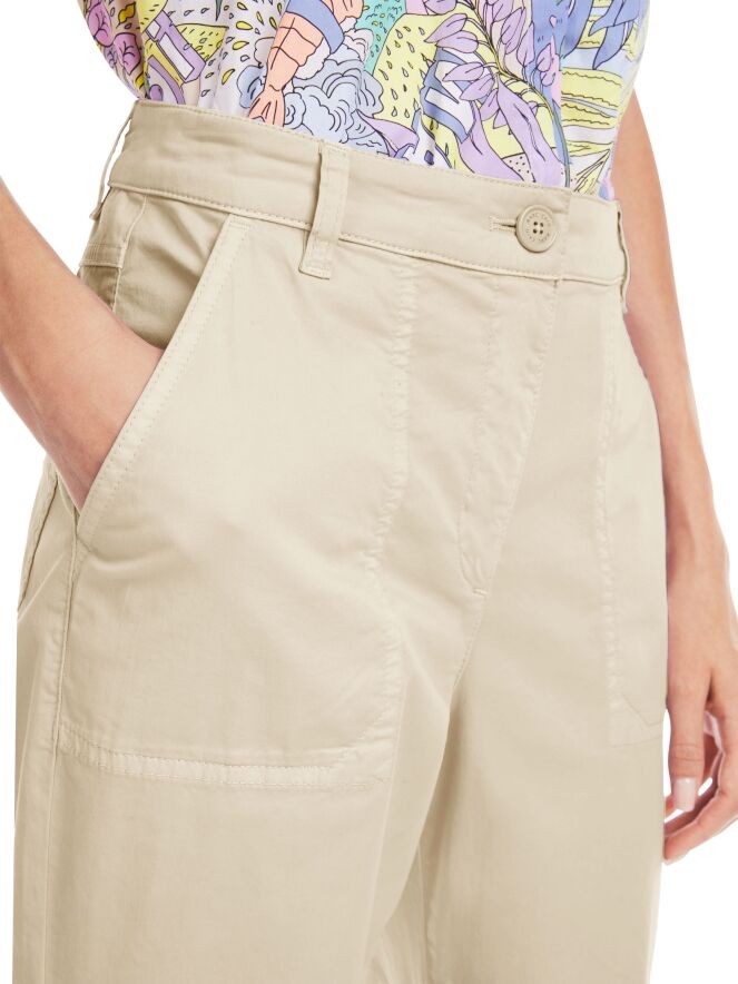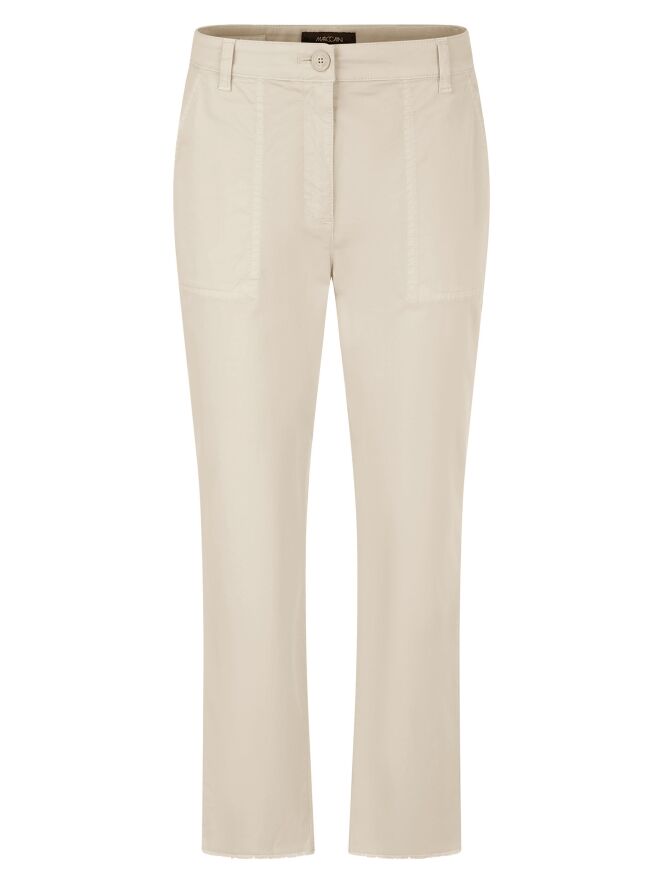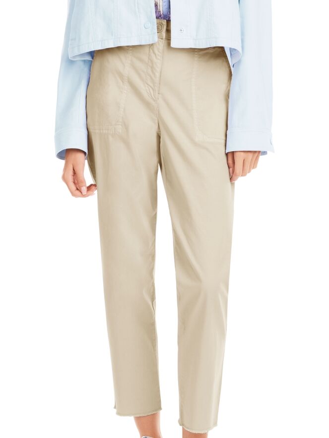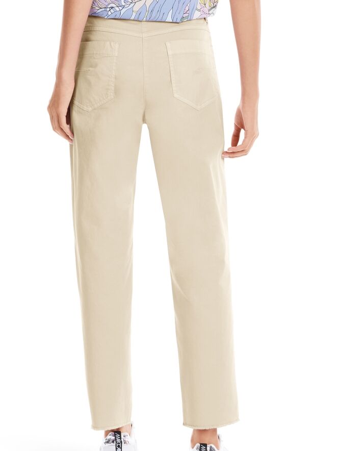 Eine Hose von Marc Cain in Sandfarbe. Die Hose hat Seitentaschen, deren Kanten mit Ziernähten versehen sind. Die Saumkanten der Hosenbeine sind dezent ausgefranst. Diese Hose kann bei 30 Grad gewaschen werden.