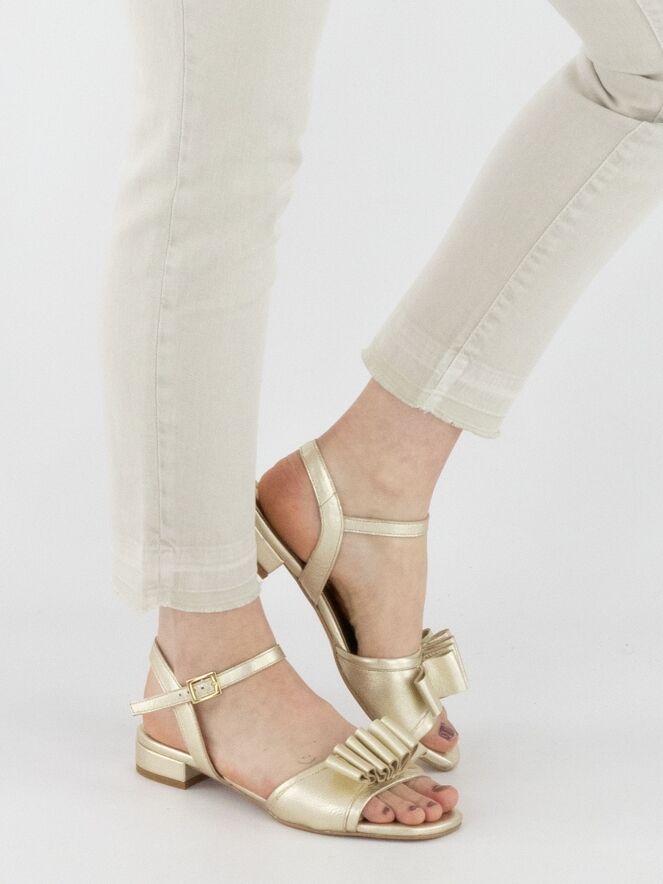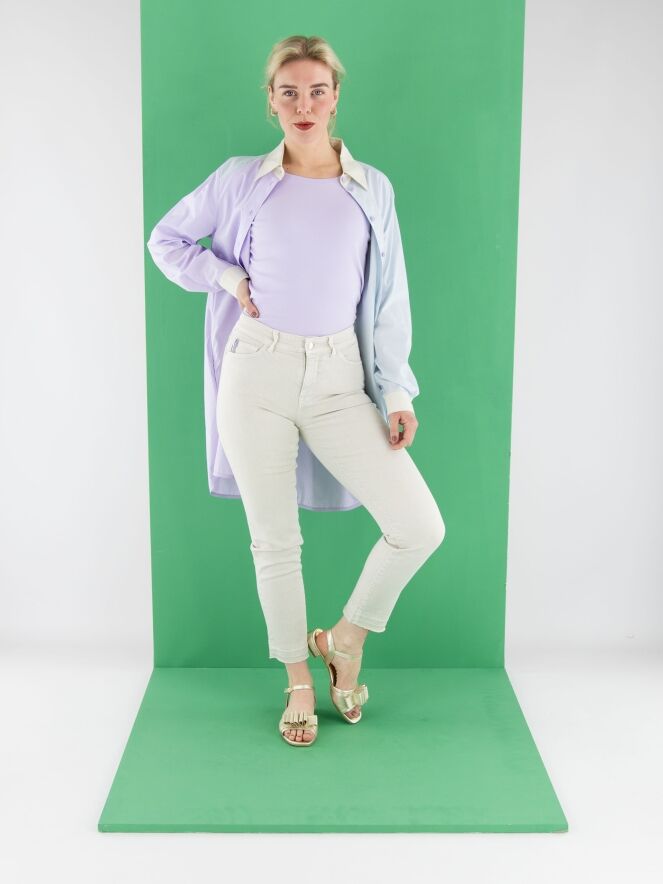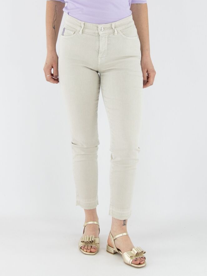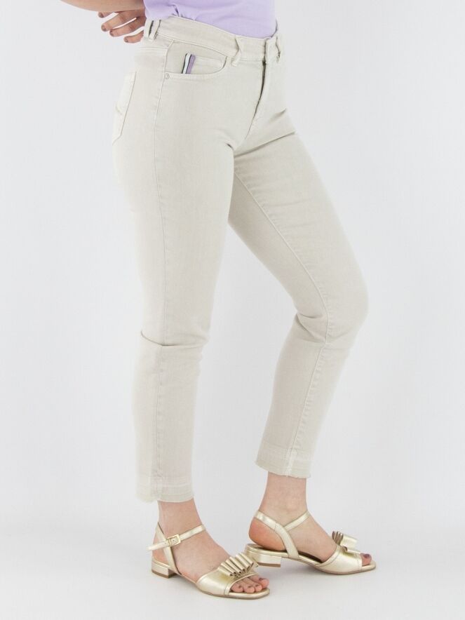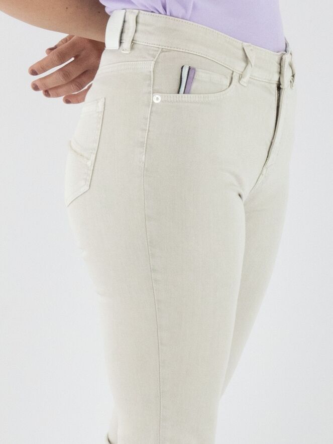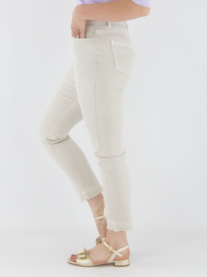 Eine Jeans von Marc Cain in Sandfarbe. Die Jeans hat ein 5-Pocket-Design, und die Säume sind dezent ausgefranst. Diese Jeans kann bei 30 Grad gewaschen werden.