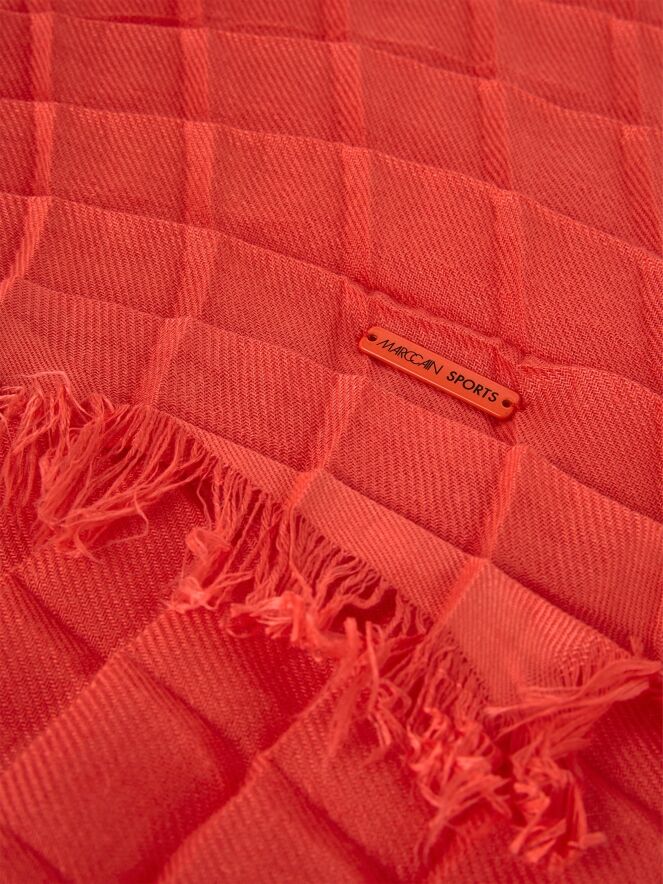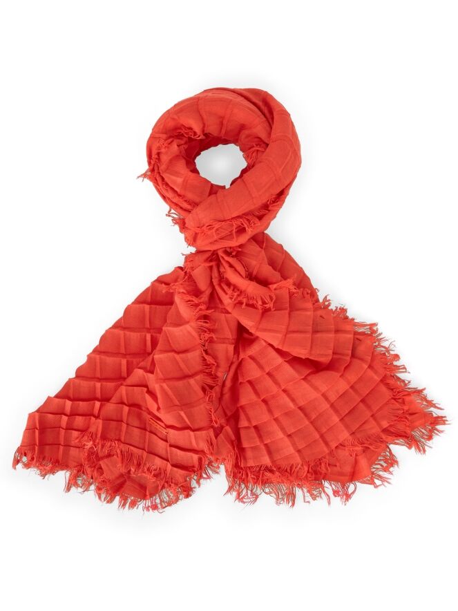 Ein Schal von Marc Cain in frischem Rot. Der Schal ist in einer Waffelstruktur gewebt und hat fein ausgefranste Kanten. Dieser Schal sollte von Hand gewaschen werden.