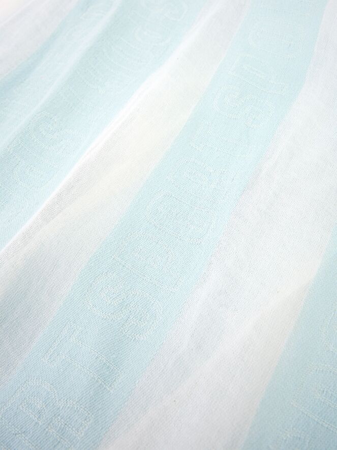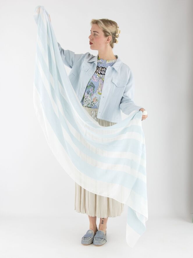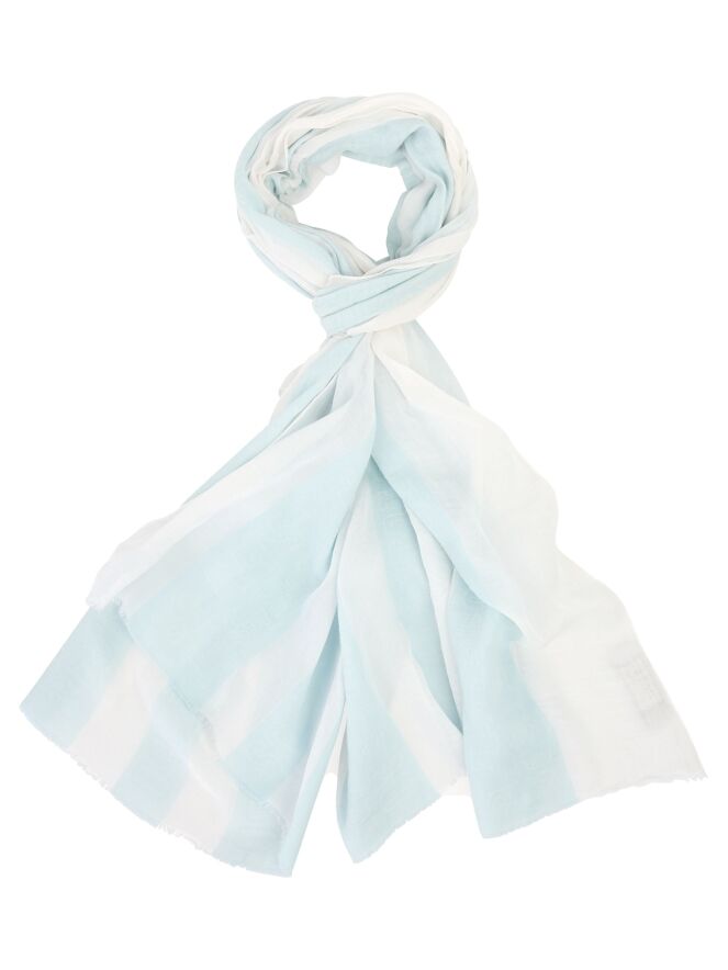 Ein leicht transparente Schal von Marc Cain mit einem Streifenmuster in Pastellblau und Weiß. Die Enden des Schals sind dezent ausgefranst. Dieser Schal sollte per Hand gewaschen werden.