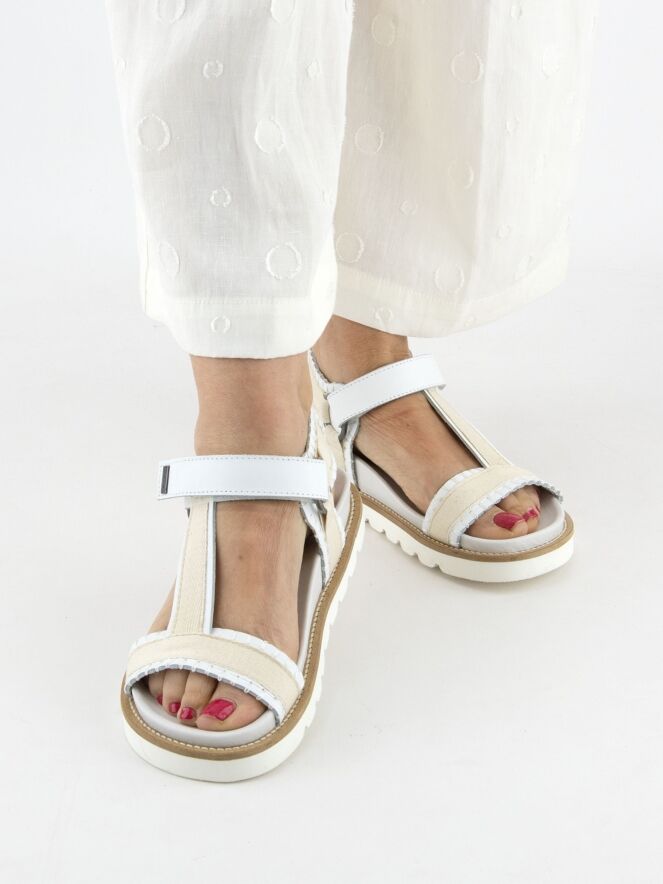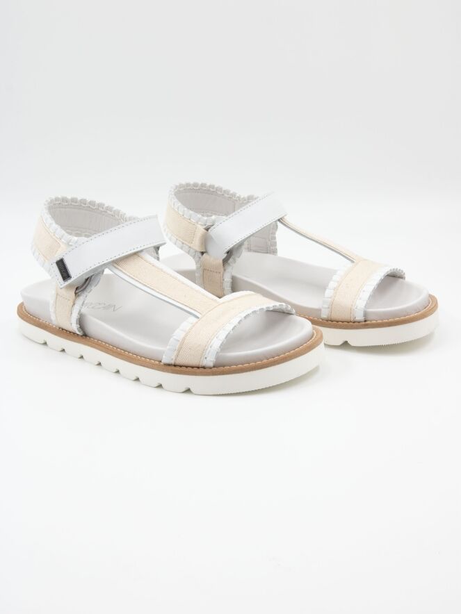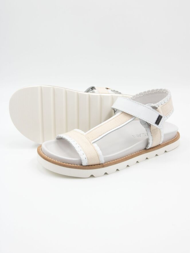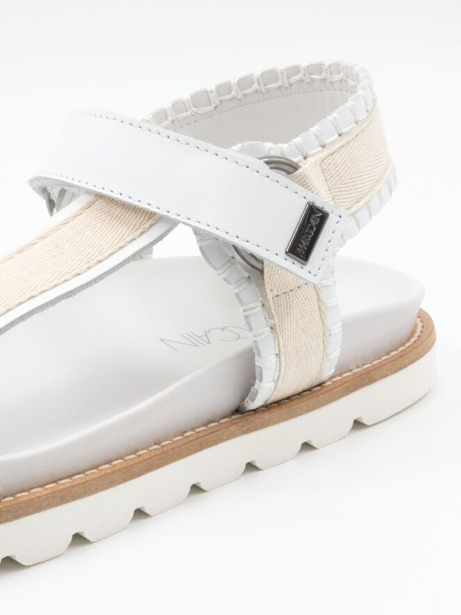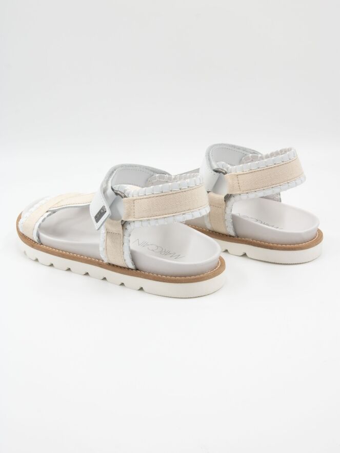 Eine Sandale von Marc Cain in der Farbe Cremeweiß. Zwei Riemen verlaufen über den Vorfuß, mit einem dekorativen, asymmetrischen Riemen über dem Spann. Entlang des Riemens befindet sich eine dekorative weiße Naht. Sohle und Fußbett sind in Weiß gehalten. Die Sandale hat einen Klettverschluss.