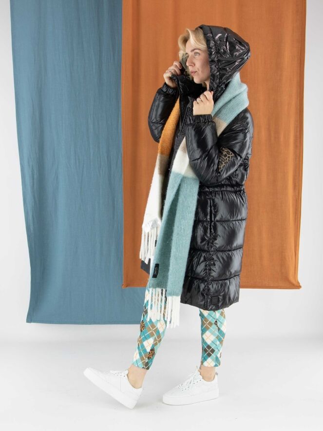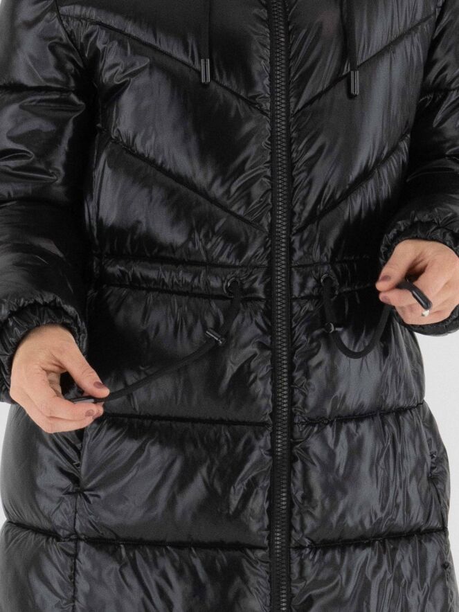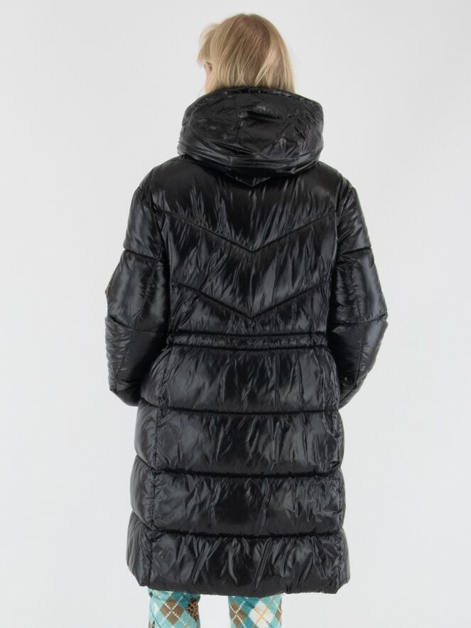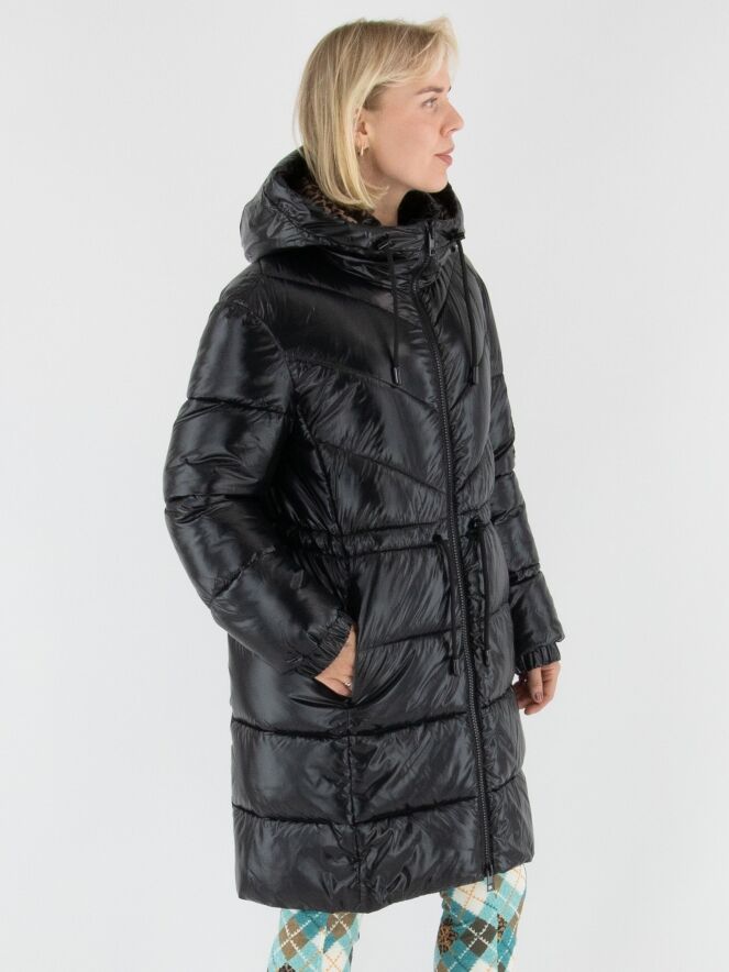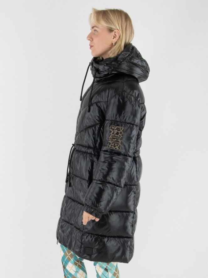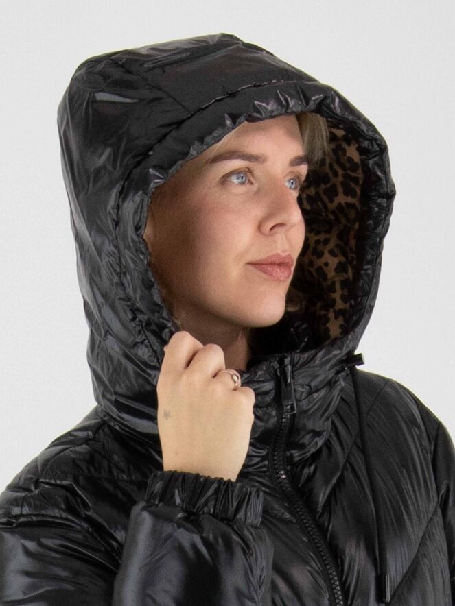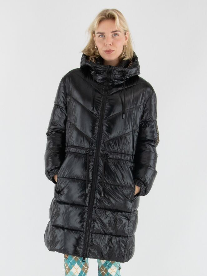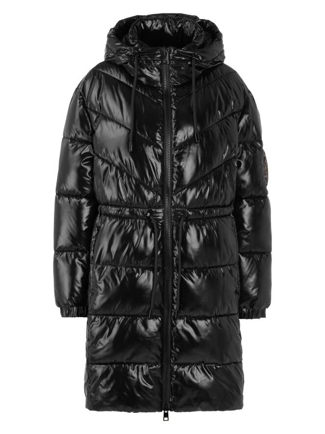 Ein stilvoller langer gesteppter Mantel von Marc Cain in Schwarz mit glänzender Lackoptik. Die Kapuze ist mit einem Futter im Leo-Print versehen, was dem Mantel eine verspielte Note verleiht. Die Eingrifftaschen auf Taillenhöhe sind mit Reißverschlüssen ausgestattet. Sowohl am Rand der Kapuze als auch an der Taille verläuft ein Tunnelzugband, das für die perfekte Passform reguliert werden kann. Der Mantel wird mit einem Reißverschluss geschlossen und kann bei 30 Grad gewaschen werden.