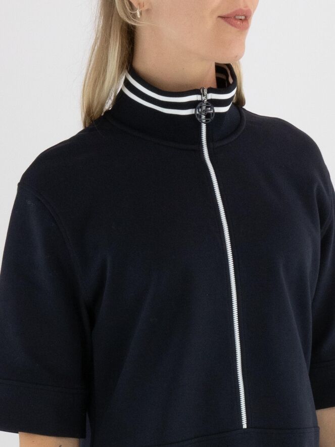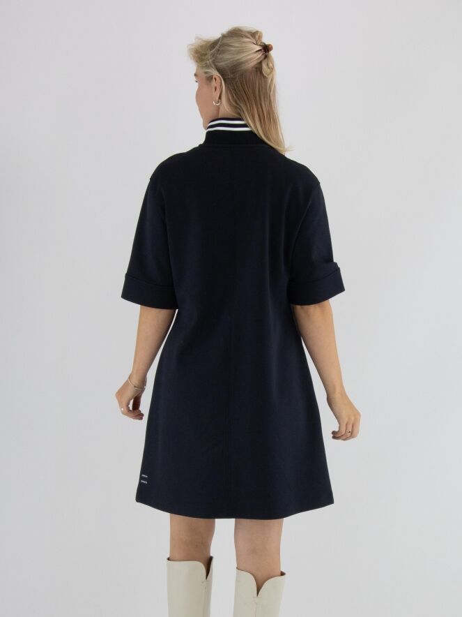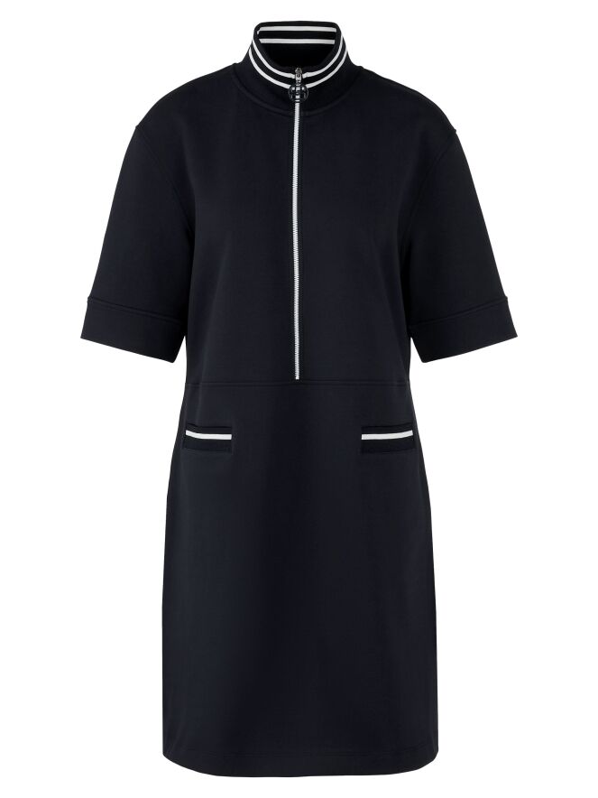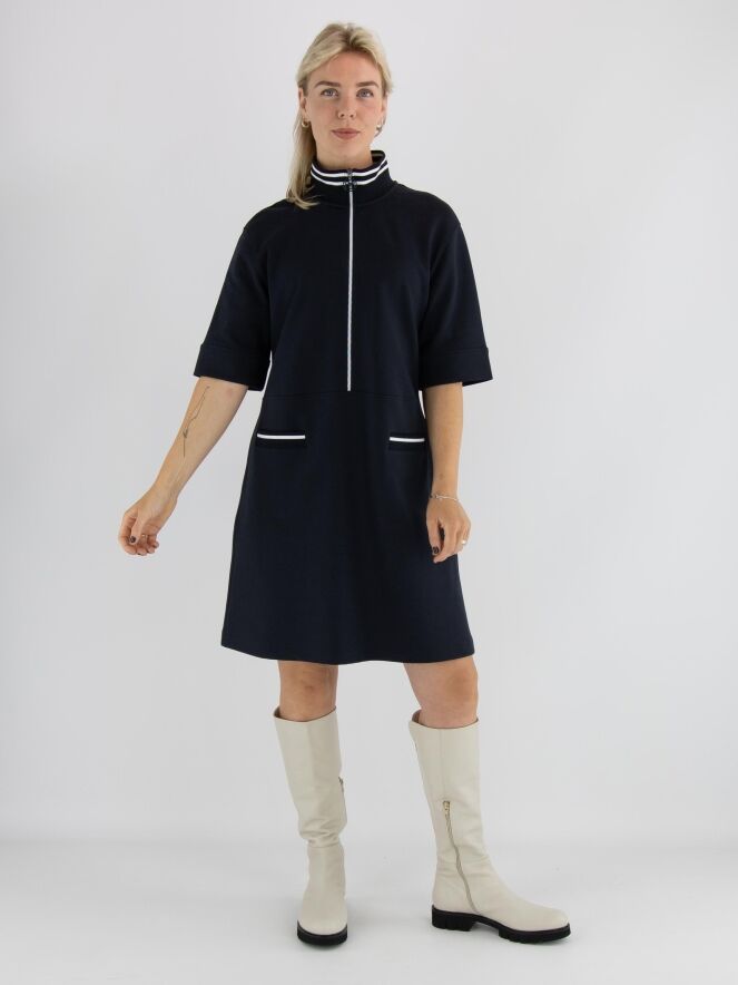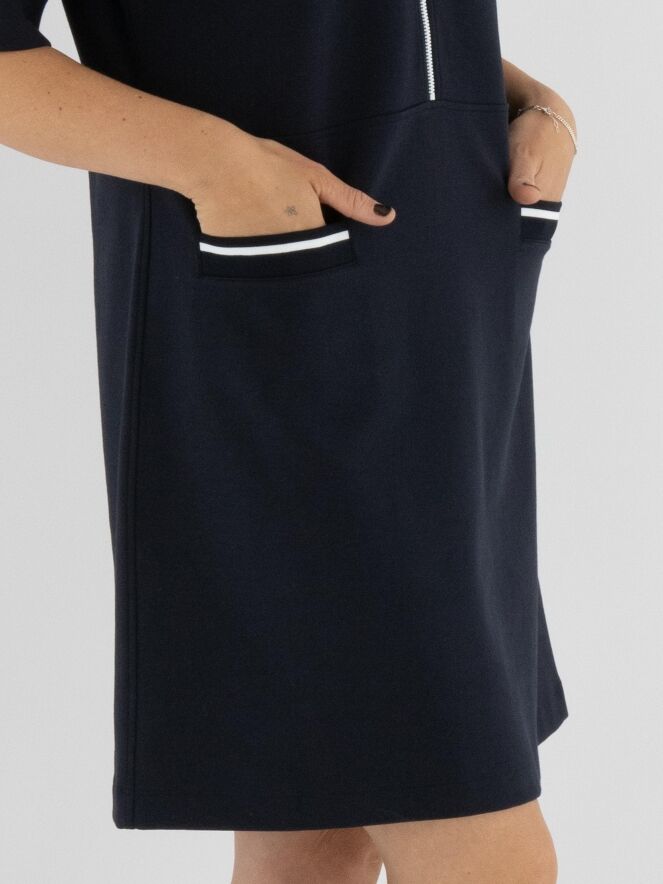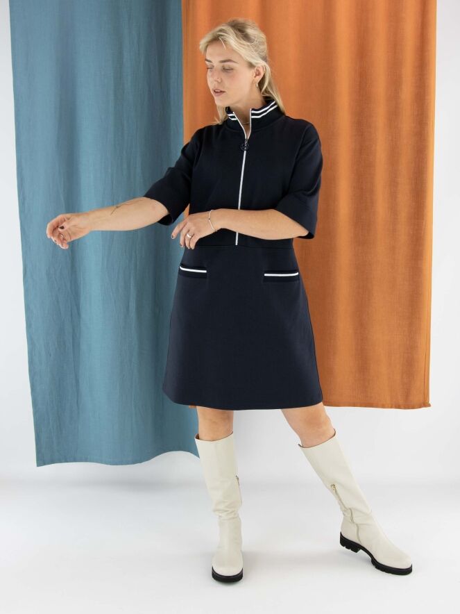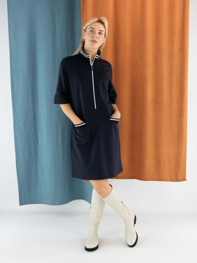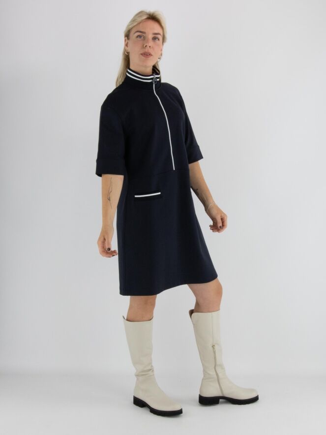 Kleid von Marc Cain in Marineblau. Am Rand des hohen Rundhalsausschnitts befindet sich ein breiter, fein gerippter Strickbund. Ein weißer Reißverschluss verläuft von der Mitte des Halsausschnitts bis zur Taille. Unterhalb der Taille befinden sich zwei kleine Taschen. Das Kleid hat eine leicht ausgestellte A-Linie und kann bei 30 Grad gewaschen werden.