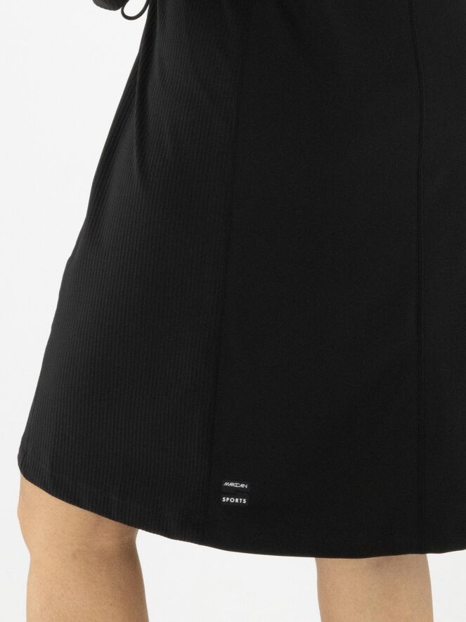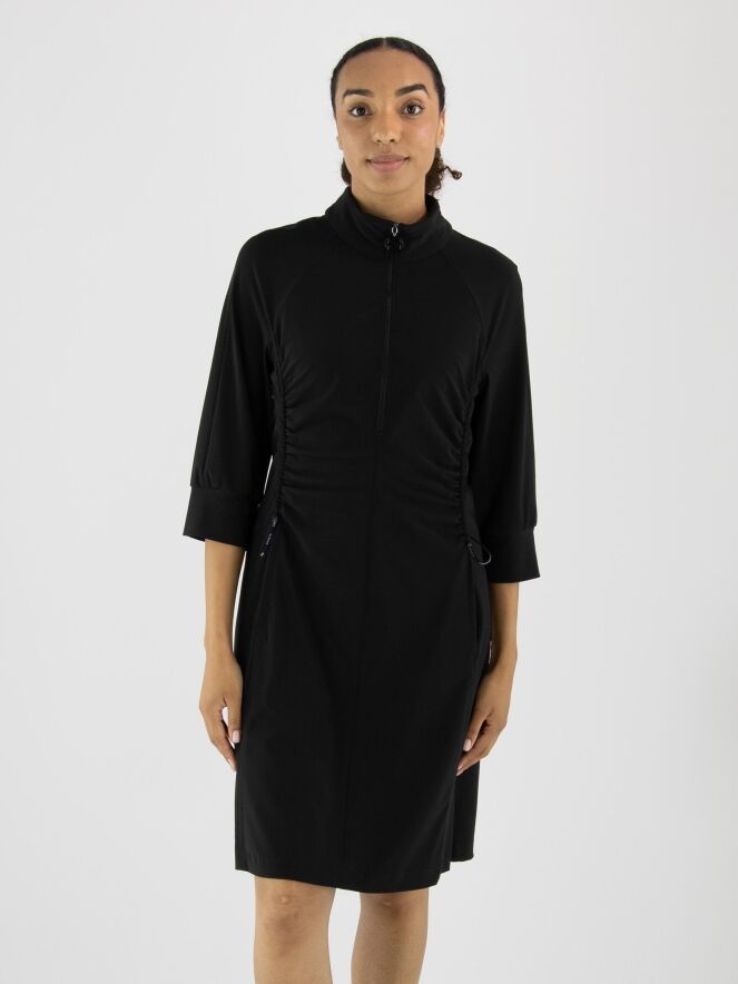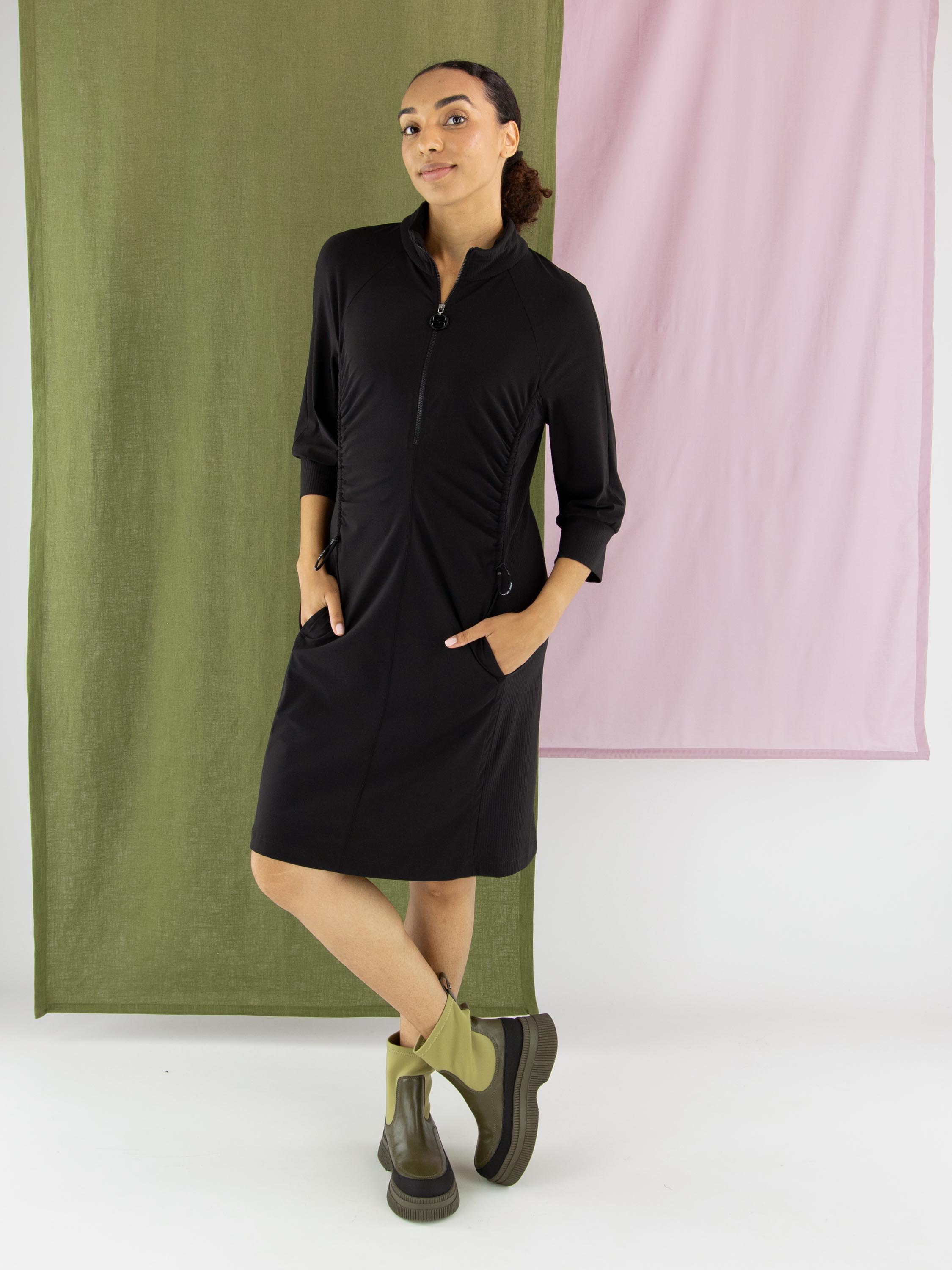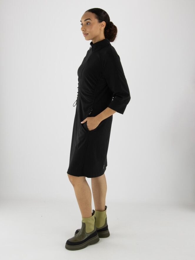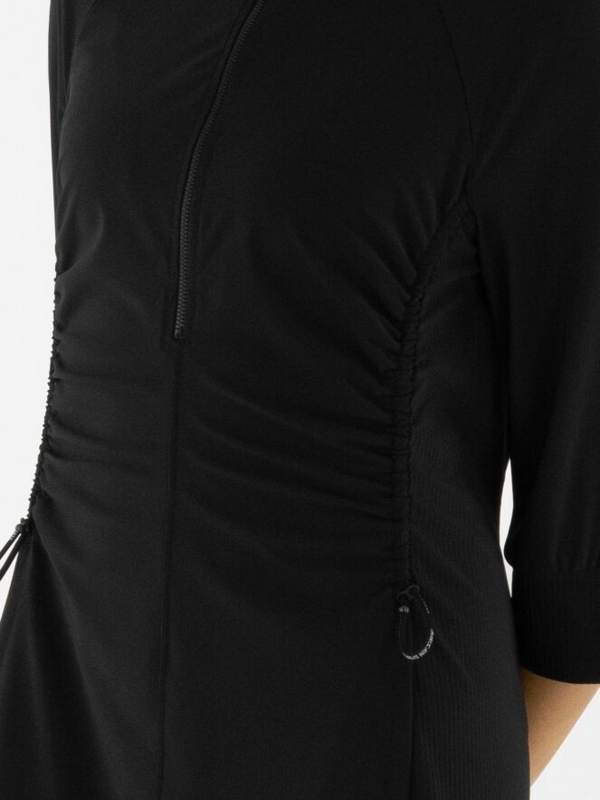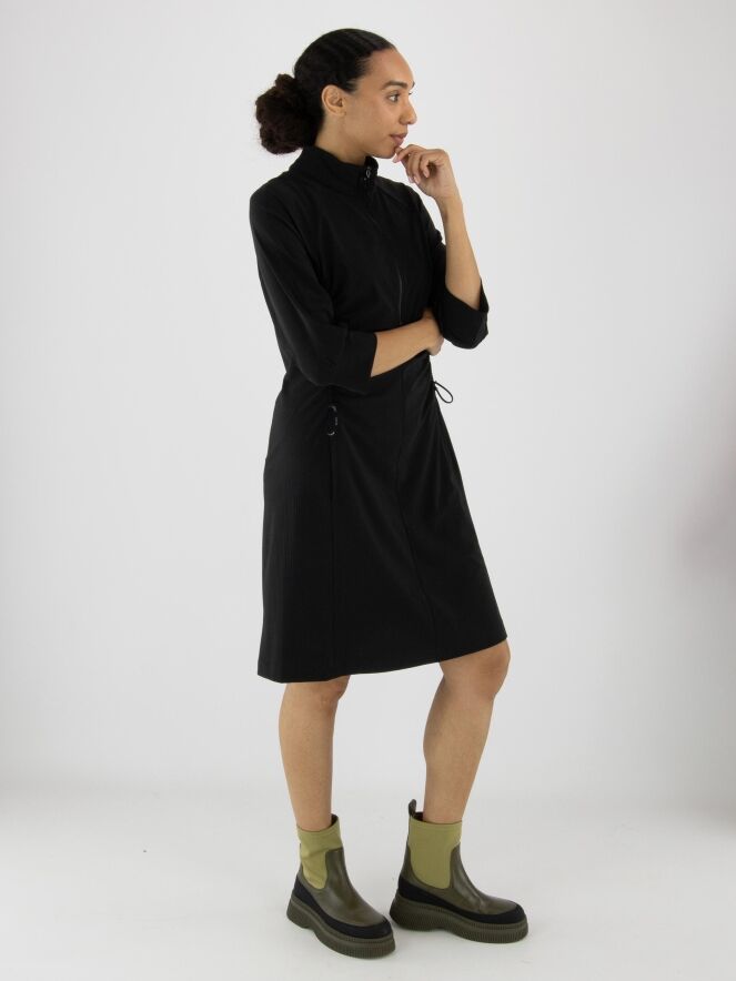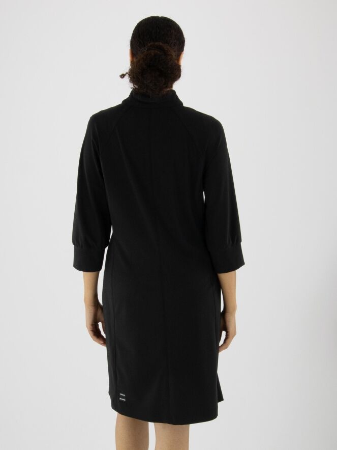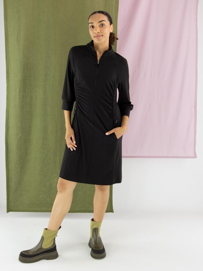 Ein Kleid von Marc Cain in Schwarz. Der hohe Halsausschnitt ist mit einem fein gerippten Bündchen versehen, ein Detail, das sich an den Enden der halblangen Ärmel wiederholt. Ein Reißverschluss verläuft vom Halsausschnitt bis knapp oberhalb der Taille. Von der unteren Ärmeleinsatznaht bis zur Taille verläuft ein Tunnelzug mit Kordel, der einen Falteneffekt erzeugen kann. Der Stoff an den Seiten ist fein gerippt. Dieses Kleid kann bei 30 Grad gewaschen werden.