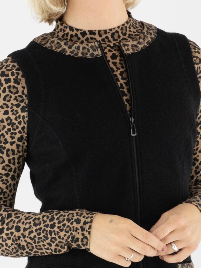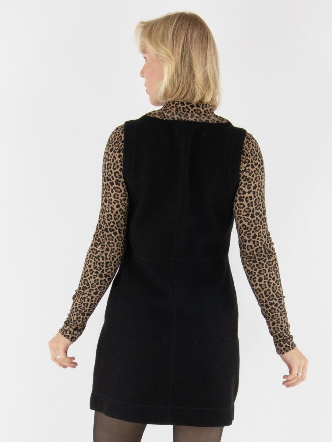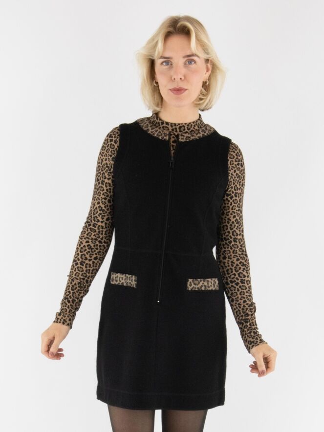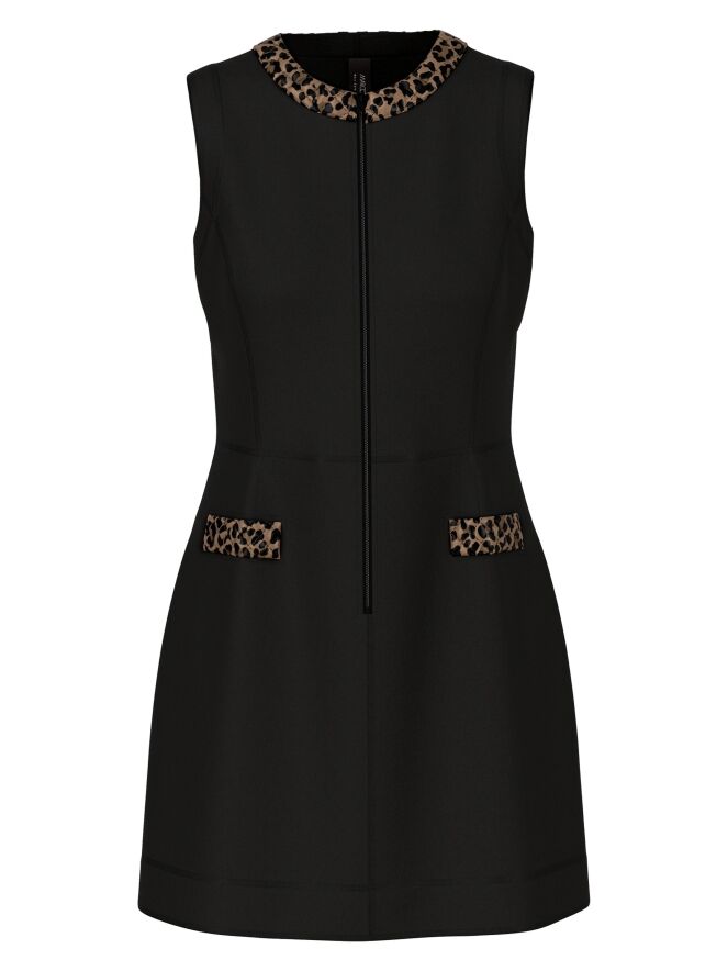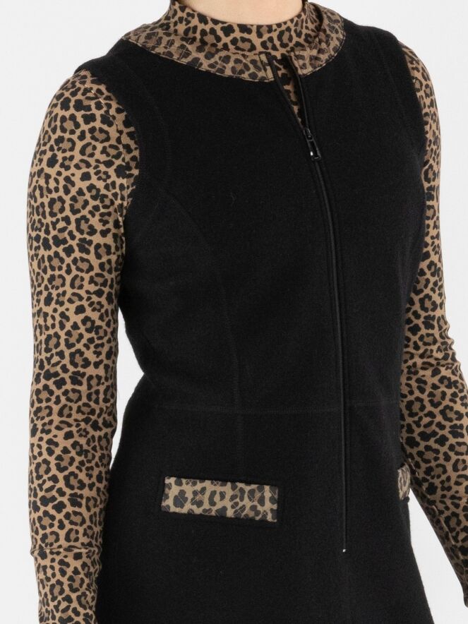 Ein elegantes Kleid von Marc Cain aus gekochter Wolle in Schwarz. Am Rand des runden Ausschnitts verläuft eine gesteppte Biese im Leo-Print mit Braun- und Schwarztönen. Dieses Detail wiederholt sich an den Taschenrändern auf der Vorderseite und sorgt für ein stimmiges Gesamtbild. Ein Reißverschluss verläuft vom Halsausschnitt bis unter die Taille. Dieses Kleid darf nicht gewaschen werden.