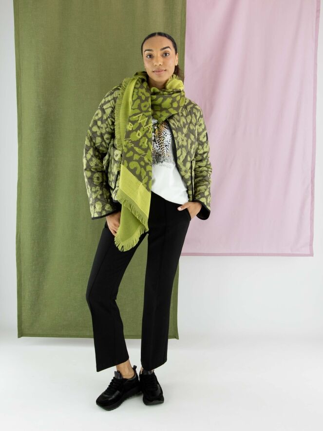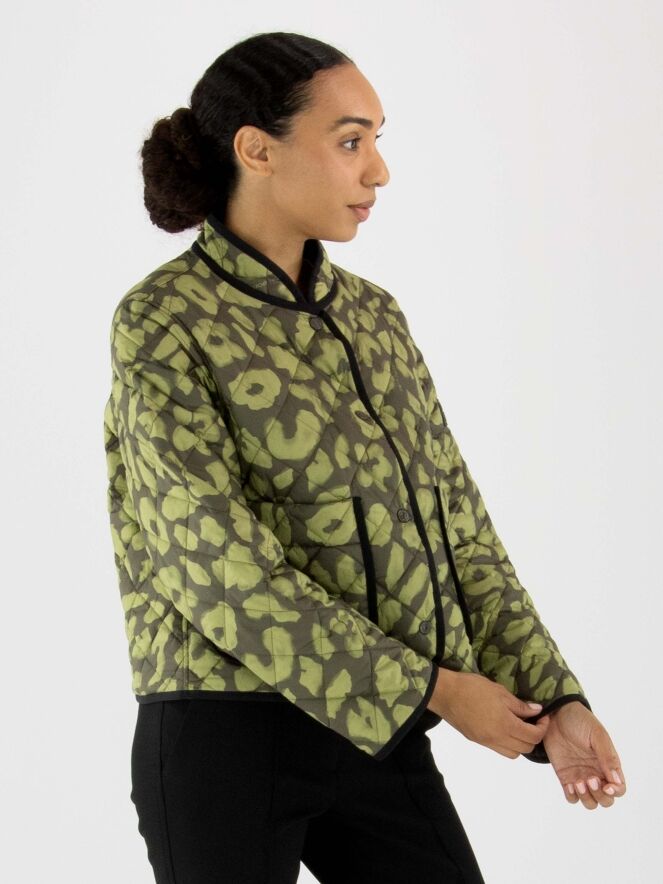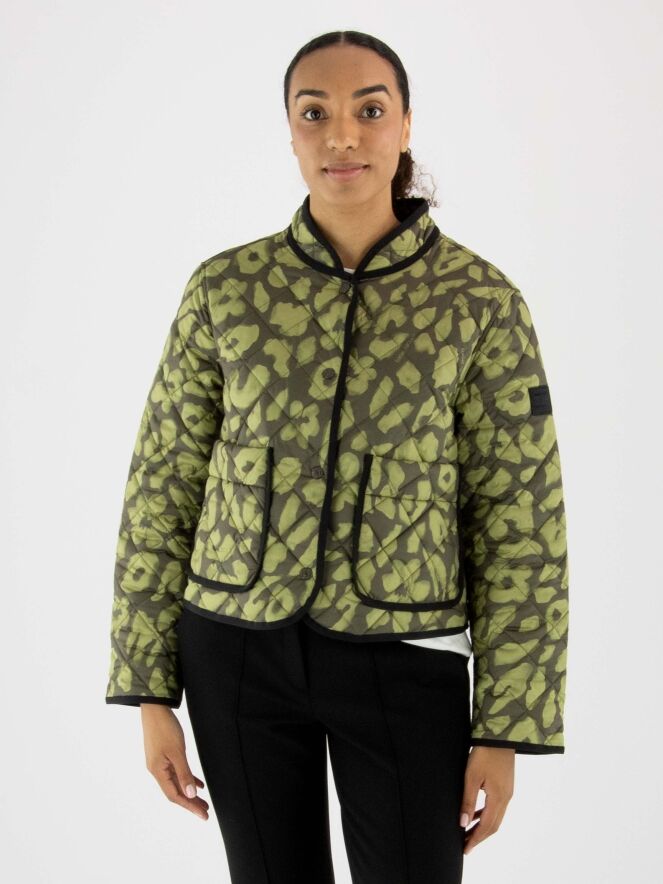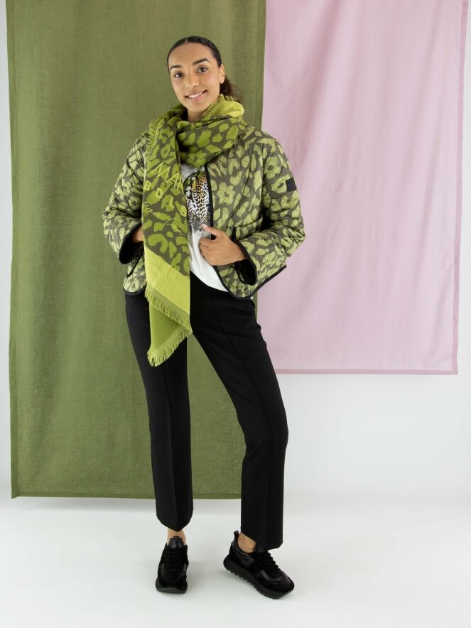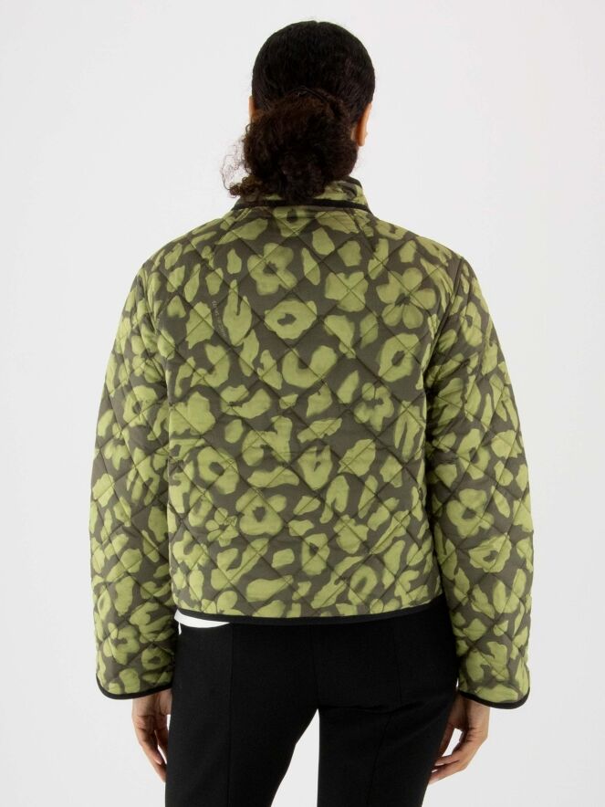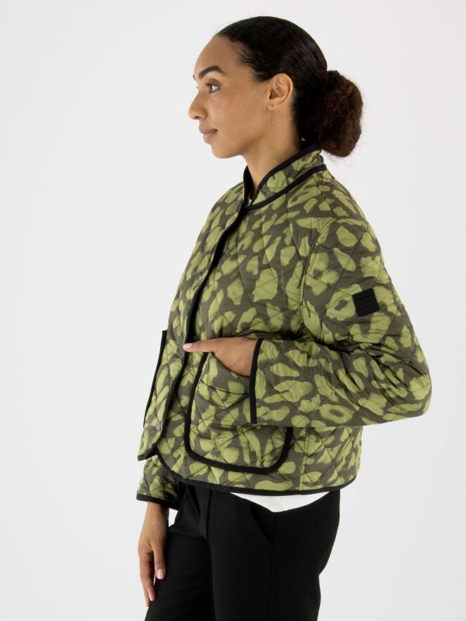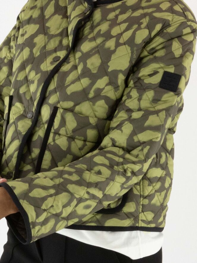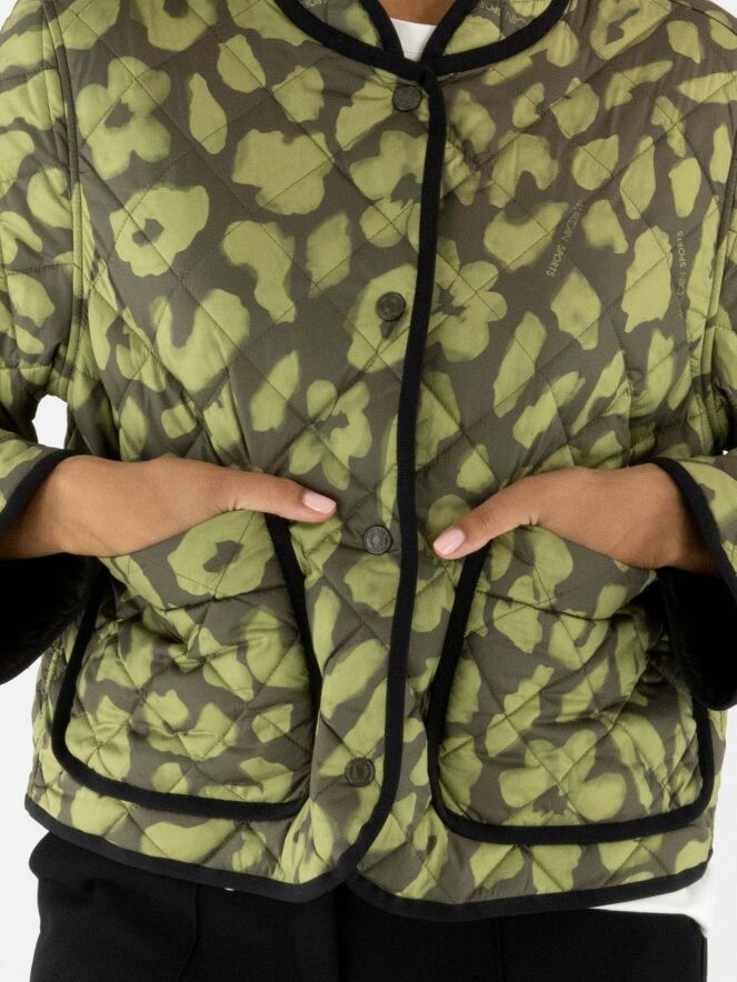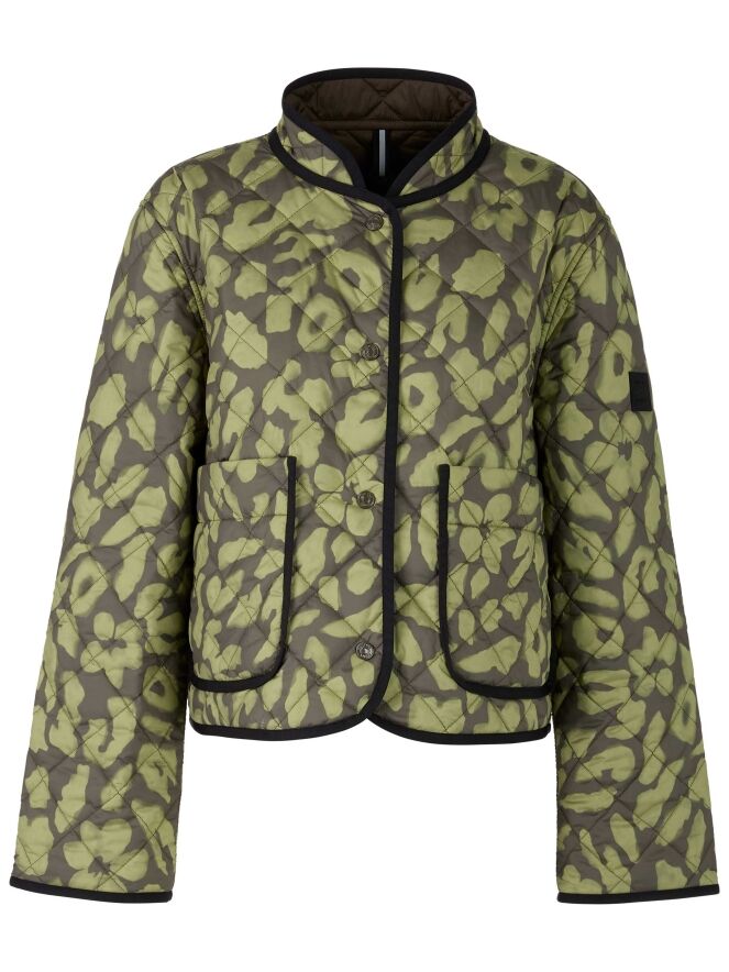 Gestepperter, wendbarer Mantel von Marc Cain mit einem Print in Pistaziengrün und Olivgrün. Ein schwarzes Band verläuft entlang des Kragens und Halsausschnitts und setzt sich entlang der Druckknopfleiste fort. Die Wendeseite ist in uni Olivgrün gehalten. Dieser Mantel kann bei 30 Grad gewaschen werden.