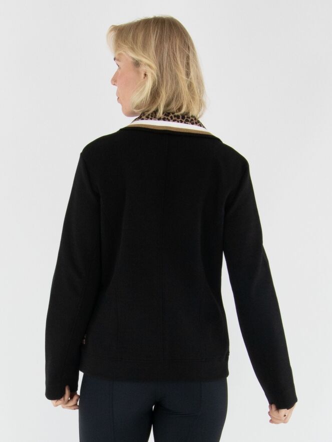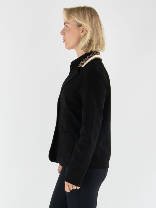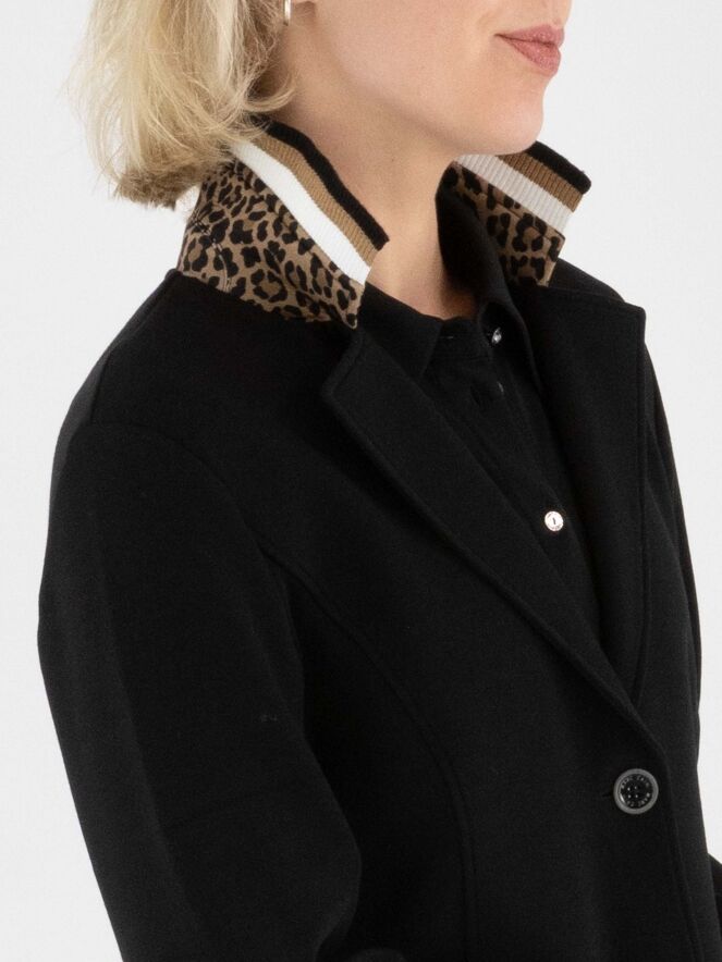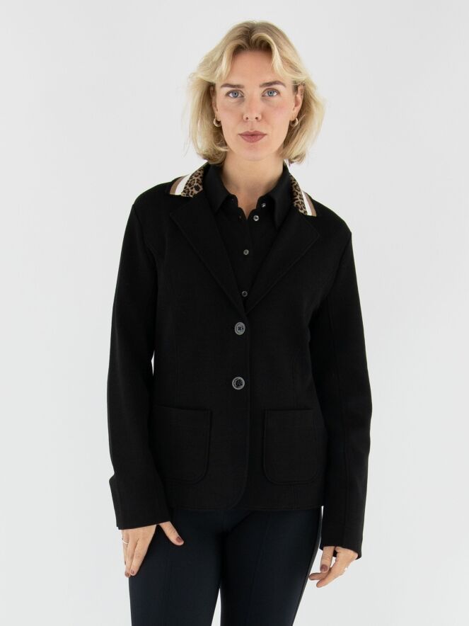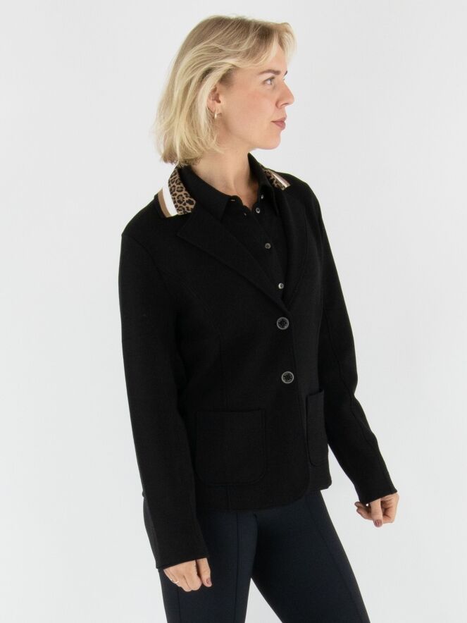 Ein Blazer von Marc Cain in Schwarz. Der Kragen ist mit feinem Rippjersey in einem Streifenmuster aus Cremeweiß, Schwarz und Camel gearbeitet und zusätzlich mit einer Leo-Print-Kante versehen, die einen stilvollen Kontrast schafft. Der Blazer wird mit zwei Knöpfen geschlossen und ist ungefüttert, was ihn leicht und angenehm zu tragen macht. Dieser Blazer kann bei 30 Grad gewaschen werden.